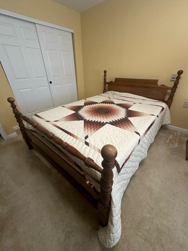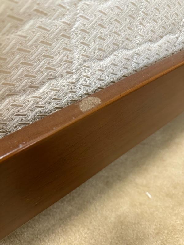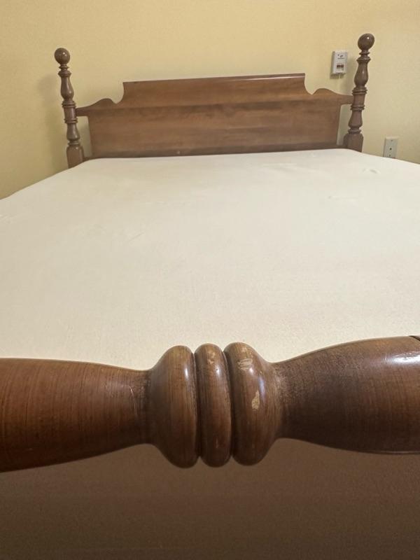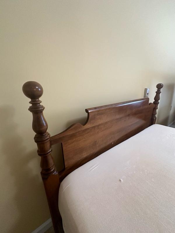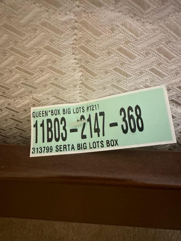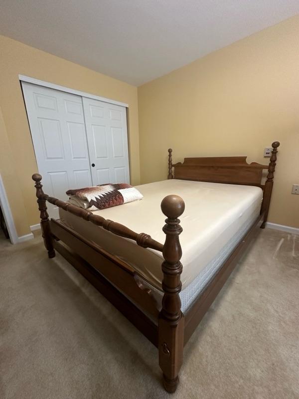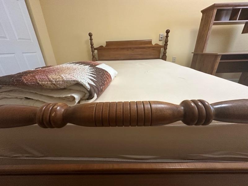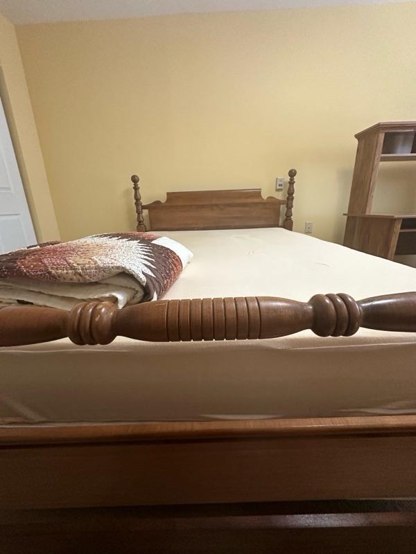 Queen Bed Frame, Mattress, Mattress Box and Blanket in fair condition. Mattress material is undetermined. There are a few stains on the mattress. Please examine photos closely.