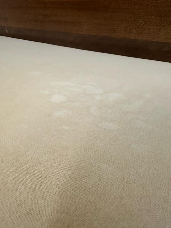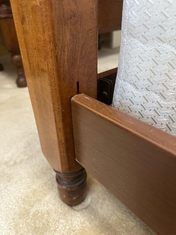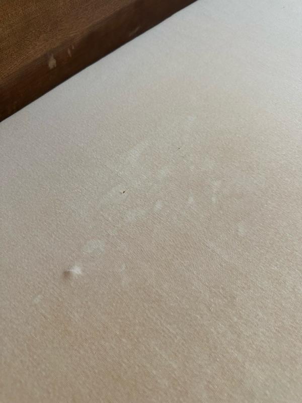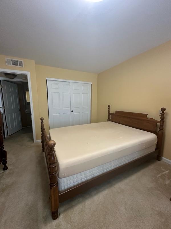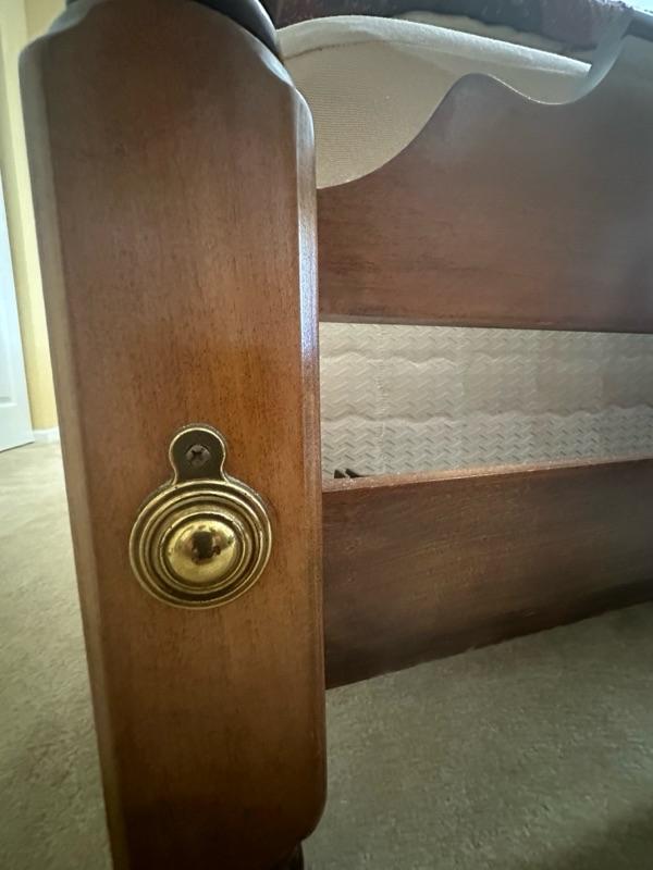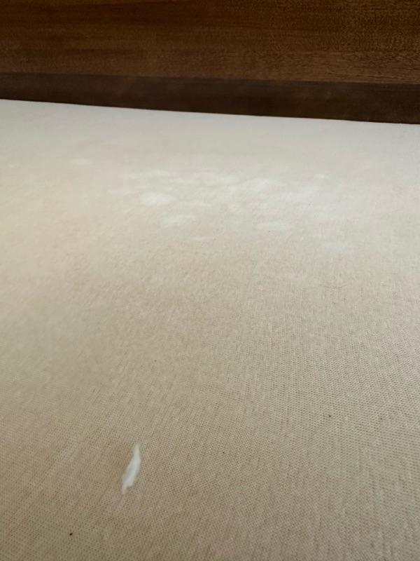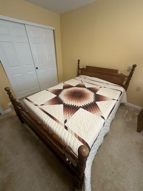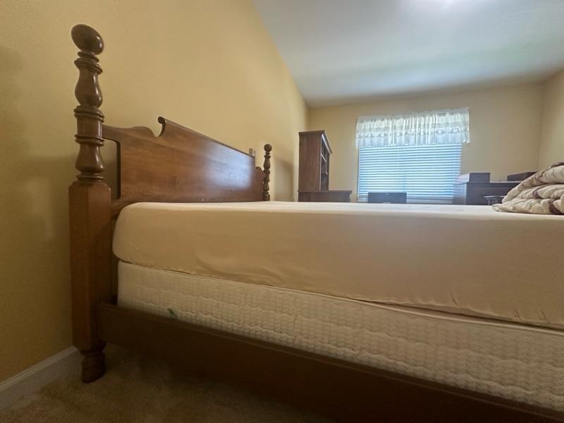 Queen Bed Frame, Mattress, Mattress Box and Blanket in fair condition. Mattress material is undetermined. There are a few stains on the mattress. Please examine photos closely.