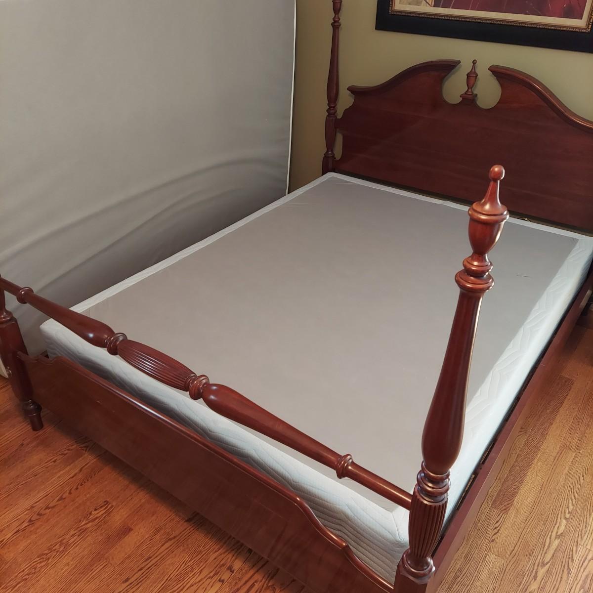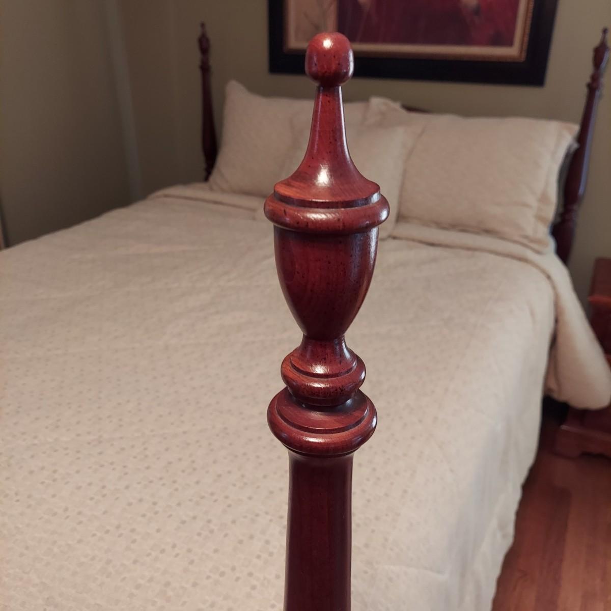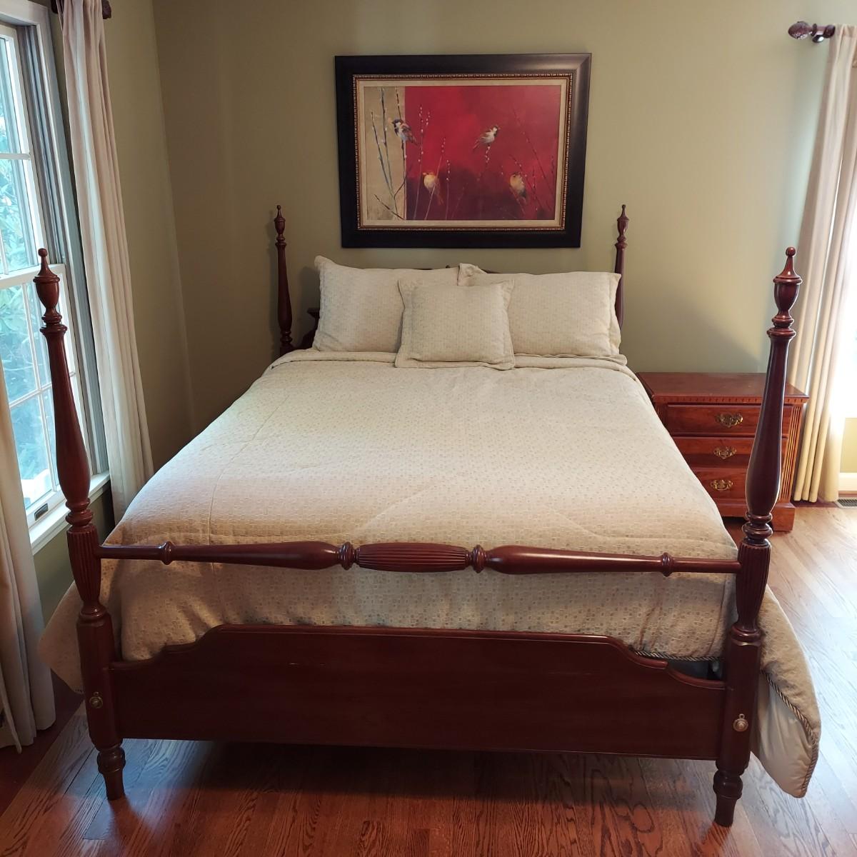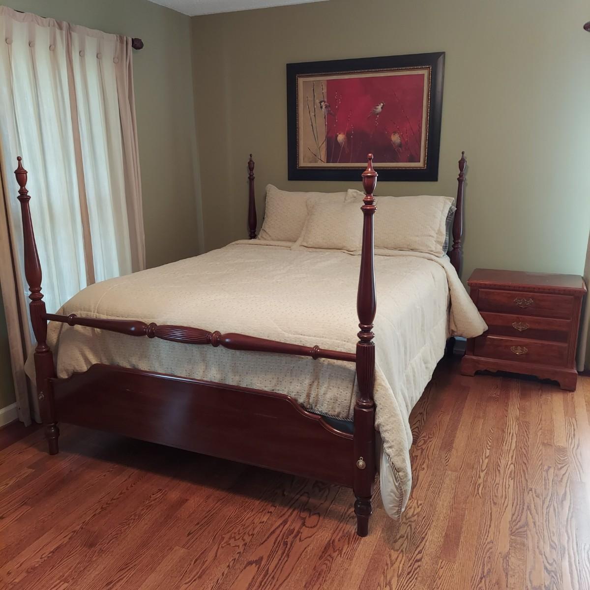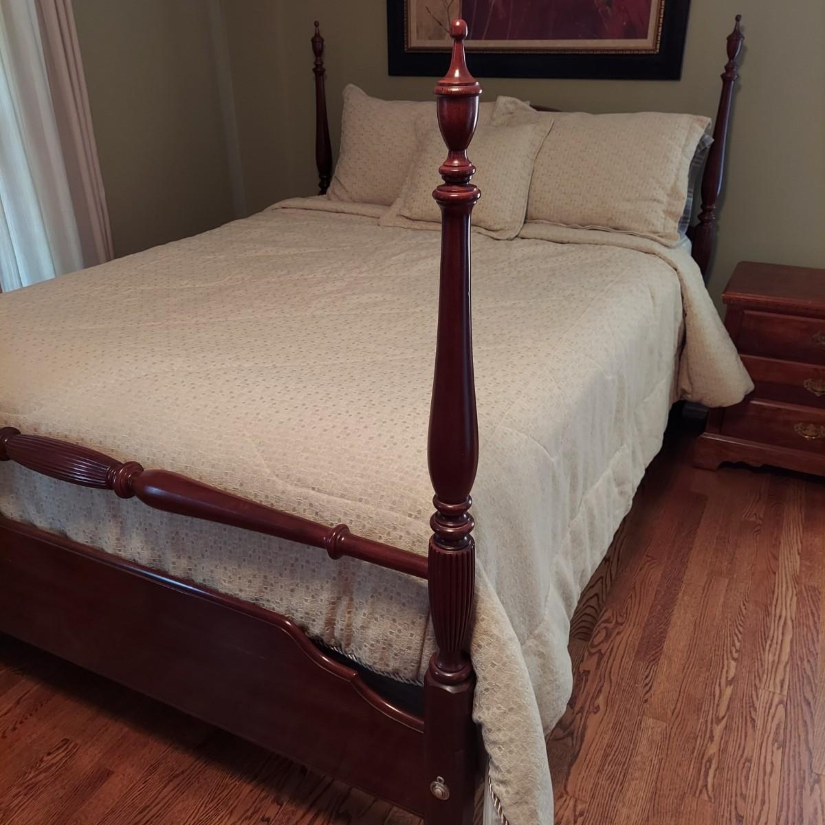 Lot includes a four post bed by Knob Creek with nightstand by Lea The Bedroom People. Neither the artwork nor the bedding are included in this lot. They are for sale in separate lots in this auction. The bed frame measures approximately 64" x 86" x 56"H. The nightstand is 26" x 16" x 25.5"H. The nightstand has scuffs on top. Please see photos. The mattress is available to the winning bidder if desired, but the winning bidder is not required to take it. Frame will need to be disassembled by the buyer at pickup. Appears to simply pop apart. Please see photos. Local Pickup Only.