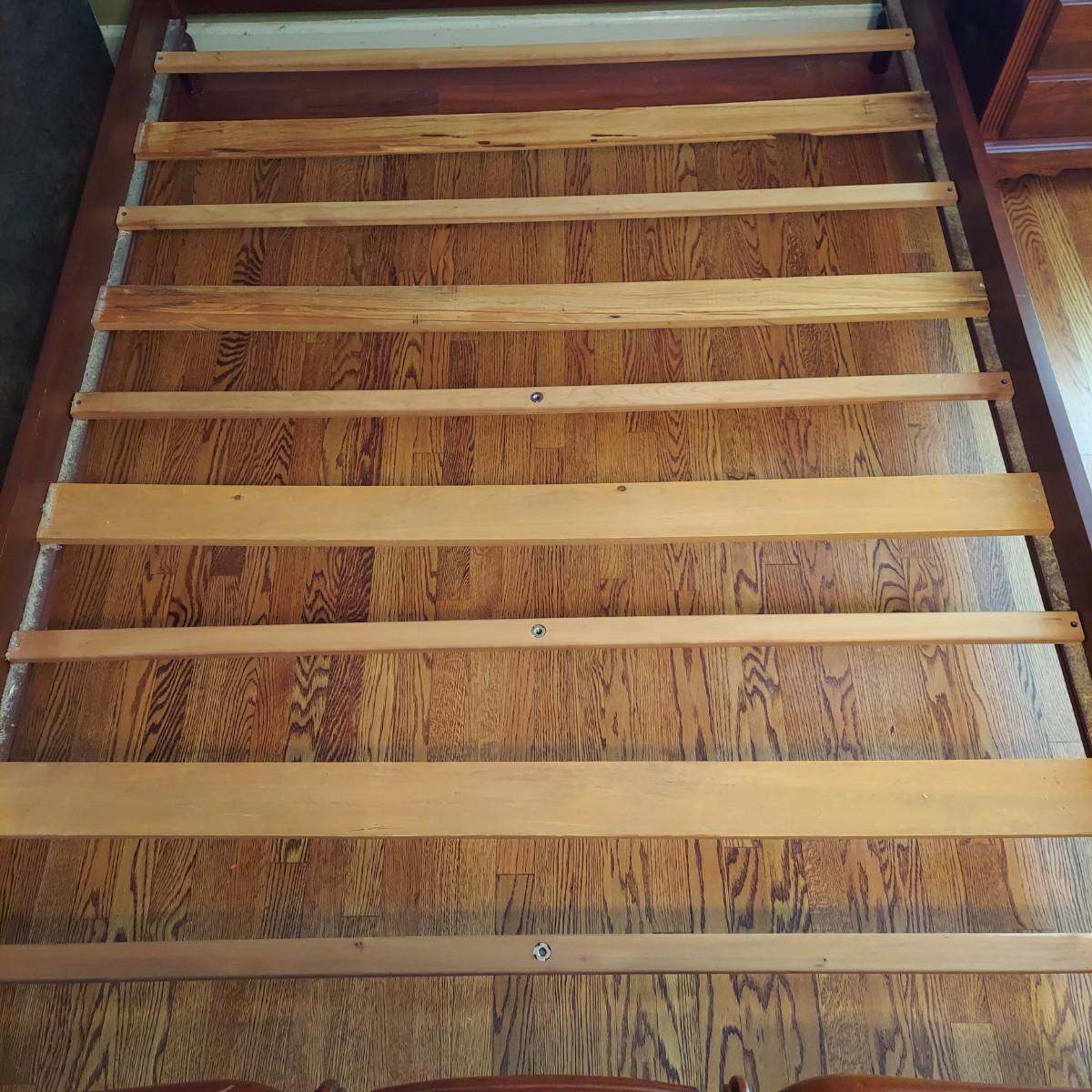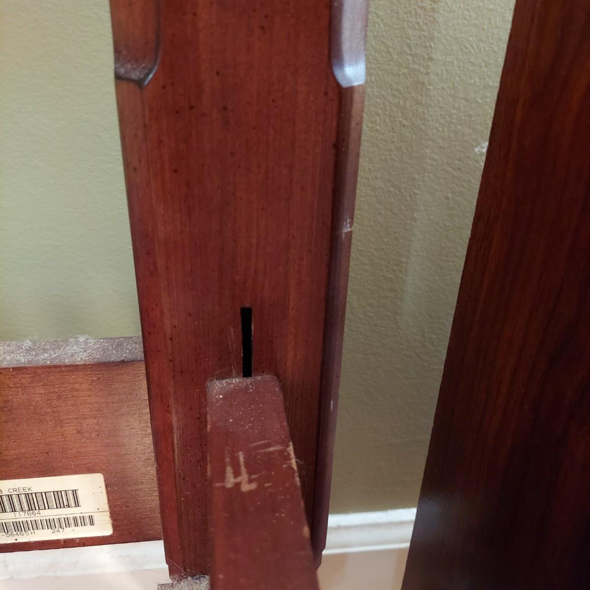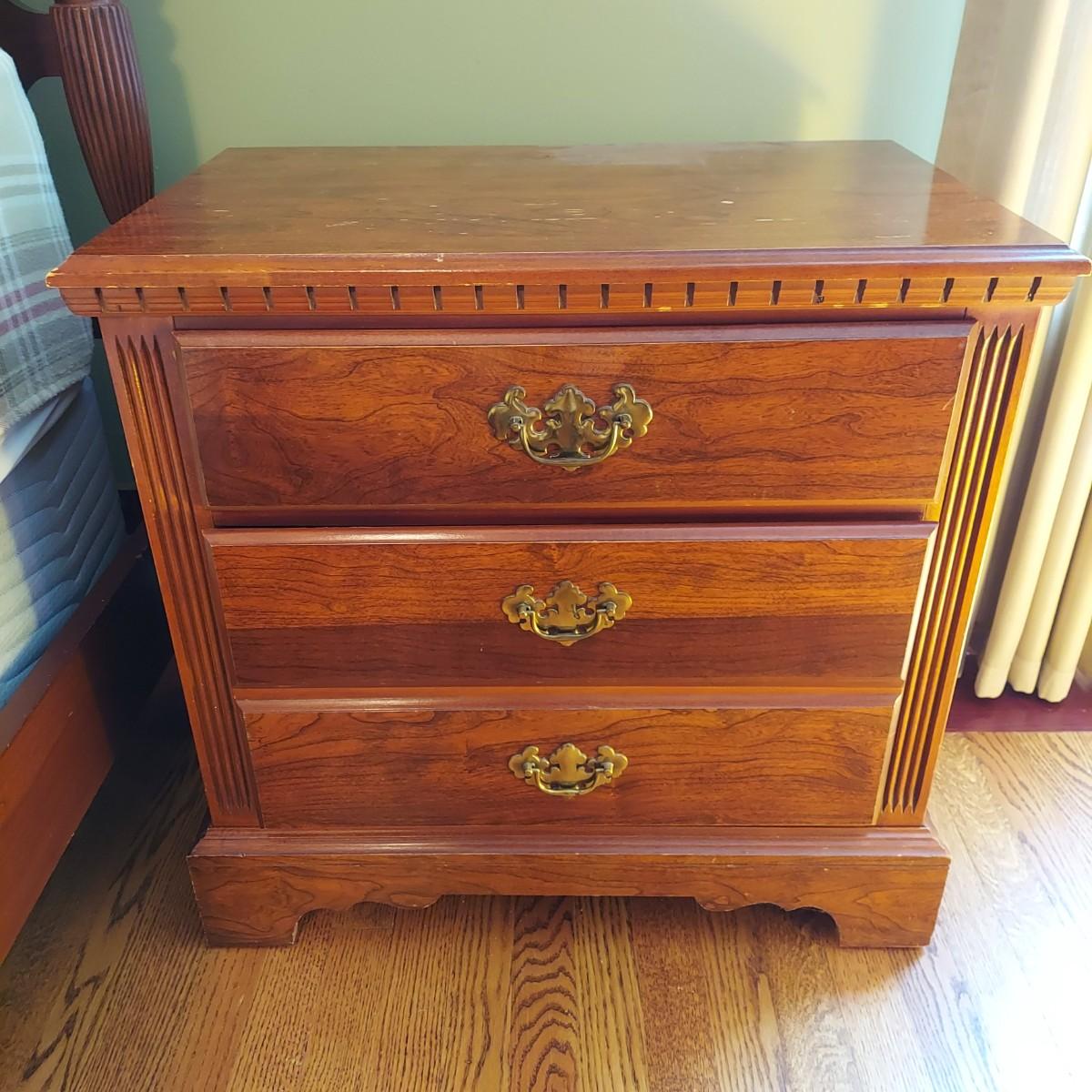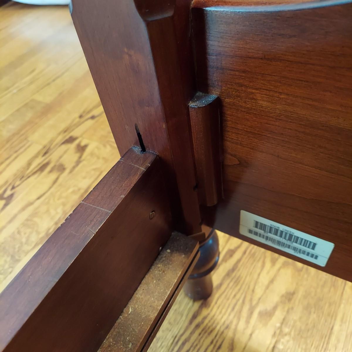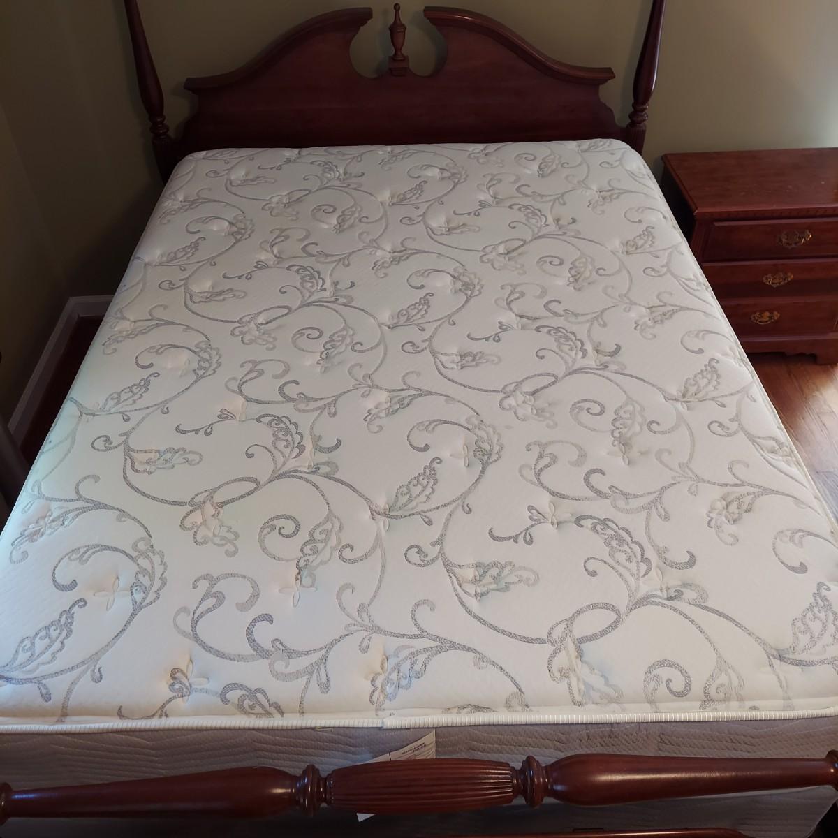 Lot includes a four post bed by Knob Creek with nightstand by Lea The Bedroom People. Neither the artwork nor the bedding are included in this lot. They are for sale in separate lots in this auction. The bed frame measures approximately 64" x 86" x 56"H. The nightstand is 26" x 16" x 25.5"H. The nightstand has scuffs on top. Please see photos. The mattress is available to the winning bidder if desired, but the winning bidder is not required to take it. Frame will need to be disassembled by the buyer at pickup. Appears to simply pop apart. Please see photos. Local Pickup Only.