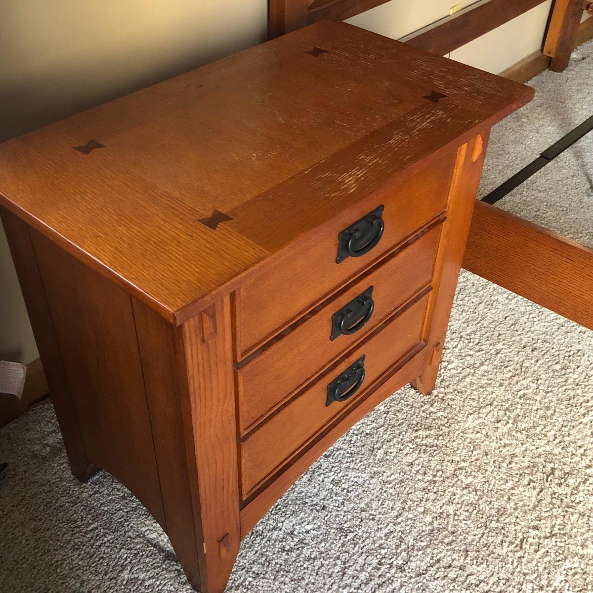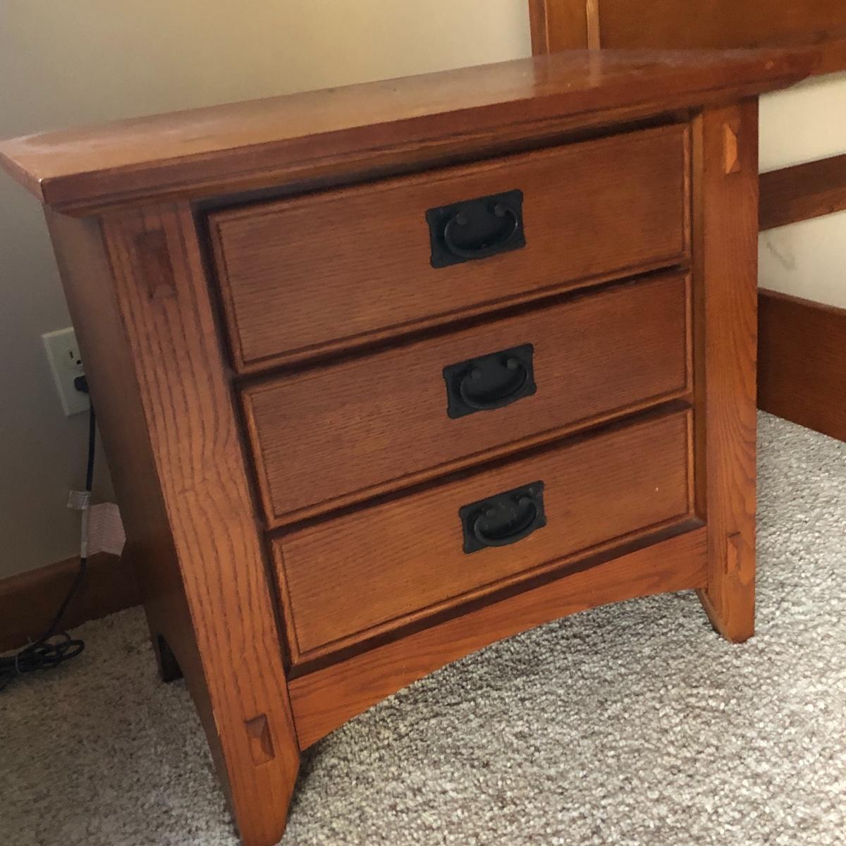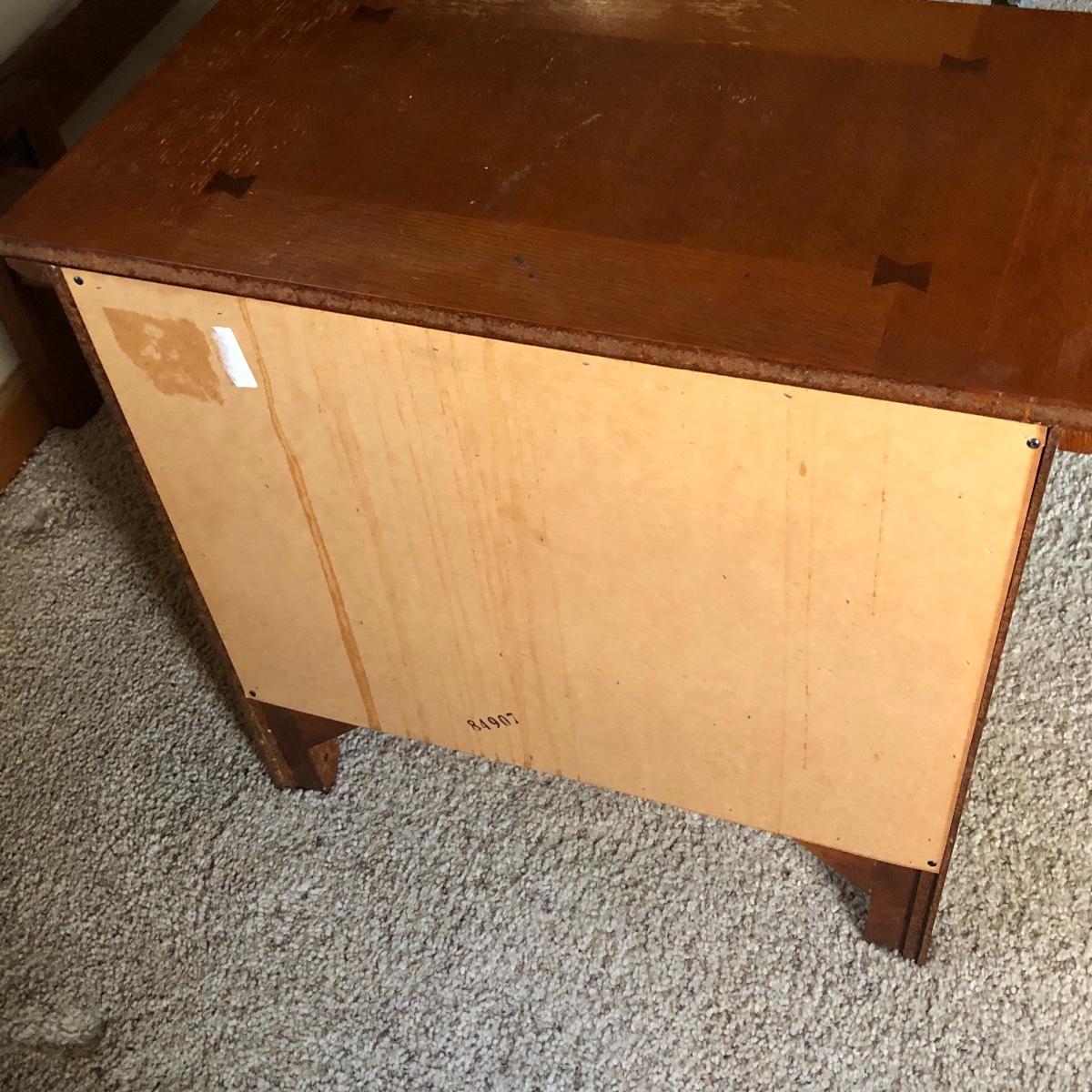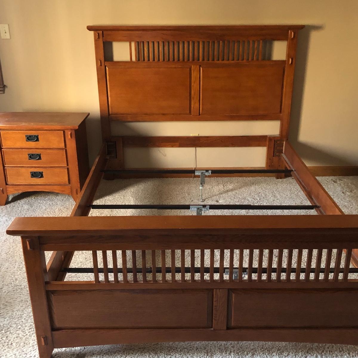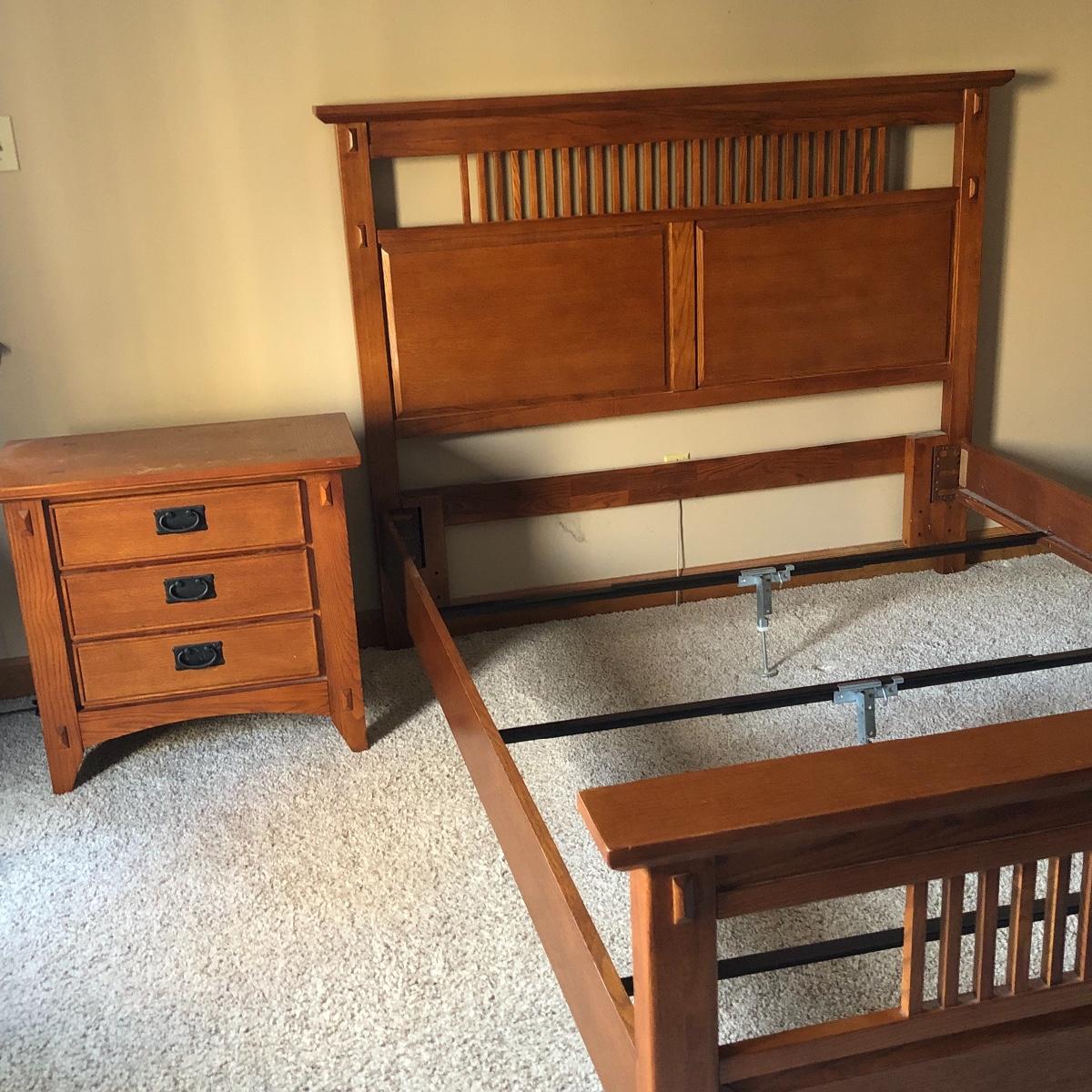 The queen bed frame has three metal slates and measures 66.5” x 86” 52”. The bedside table measures 28” x 16” x 26.5”. The three drawers are lined with felt. Some of the veneer on top is worn in places (please see pictures). Local pick up only.