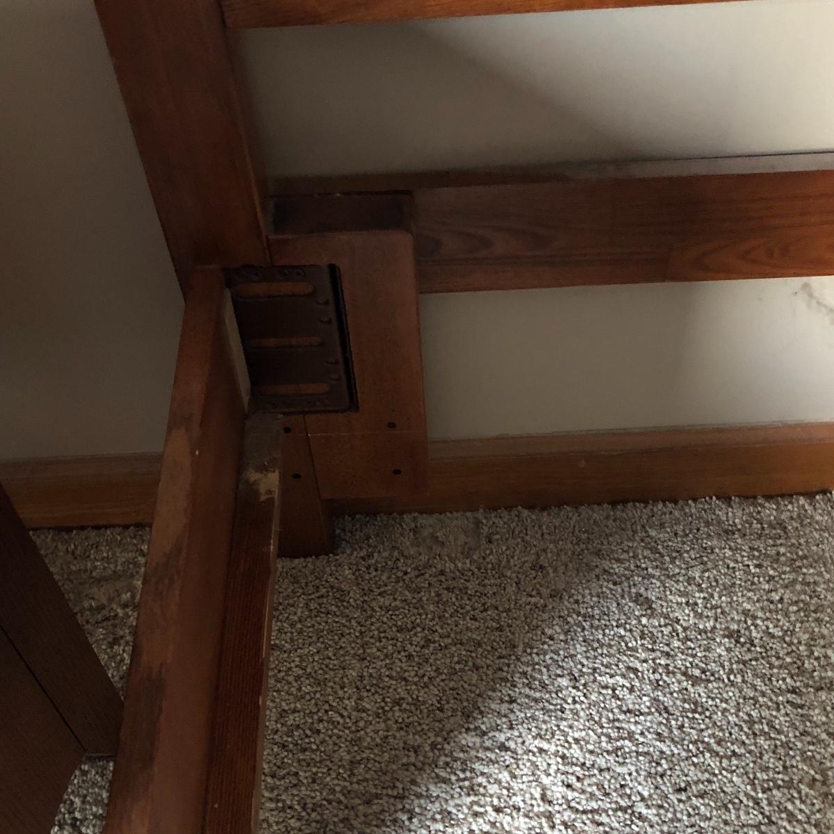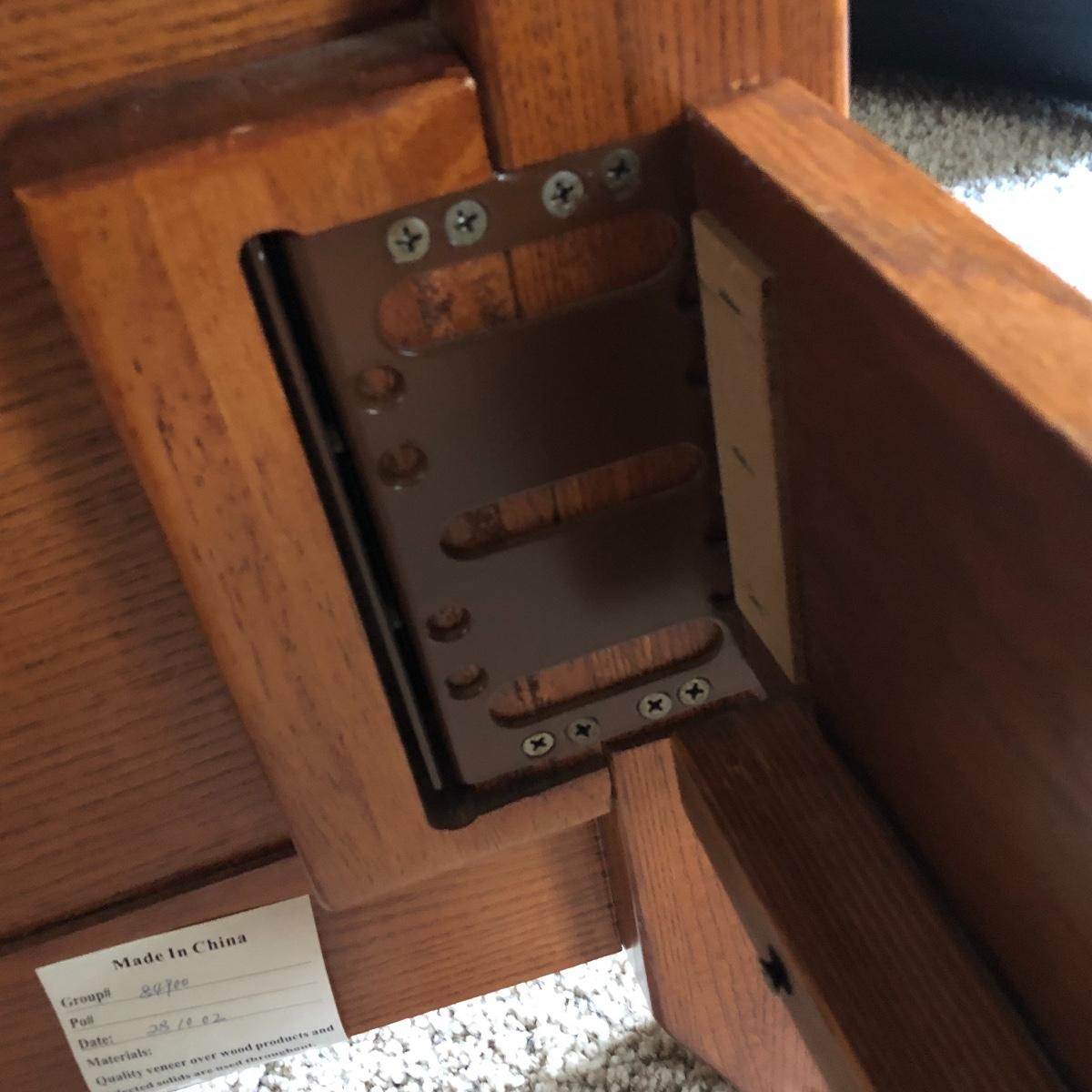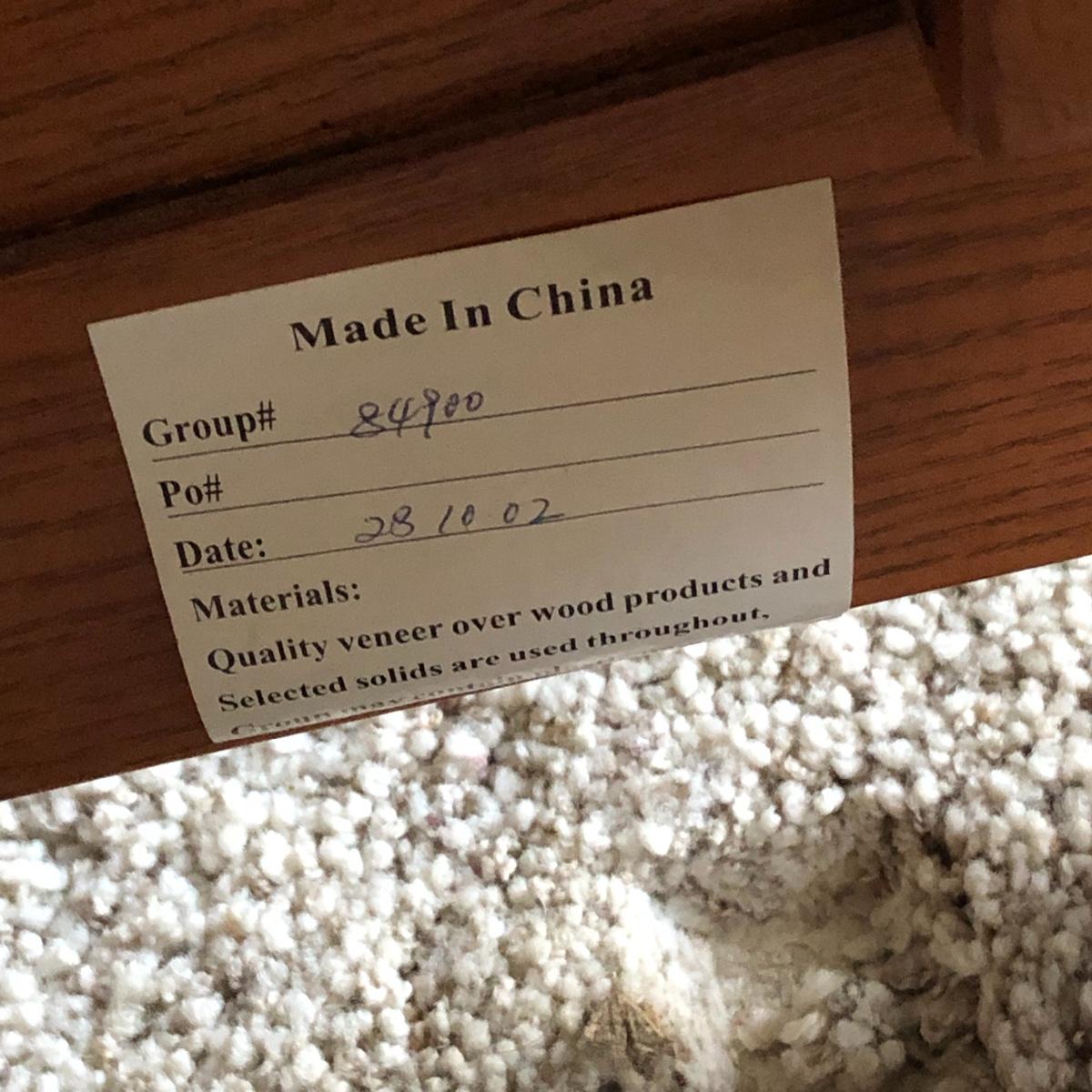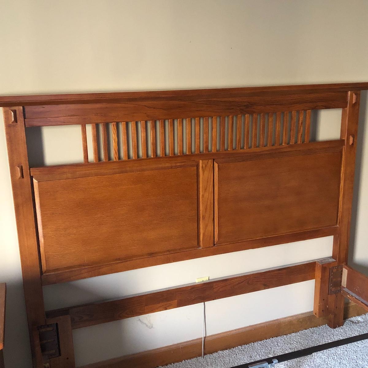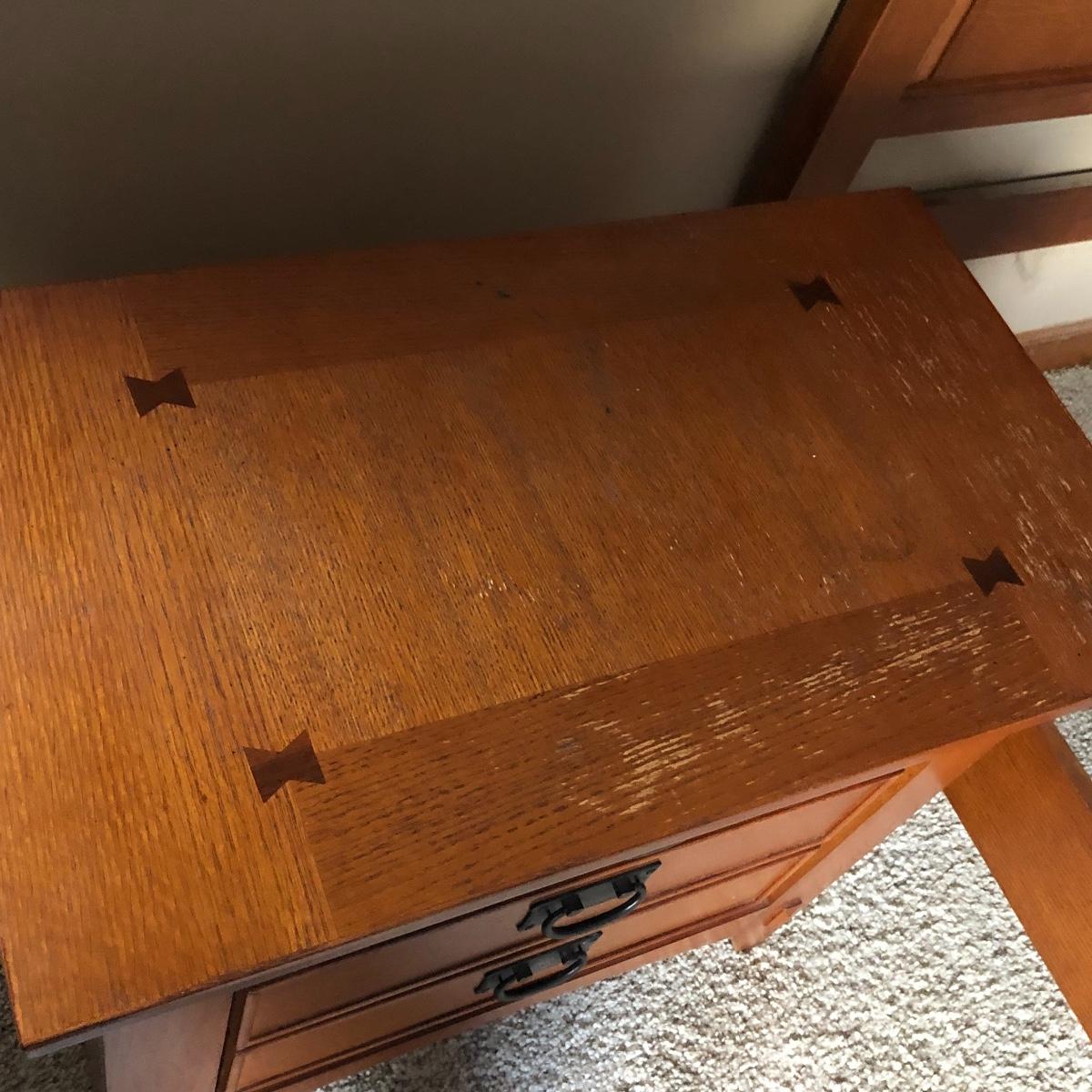 The queen bed frame has three metal slates and measures 66.5” x 86” 52”. The bedside table measures 28” x 16” x 26.5”. The three drawers are lined with felt. Some of the veneer on top is worn in places (please see pictures). Local pick up only.