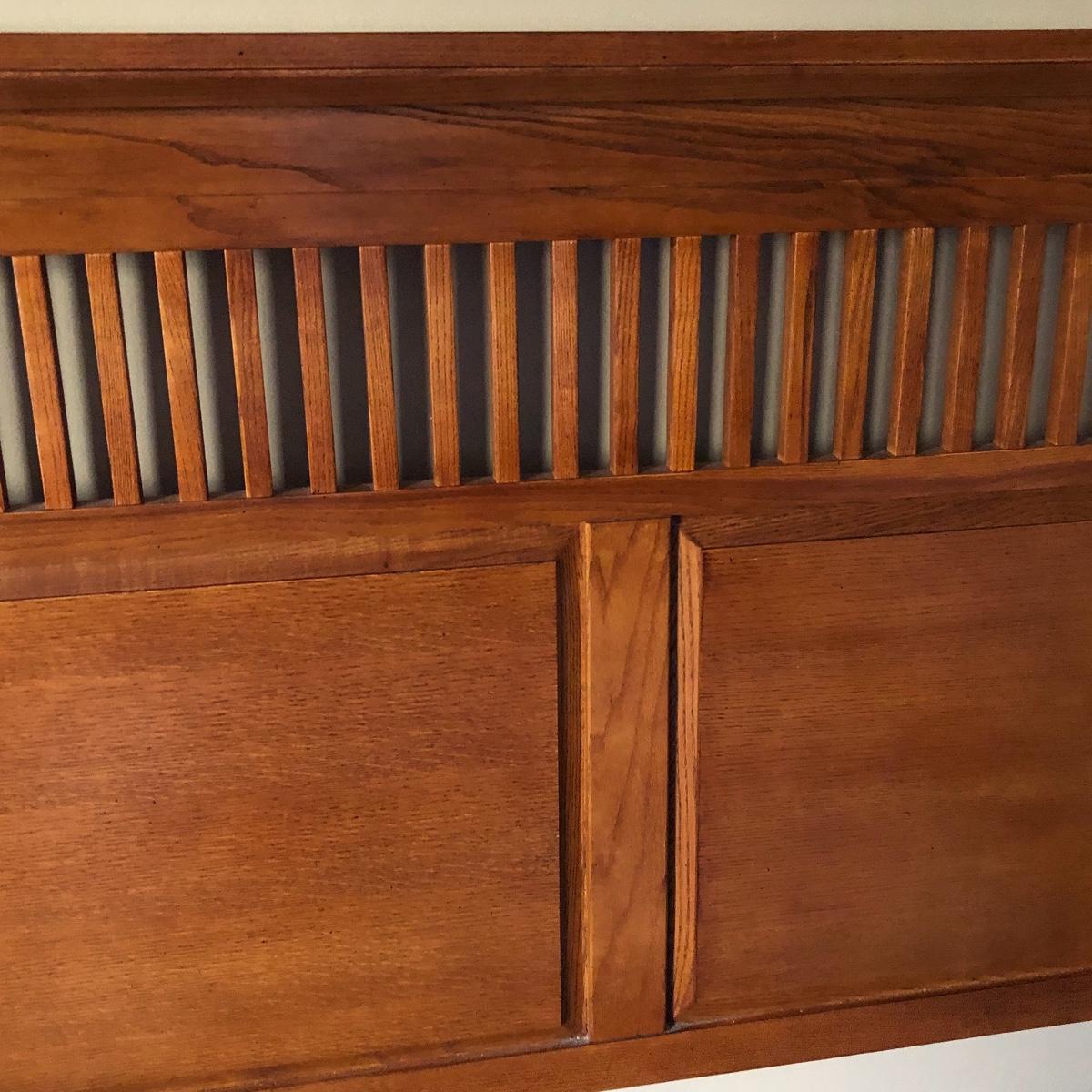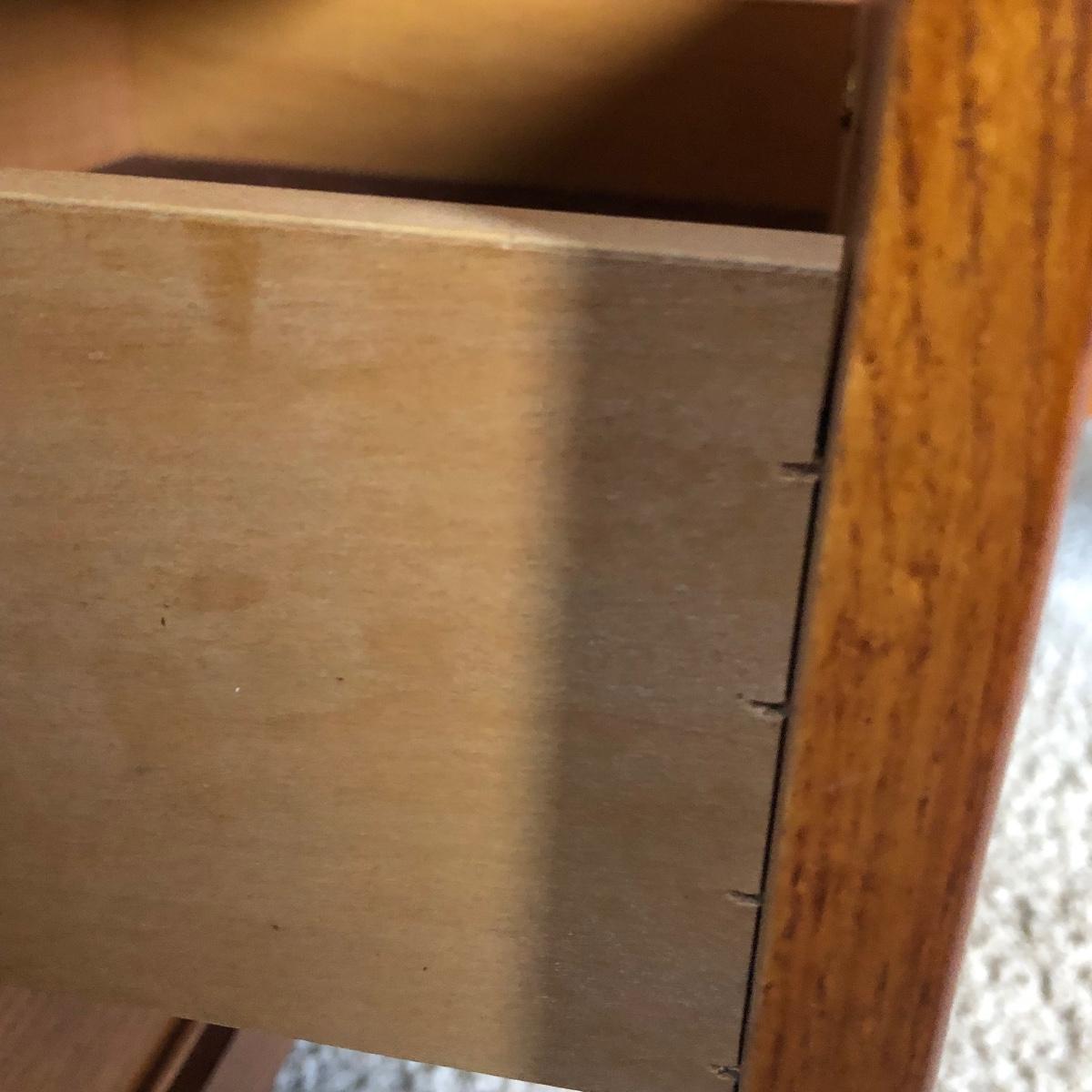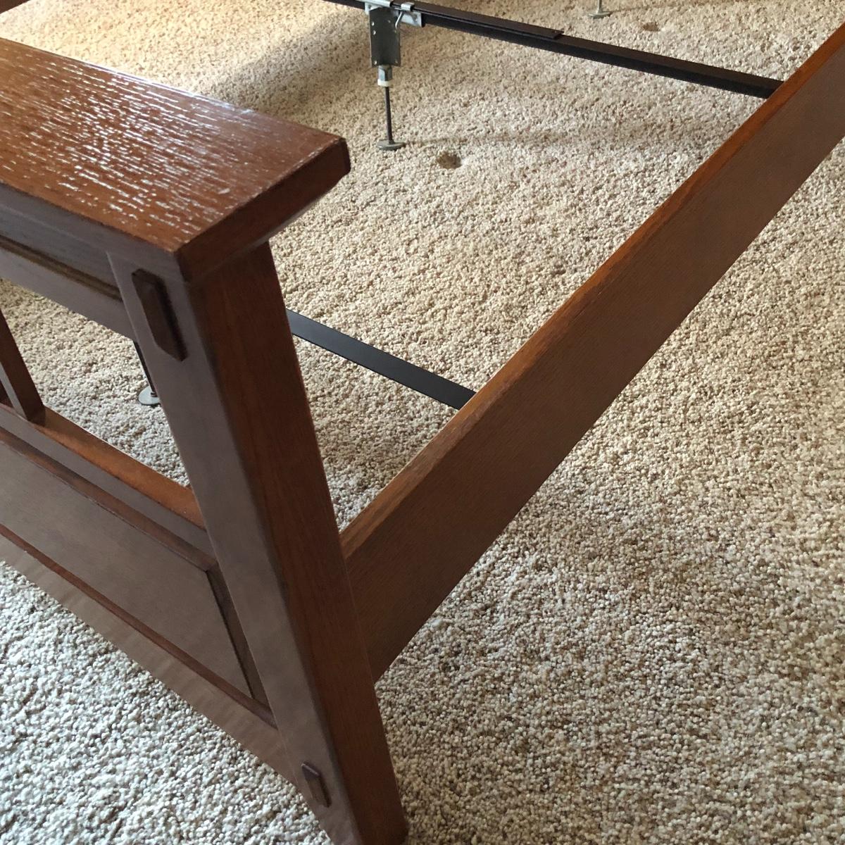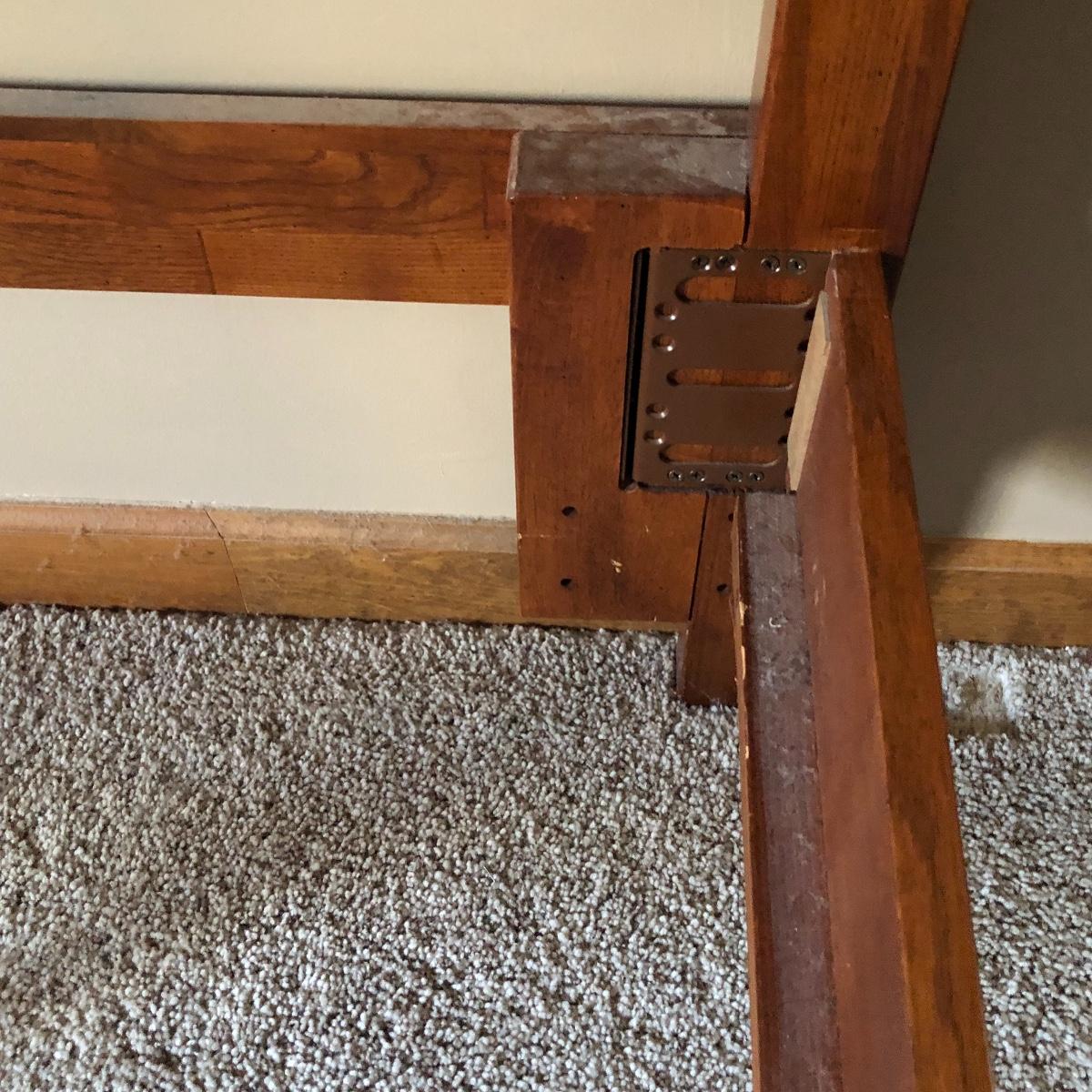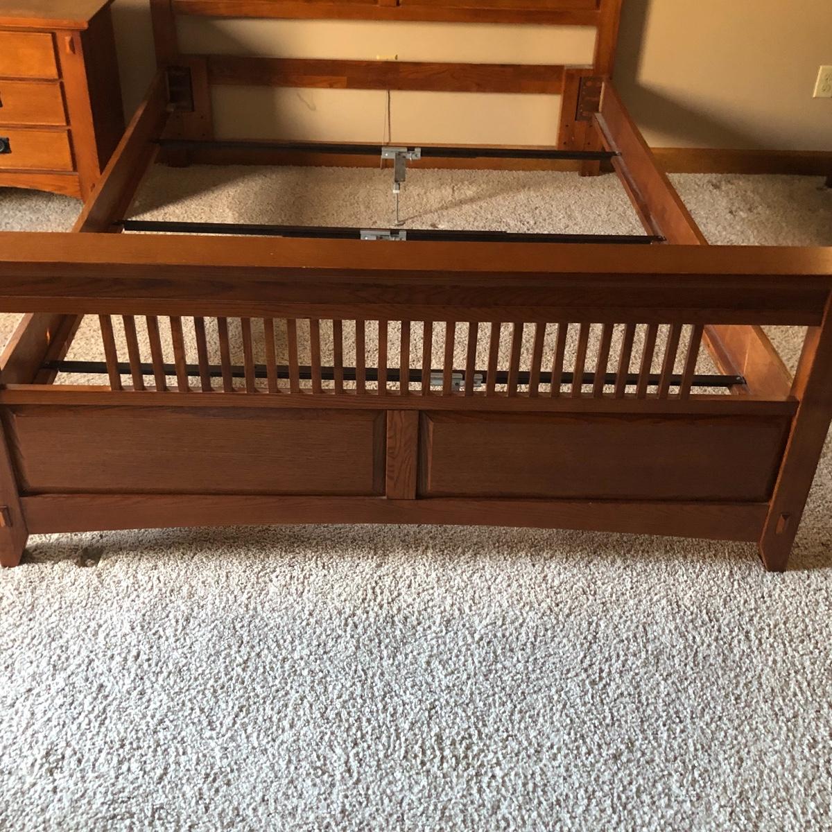 The queen bed frame has three metal slates and measures 66.5” x 86” 52”. The bedside table measures 28” x 16” x 26.5”. The three drawers are lined with felt. Some of the veneer on top is worn in places (please see pictures). Local pick up only.