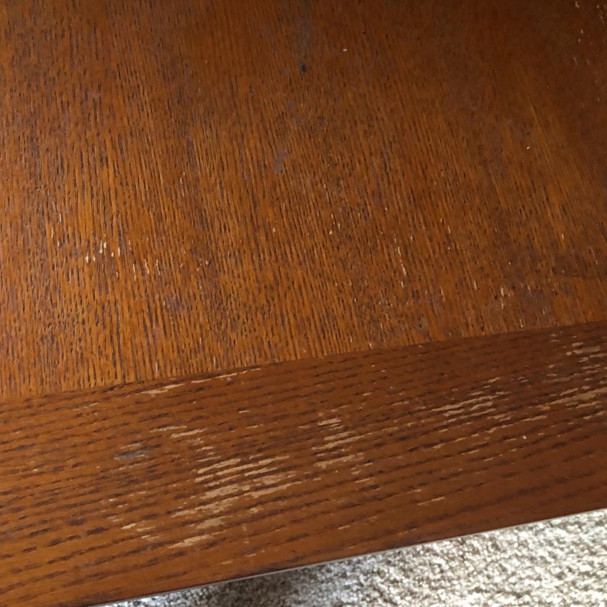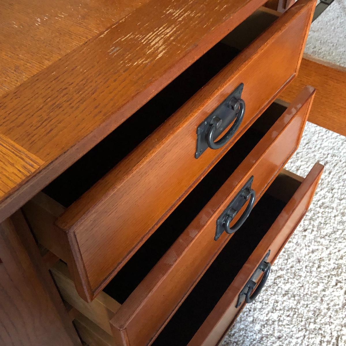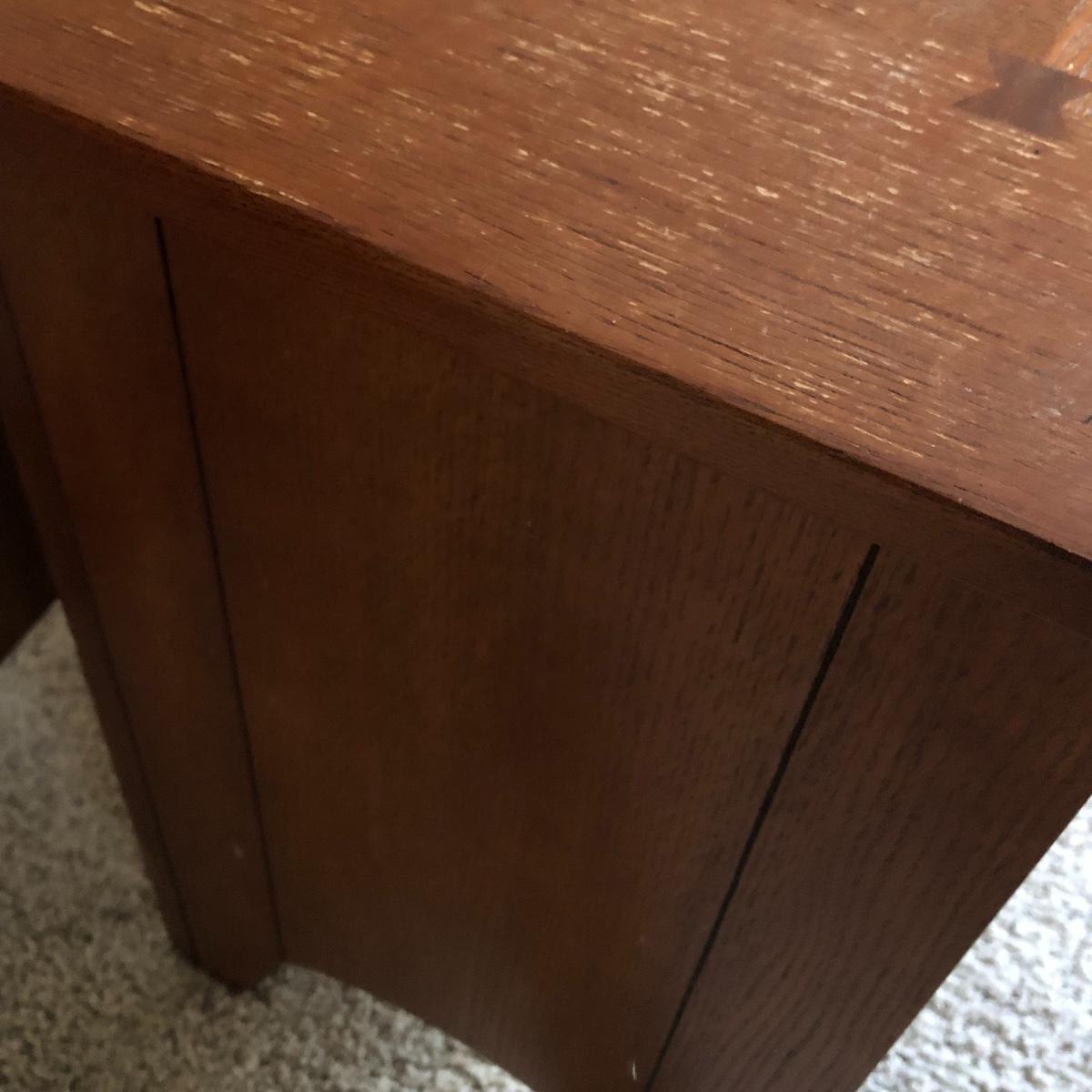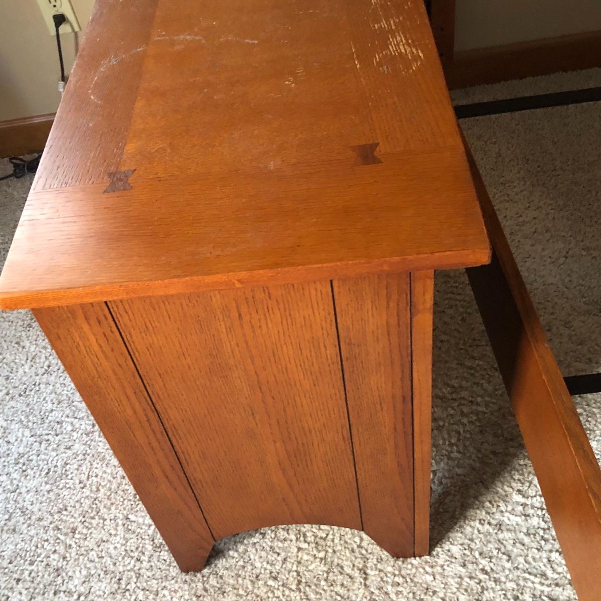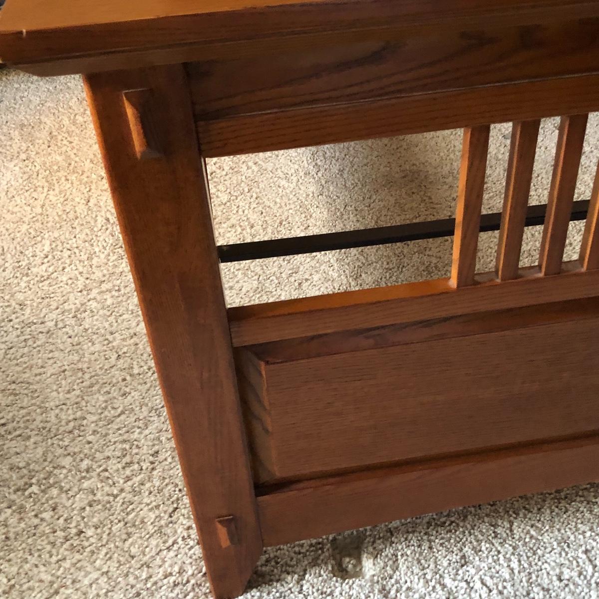 The queen bed frame has three metal slates and measures 66.5” x 86” 52”. The bedside table measures 28” x 16” x 26.5”. The three drawers are lined with felt. Some of the veneer on top is worn in places (please see pictures). Local pick up only.