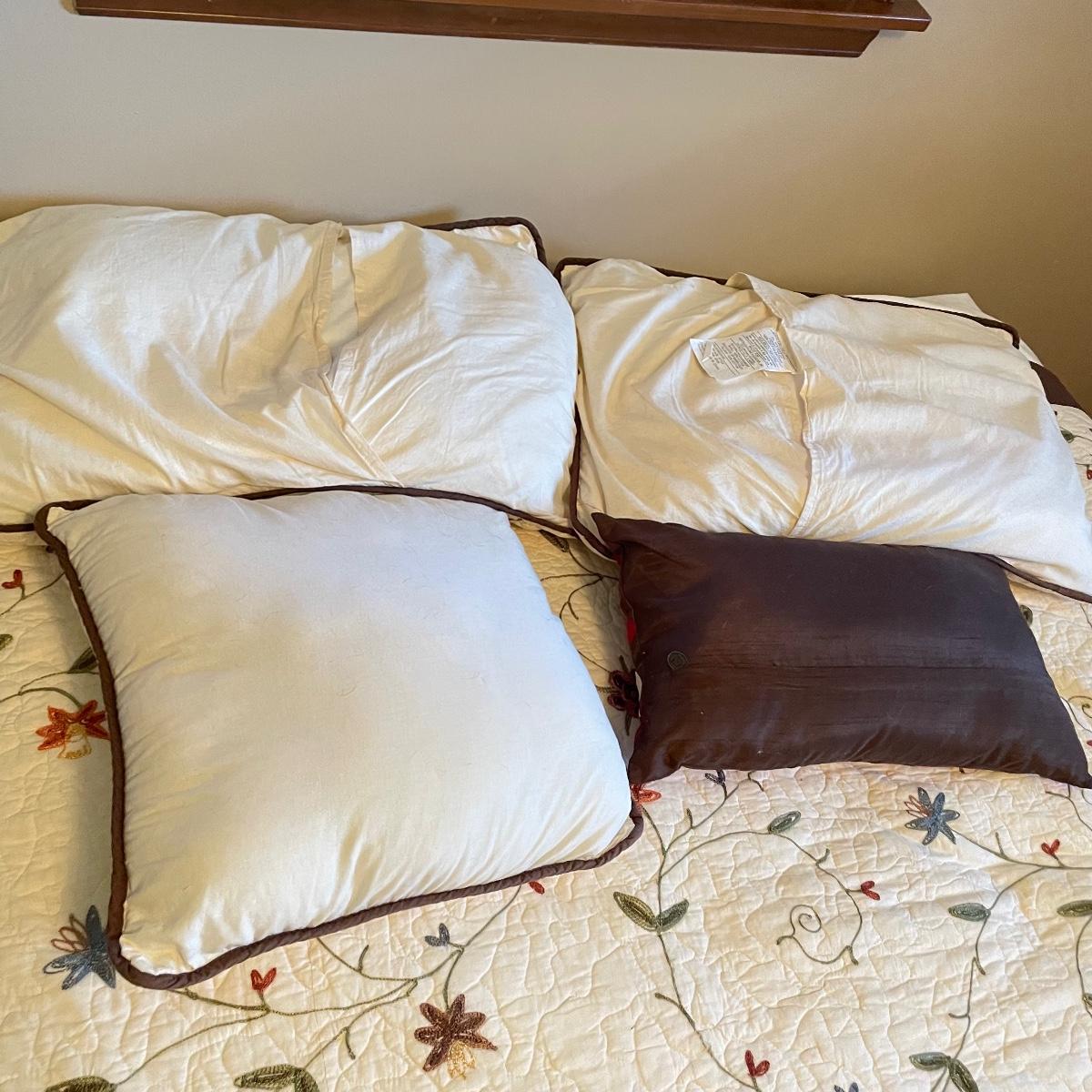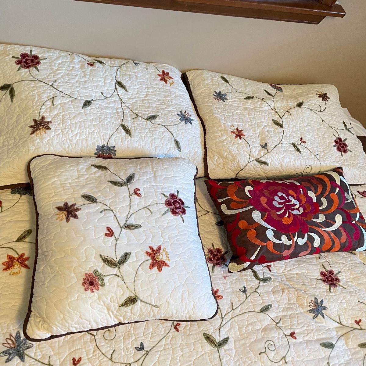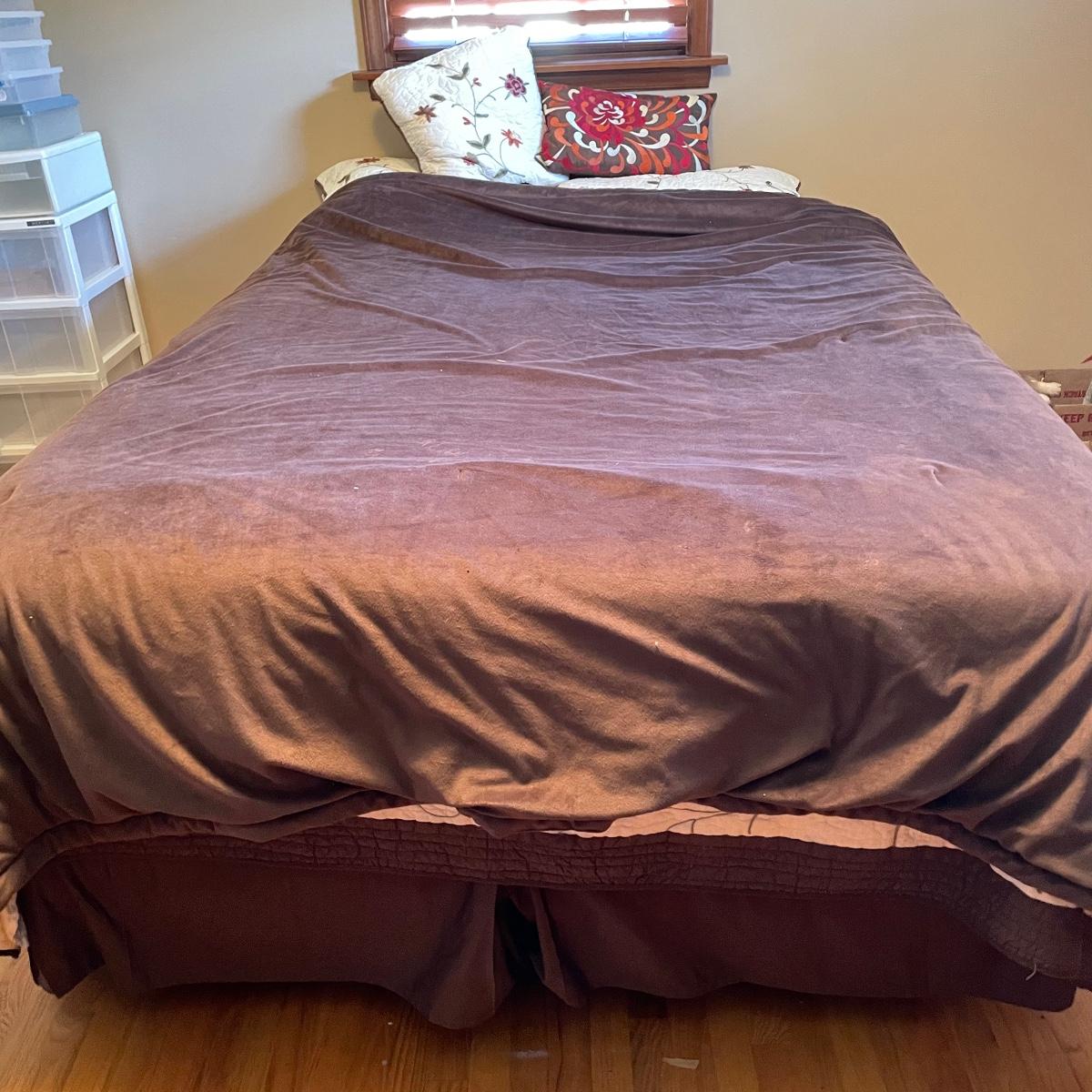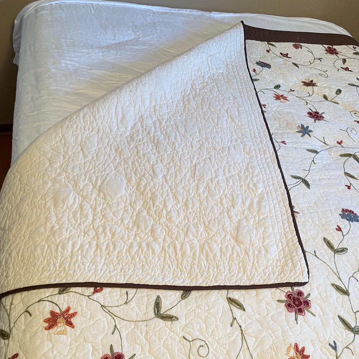 Metal queen bed frame with bedding. Bedding includes a pretty embroidered set of blanket, two pillow cases and throw pillow. Lot also offers a Pier One embroidered pillow, nice cushioned mattress cover, warm fuzzy chocolate brown blanket and white blanket. Items will need some laundering, pet hair is noticeable. Winning bidder may take home the Beauty Rest double pillow top mattress with box springs at no additional cost if they choose. Local pick up only.
