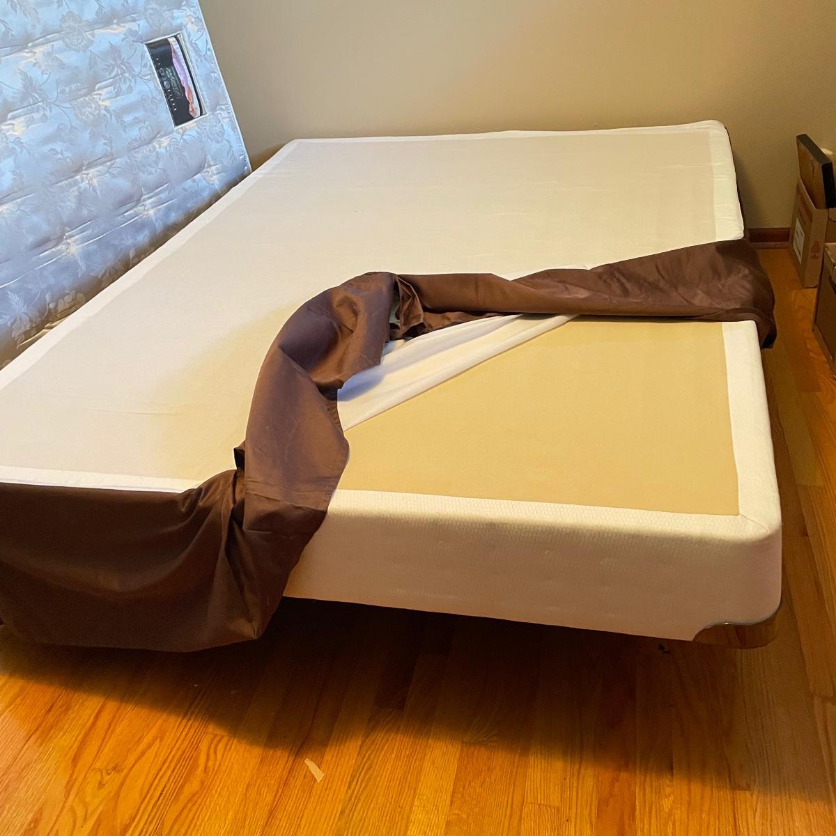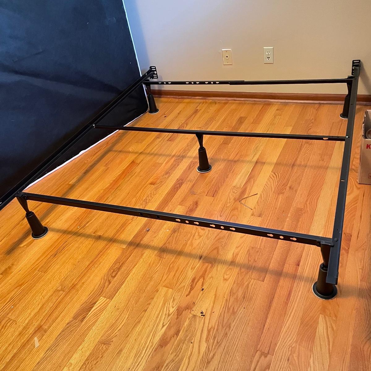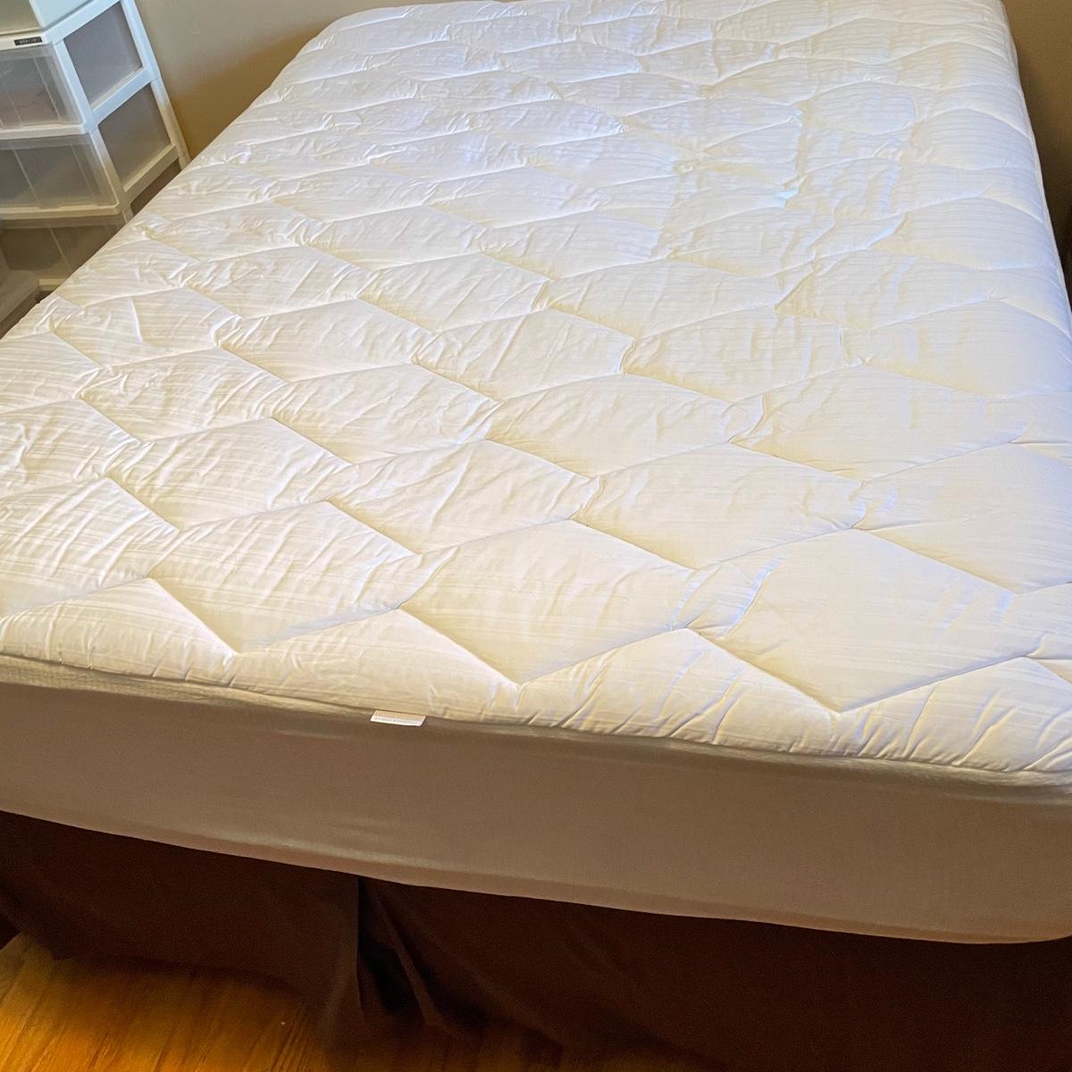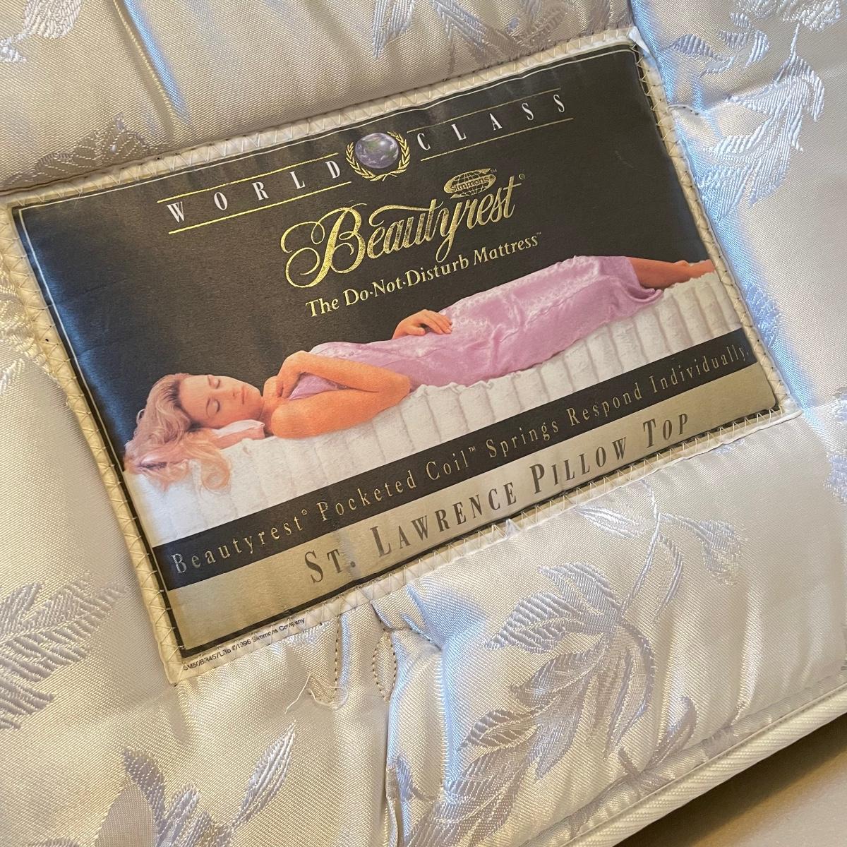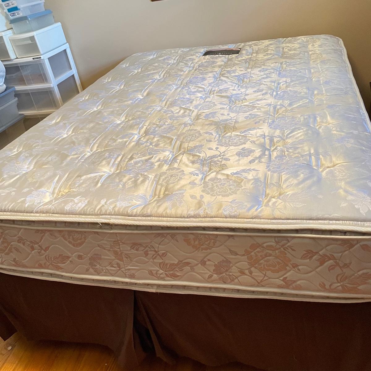 Metal queen bed frame with bedding. Bedding includes a pretty embroidered set of blanket, two pillow cases and throw pillow. Lot also offers a Pier One embroidered pillow, nice cushioned mattress cover, warm fuzzy chocolate brown blanket and white blanket. Items will need some laundering, pet hair is noticeable. Winning bidder may take home the Beauty Rest double pillow top mattress with box springs at no additional cost if they choose. Local pick up only.