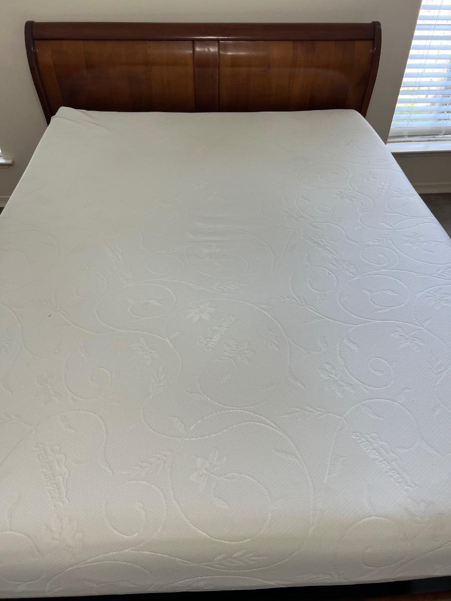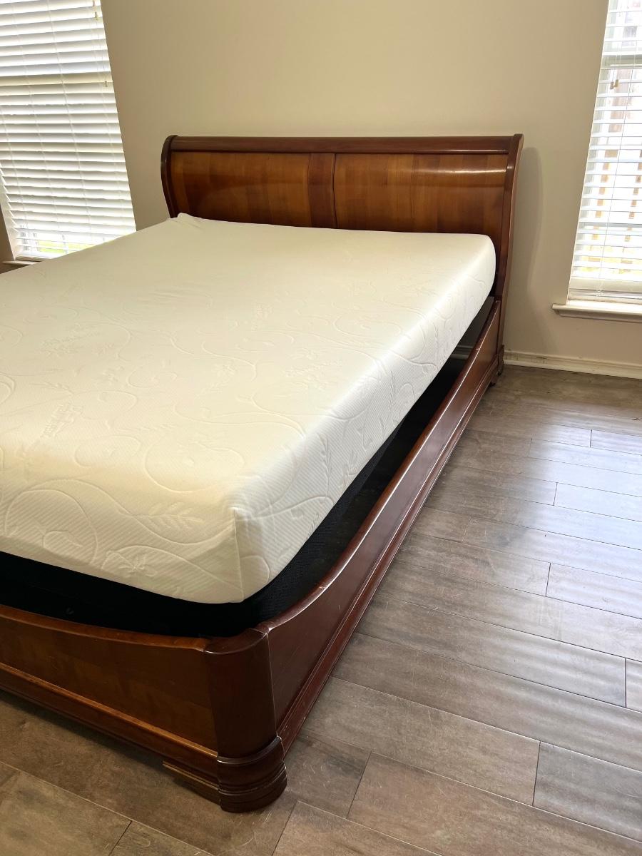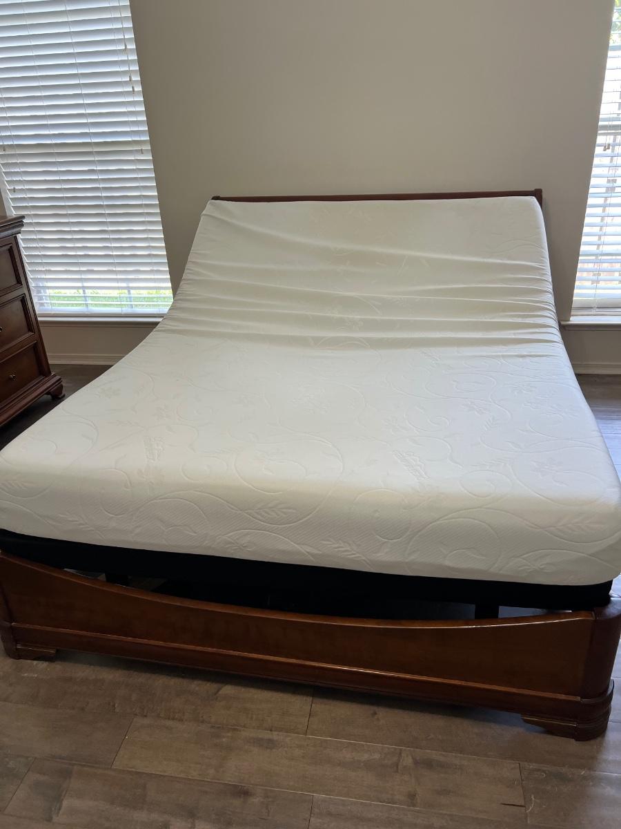 QUEEN Sleigh Bed With Almost New Adjustable Tempurpedic mattress with remote. This was just recently purchased and is clean. Bedding not included. Mattress has been disinfected with OdoBan. Winning bidder may chose to leave the mattress if desired.