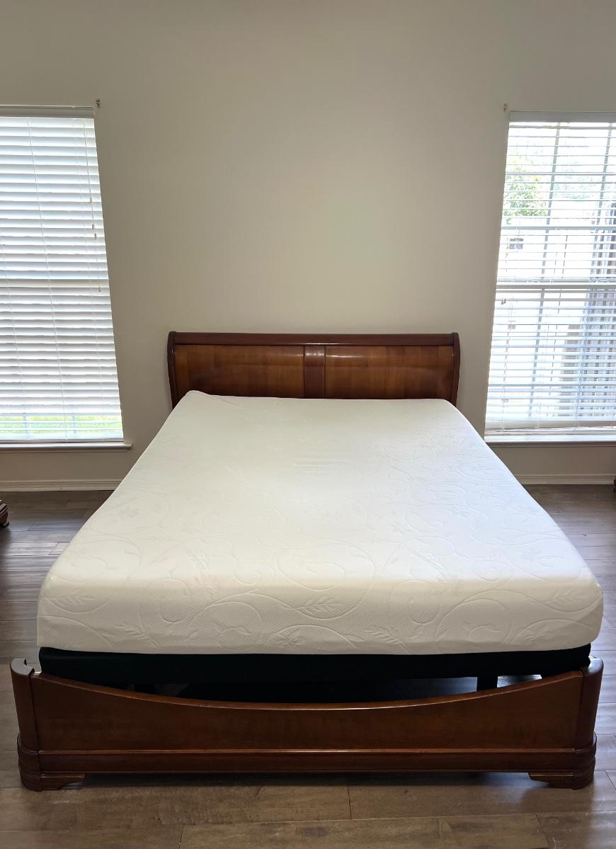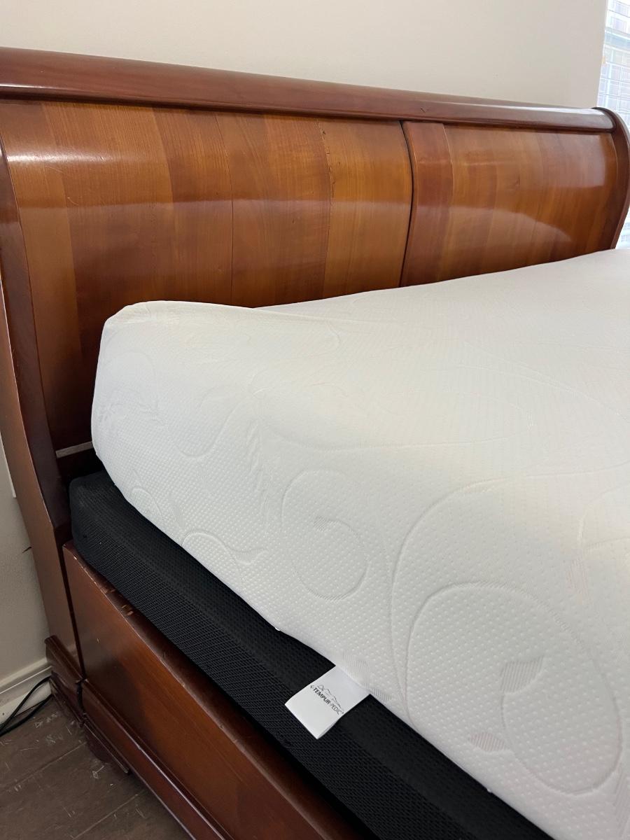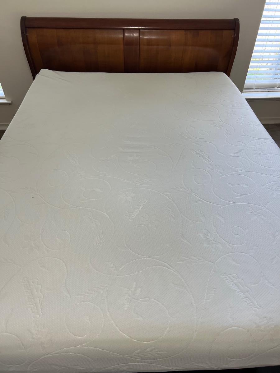 QUEEN Sleigh Bed With Almost New Adjustable Tempurpedic mattress with remote. This was just recently purchased and is clean. Bedding not included. Mattress has been disinfected with OdoBan. Winning bidder may chose to leave the mattress if desired.