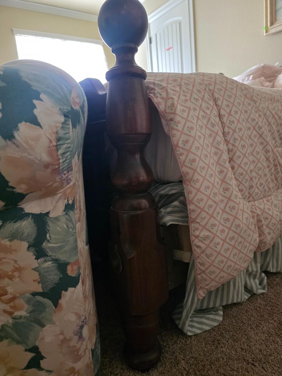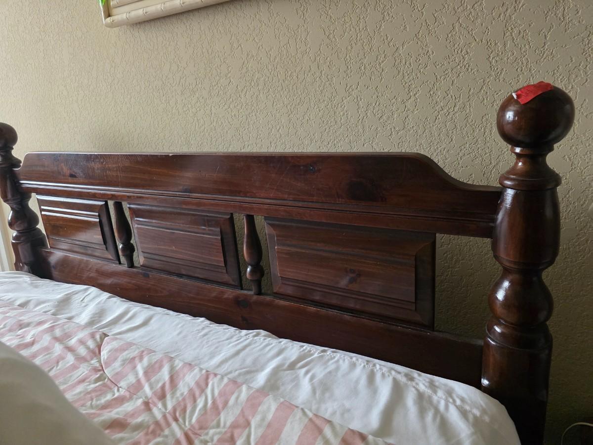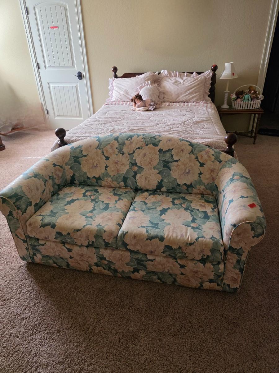 Early American Queen bed including headboard, footboard, mattress and bedding with pull out sofa bed and side table, lamp and basket of beanie babies. Matching furniture pieces in lots 31,32 & 33.