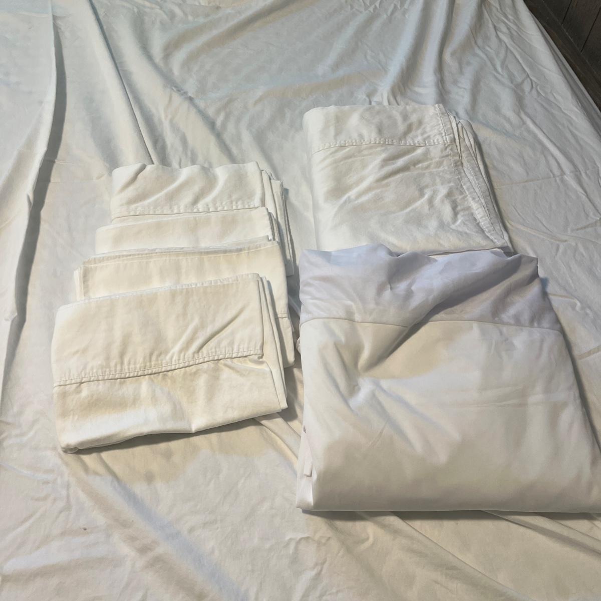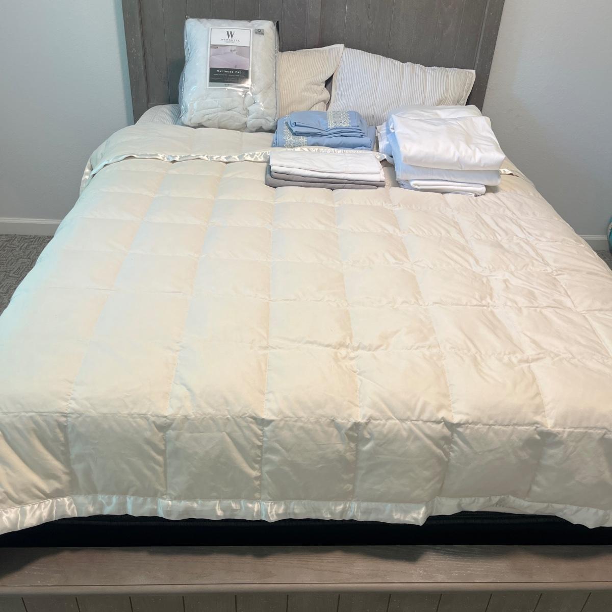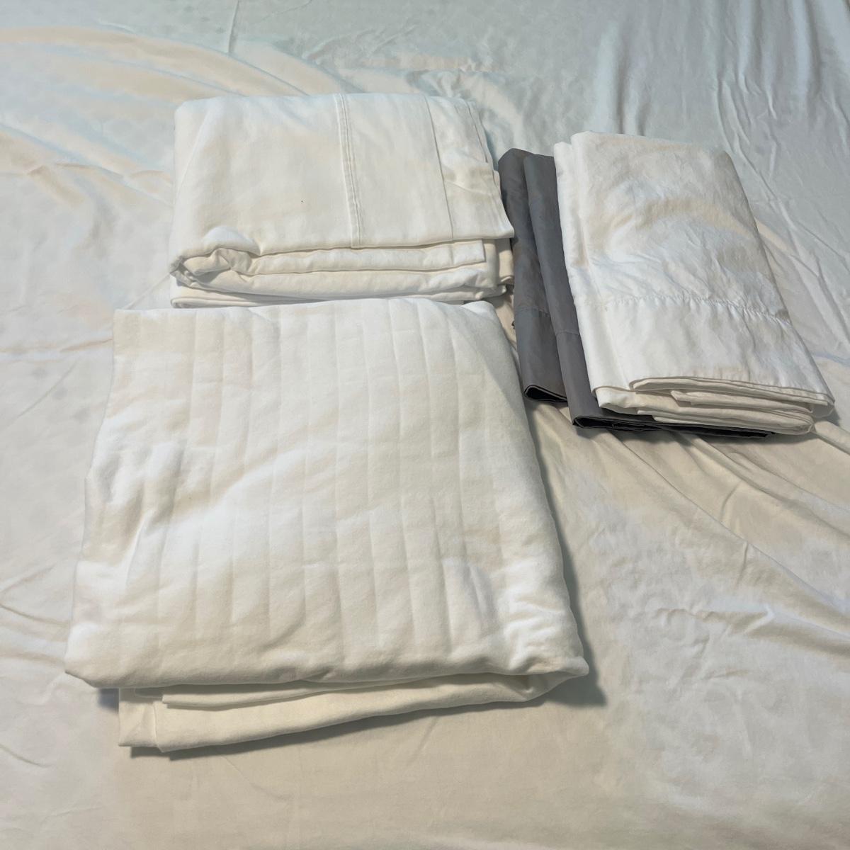 Lot includes queen bedspread with matching pillow shams, duvet, comforter, mattress pad, blue sheet set and two white sheet sets and more. All items are shown on queen bed. Bed not included but available in this sale.