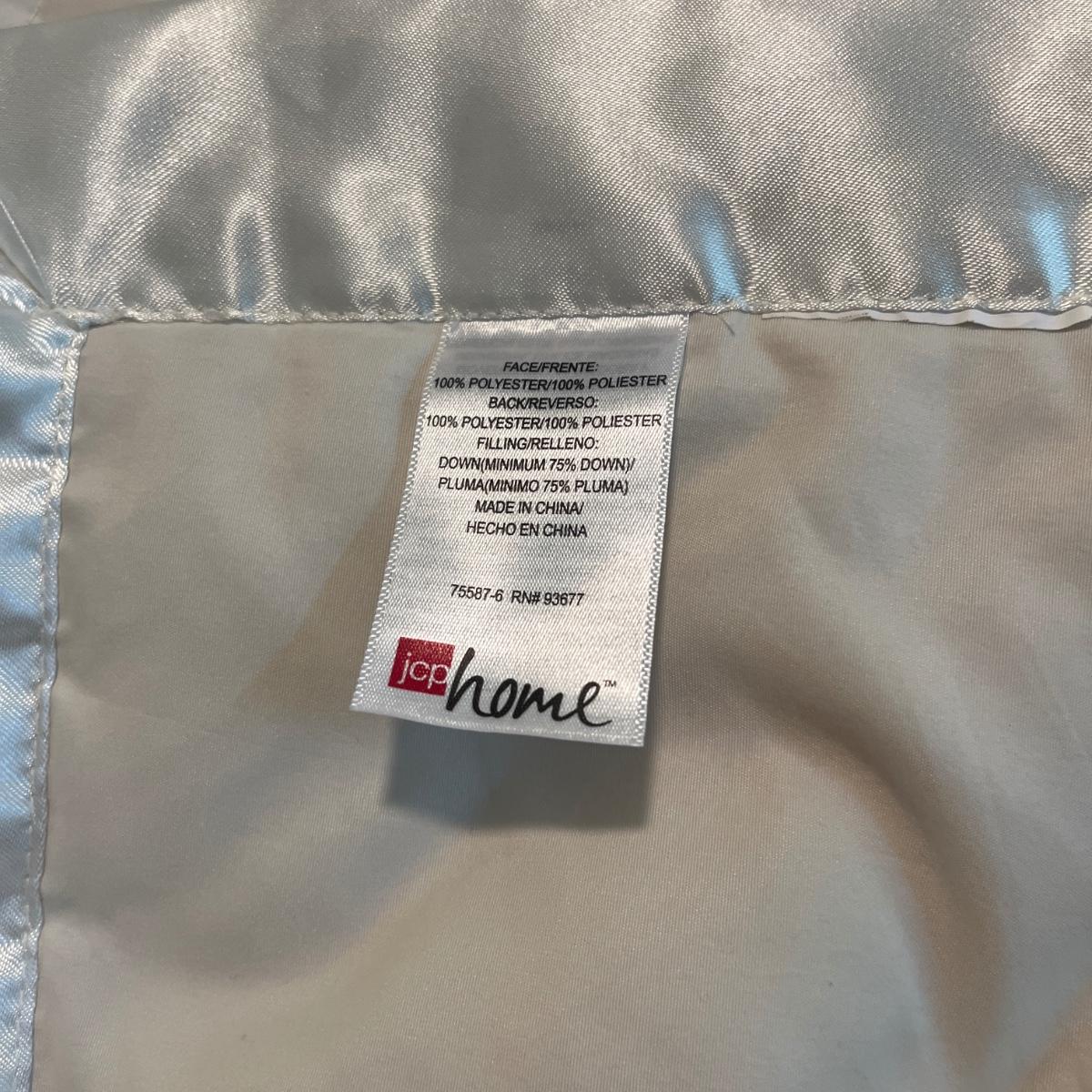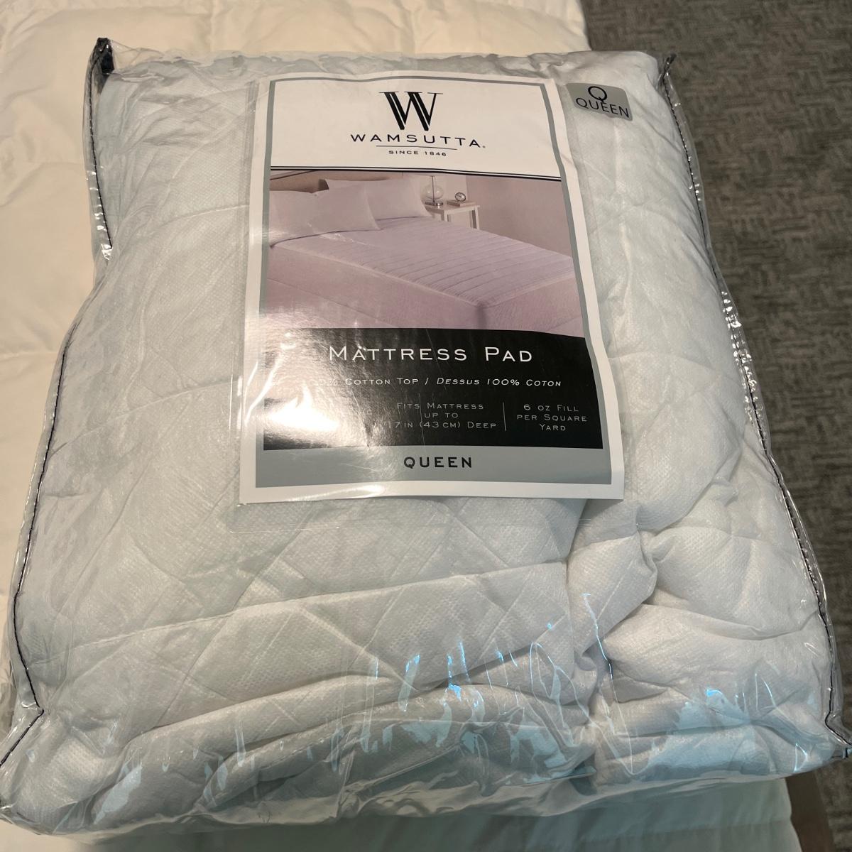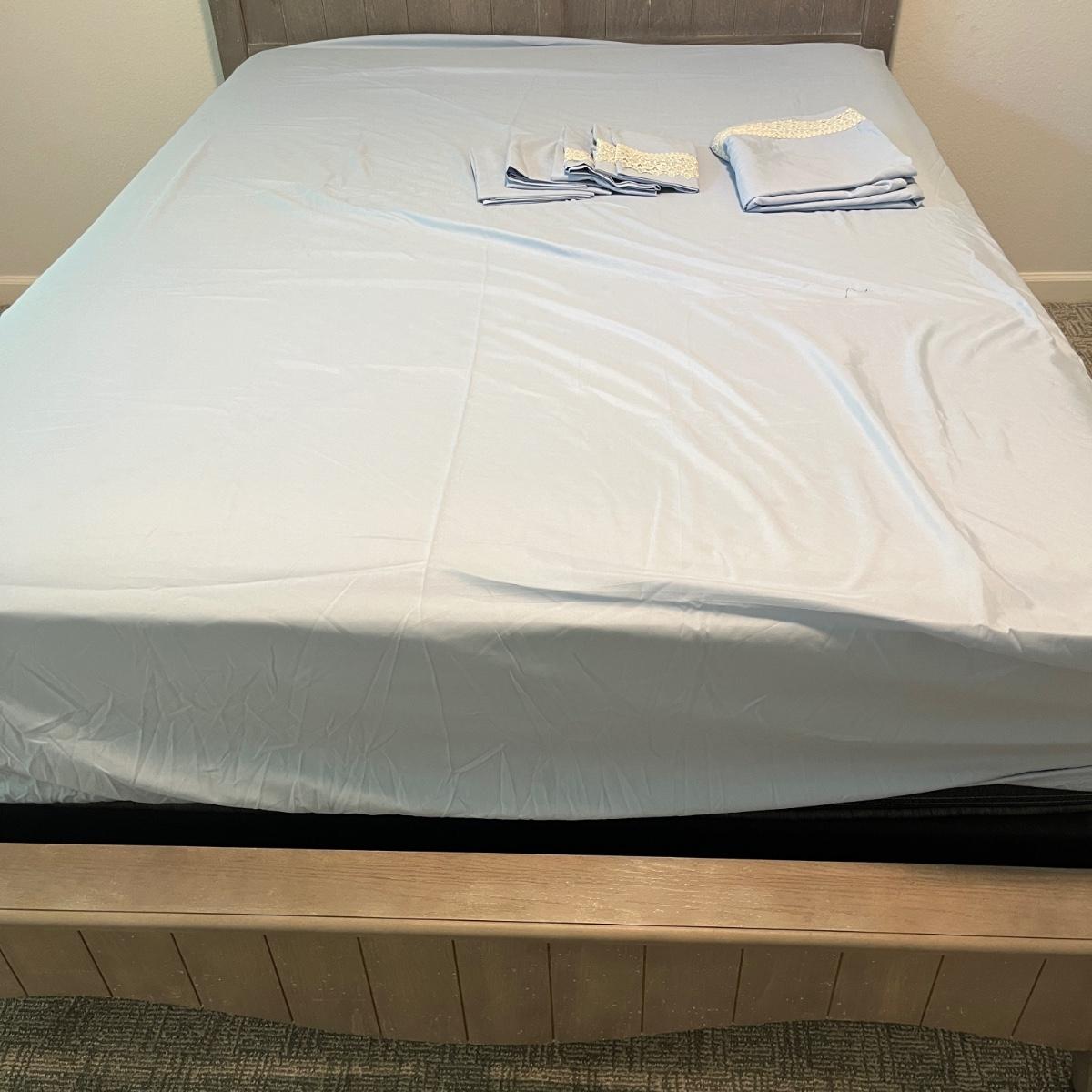 Lot includes queen bedspread with matching pillow shams, duvet, comforter, mattress pad, blue sheet set and two white sheet sets and more. All items are shown on queen bed. Bed not included but available in this sale.
