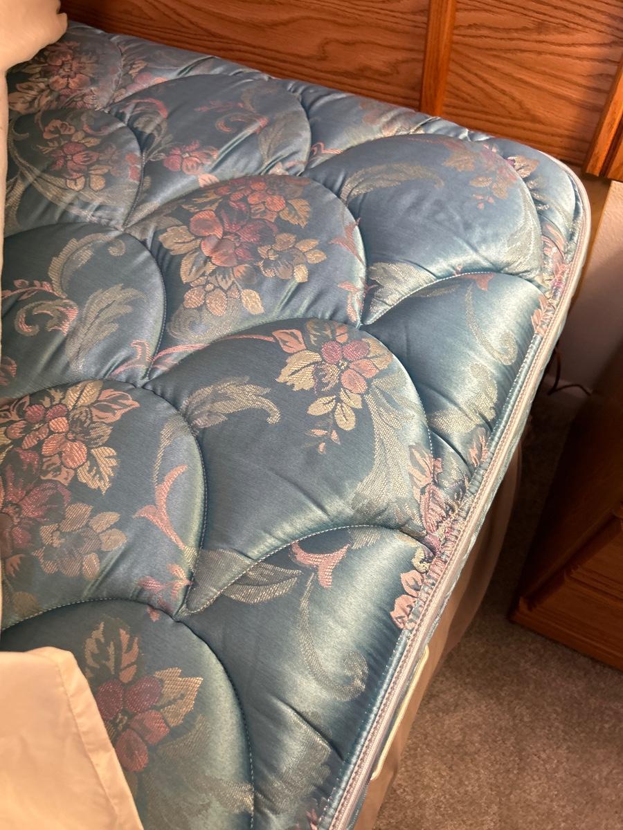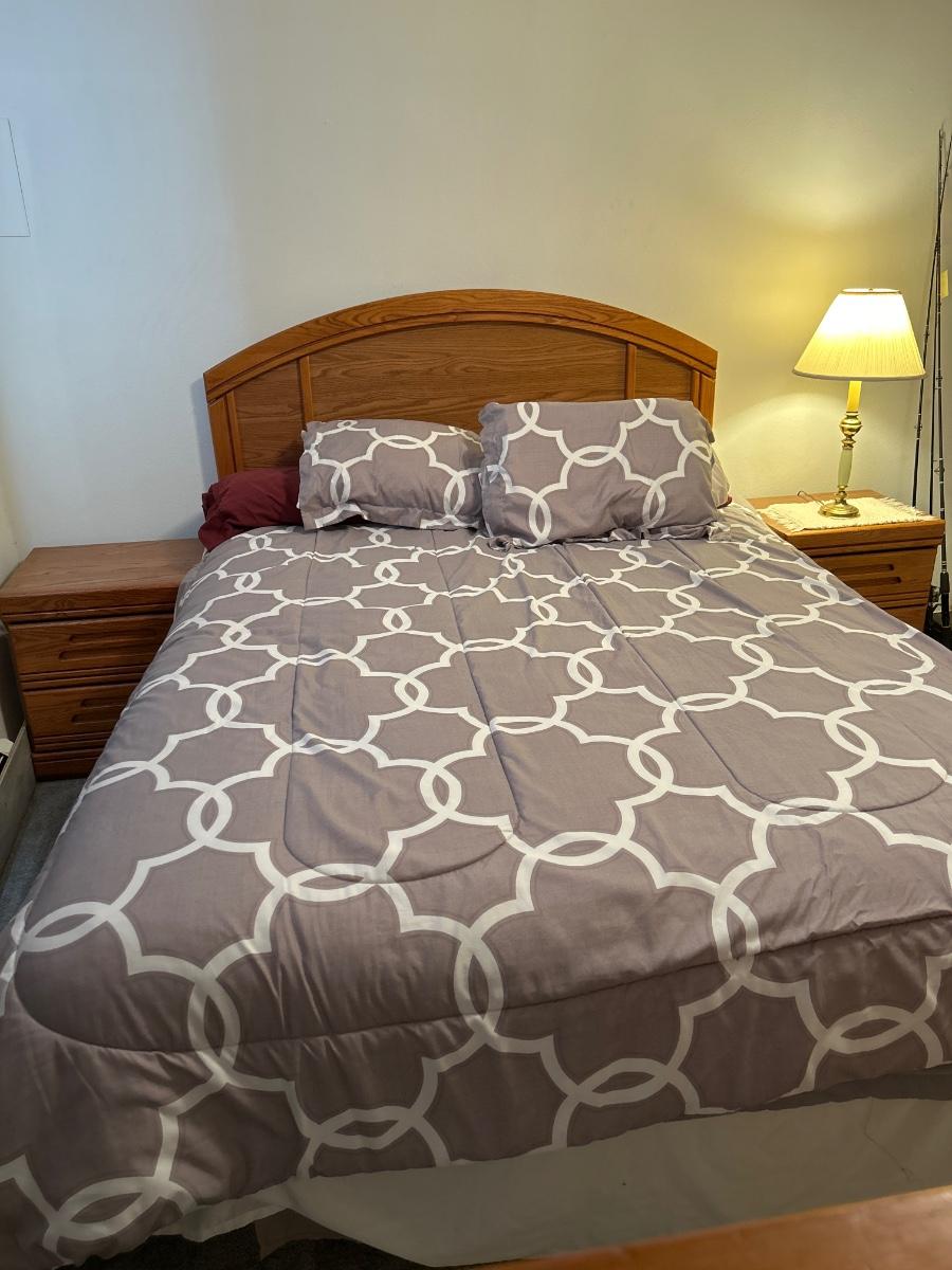 All bedding, mattress, frame, headboard, nightstands, & lamp.