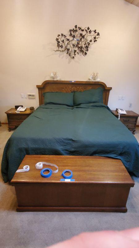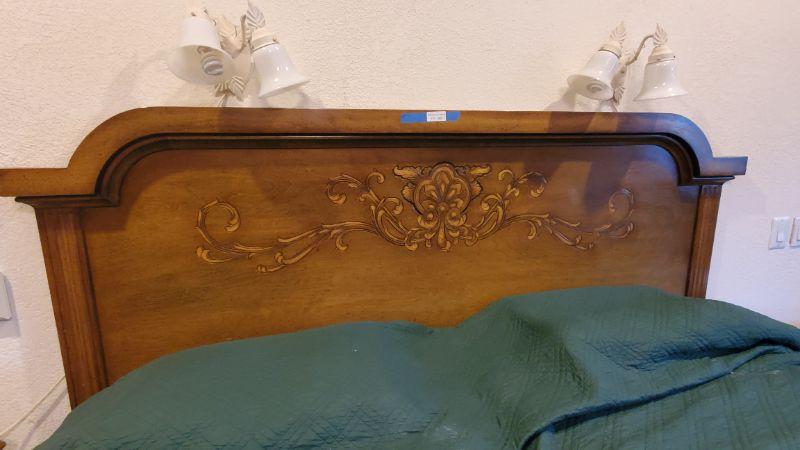 Includes headboard, mattress, foundation and nice stands. DOES NOT INCLUDE CHEST