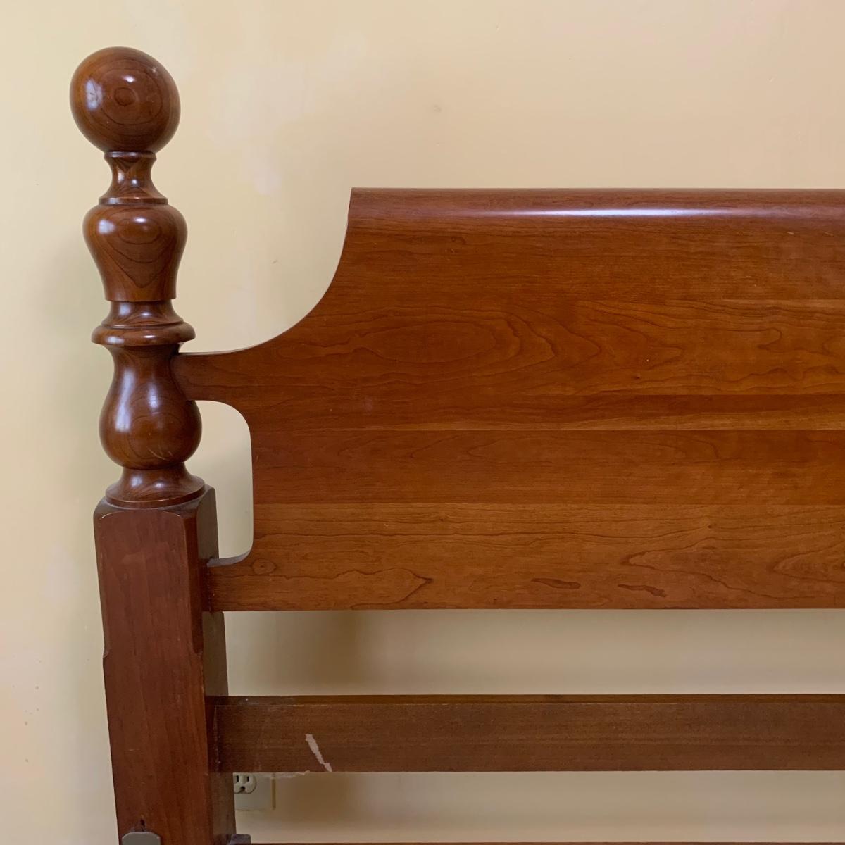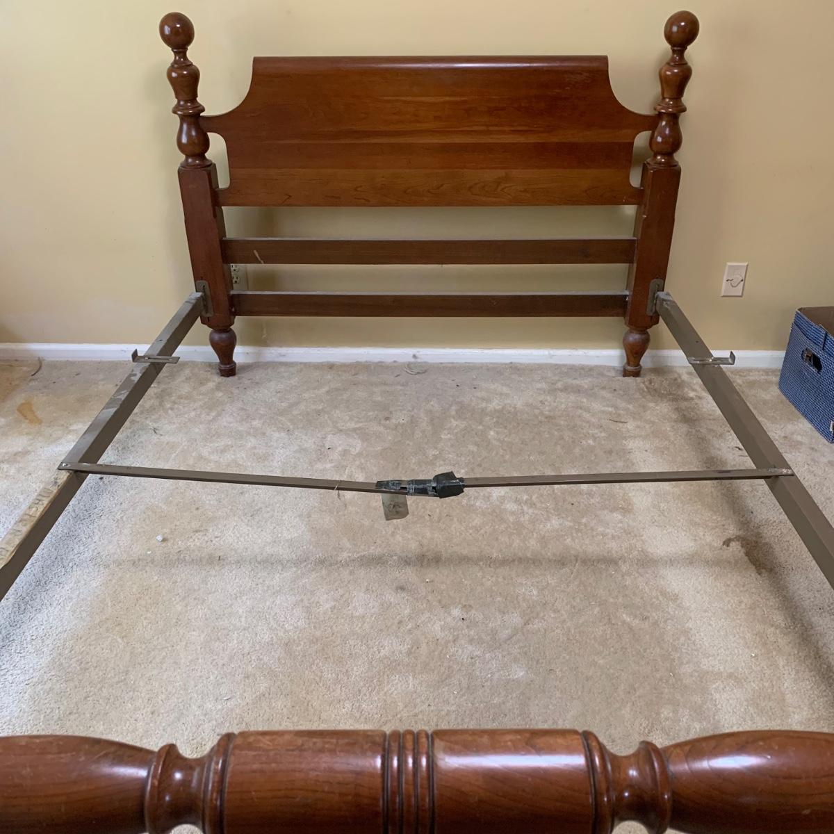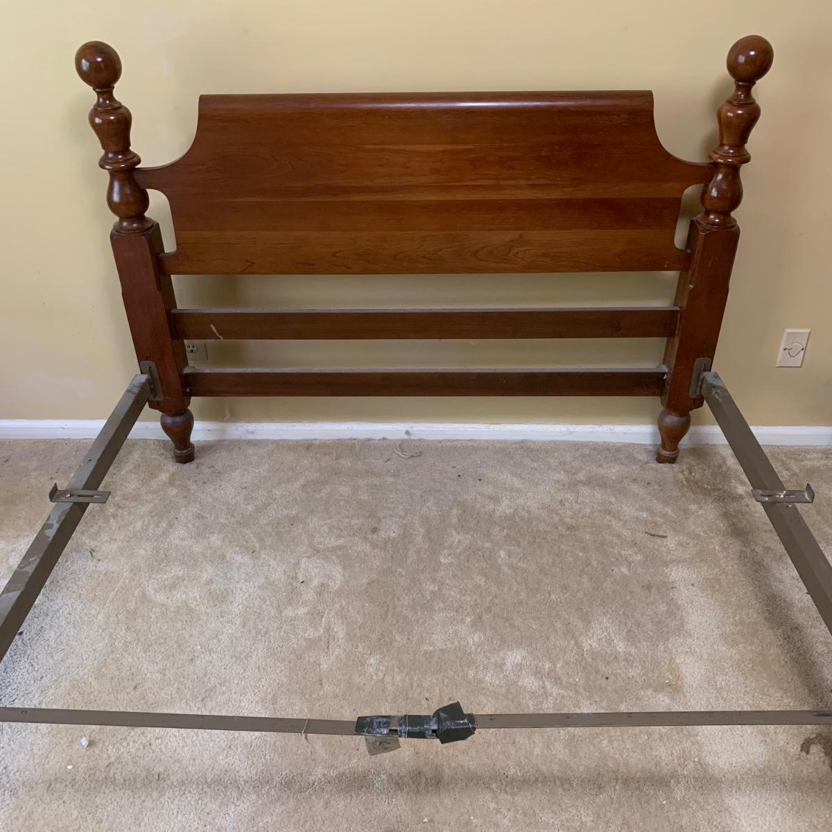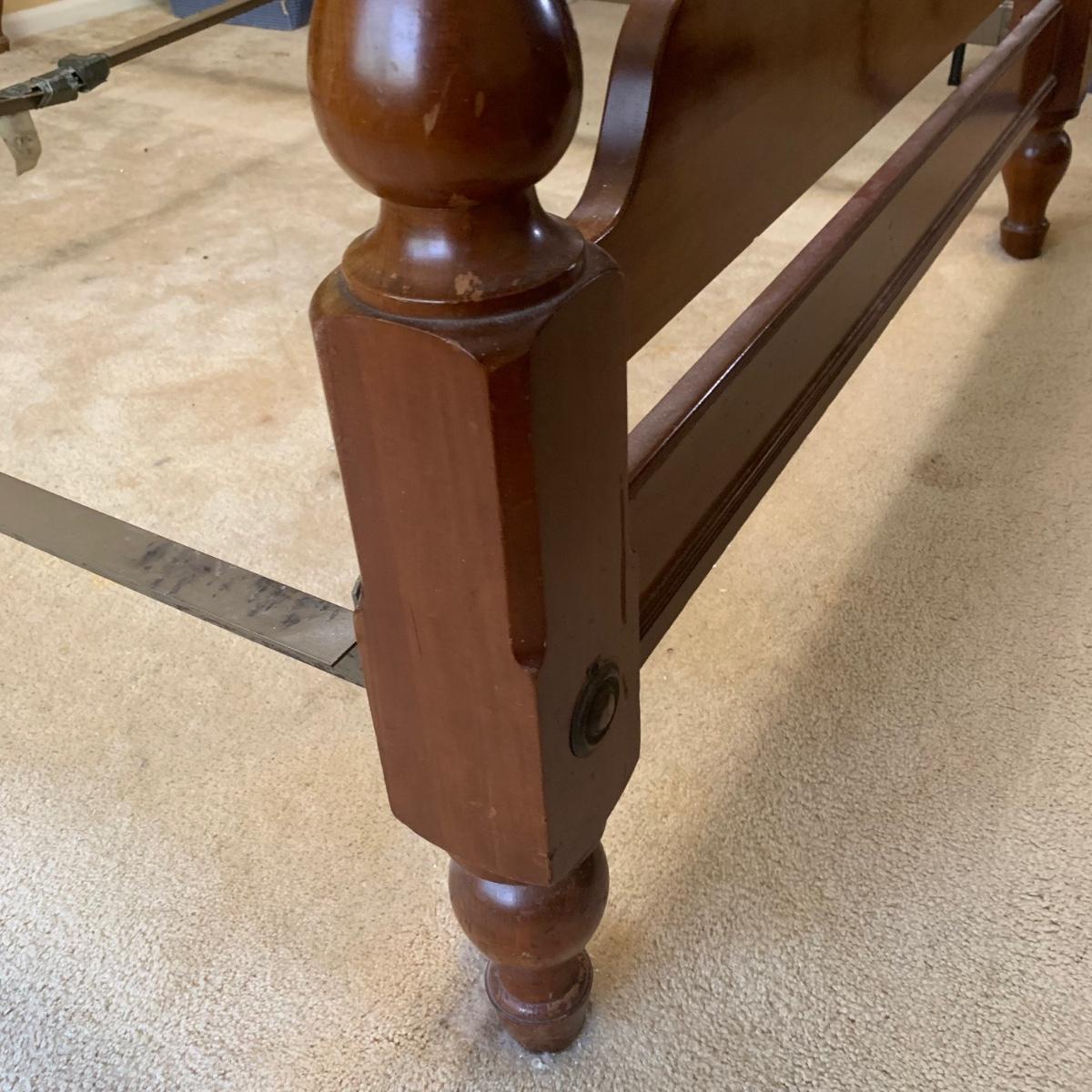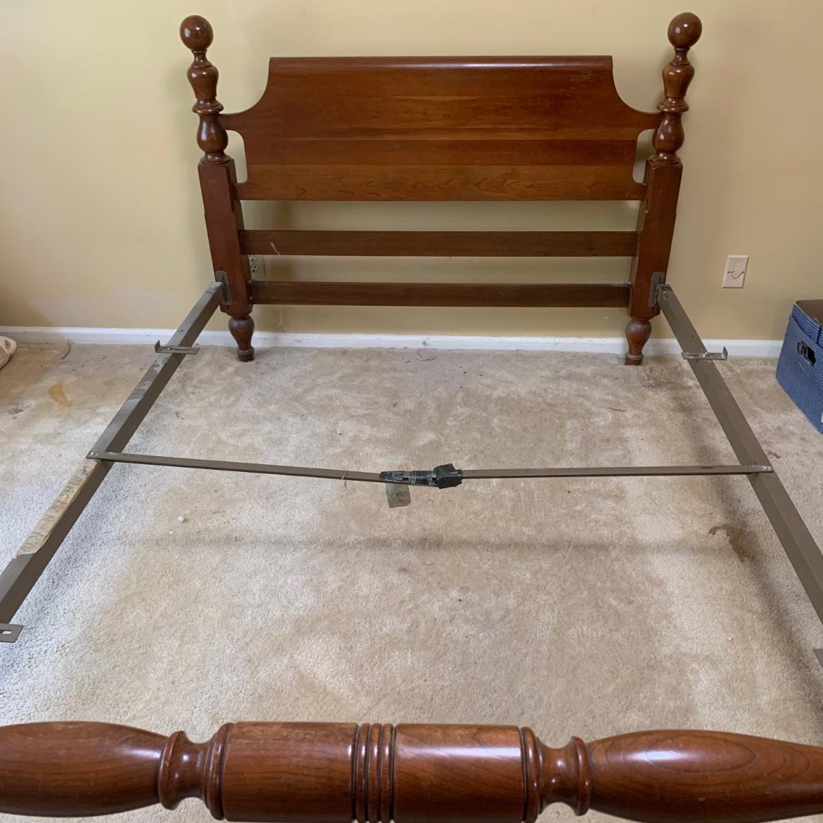 Queen cannonball style bed frame, with cherry stain and rails. Wood frame has a few blemishes, however it appear to be in good condition. Lot includes rails. Please note the middle slat has been joined by duct tape. This could easily be supported with additional slats. Frame measures, 59”L x 81.5”W. Headboard measures, 57”L x 43.5”H and footboard measures, 57”L x 36”H.