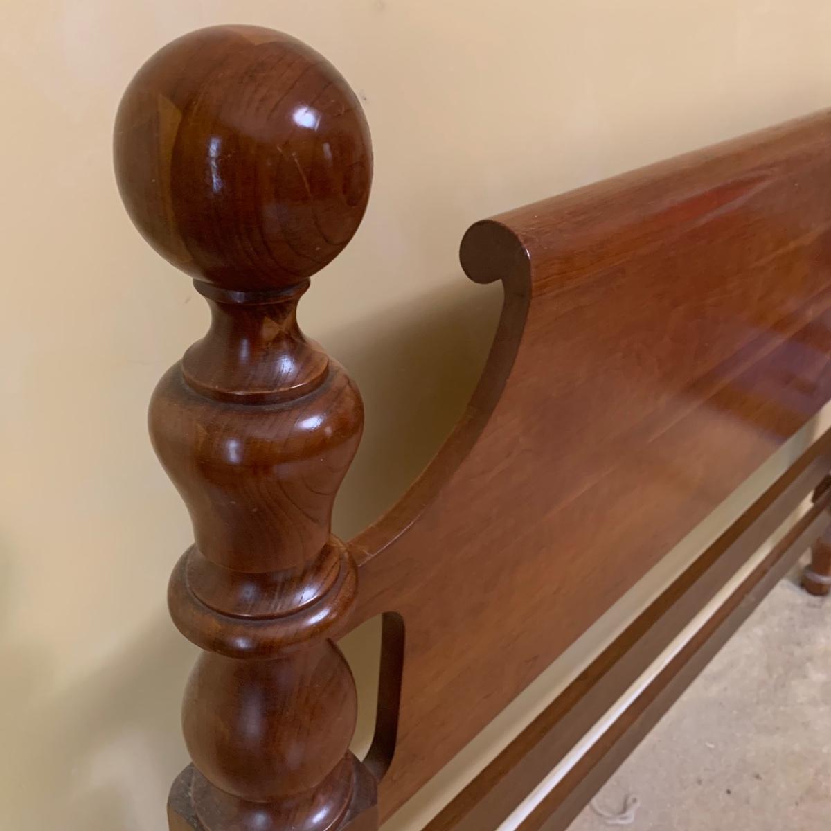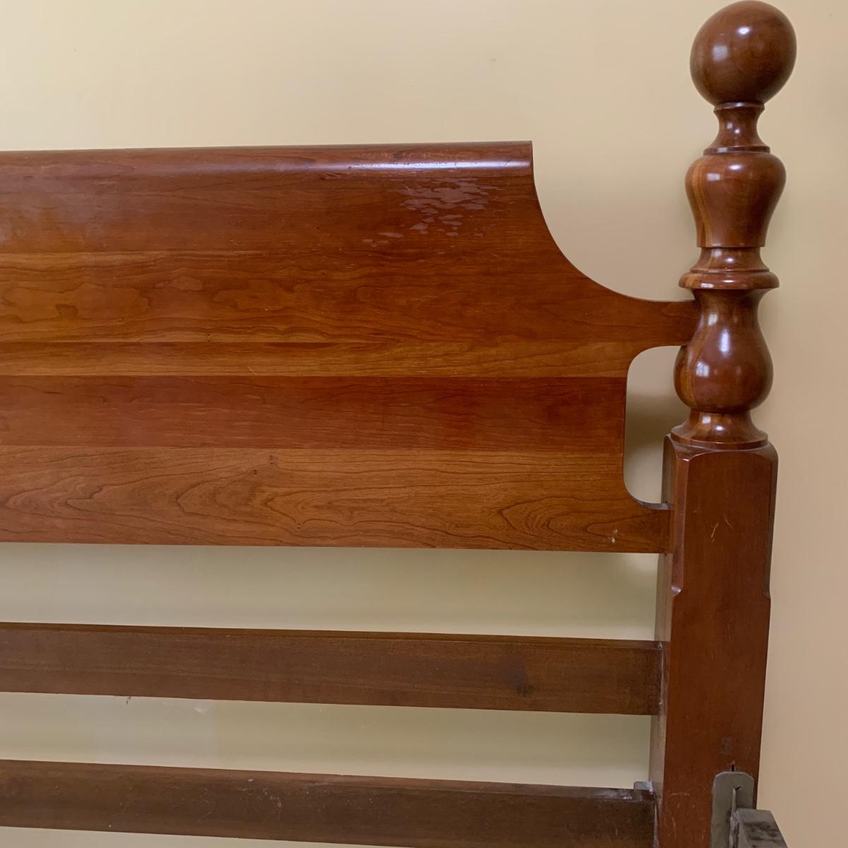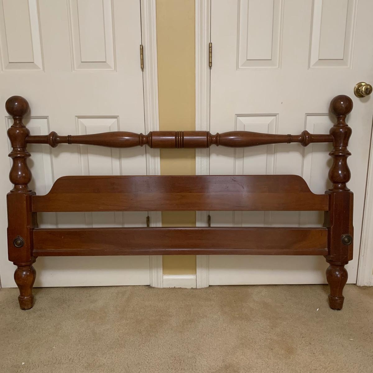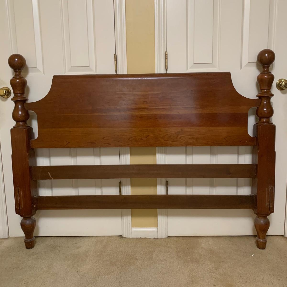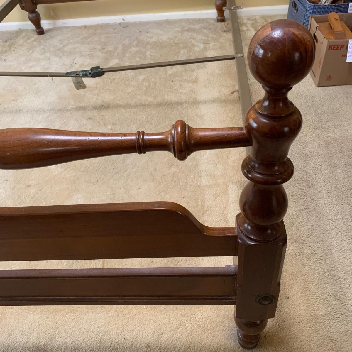 Queen cannonball style bed frame, with cherry stain and rails. Wood frame has a few blemishes, however it appear to be in good condition. Lot includes rails. Please note the middle slat has been joined by duct tape. This could easily be supported with additional slats. Frame measures, 59”L x 81.5”W. Headboard measures, 57”L x 43.5”H and footboard measures, 57”L x 36”H.