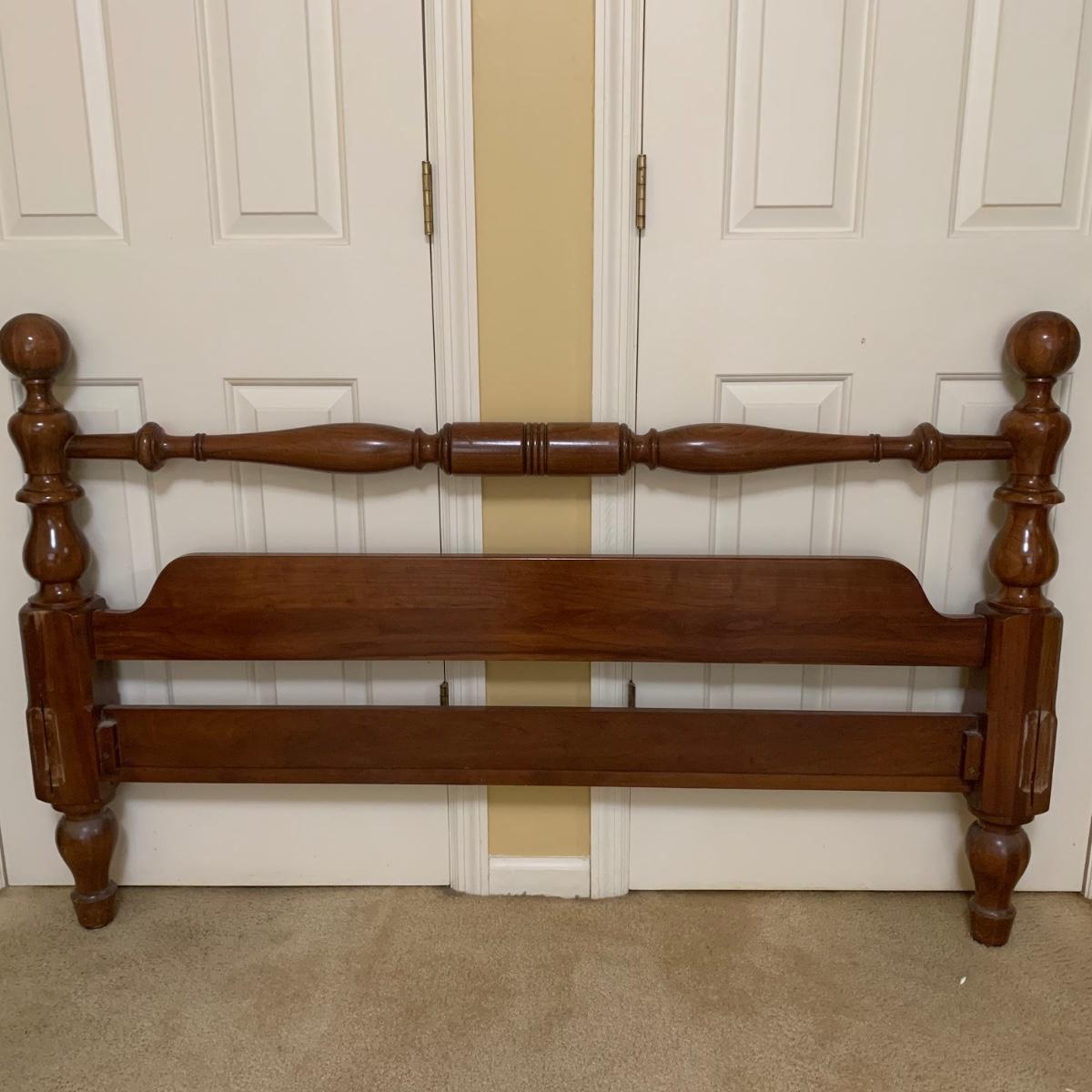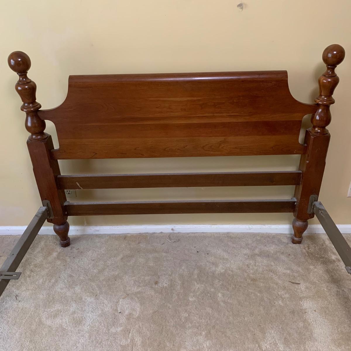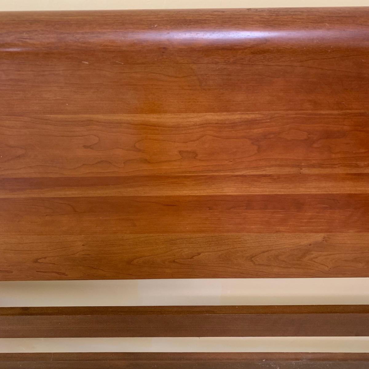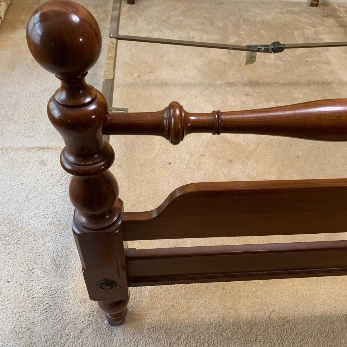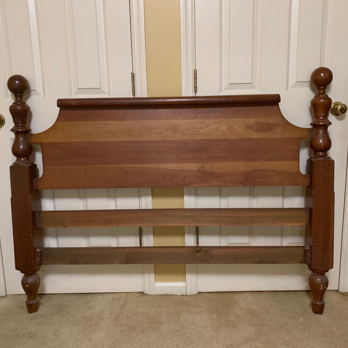 Queen cannonball style bed frame, with cherry stain and rails. Wood frame has a few blemishes, however it appear to be in good condition. Lot includes rails. Please note the middle slat has been joined by duct tape. This could easily be supported with additional slats. Frame measures, 59”L x 81.5”W. Headboard measures, 57”L x 43.5”H and footboard measures, 57”L x 36”H.
