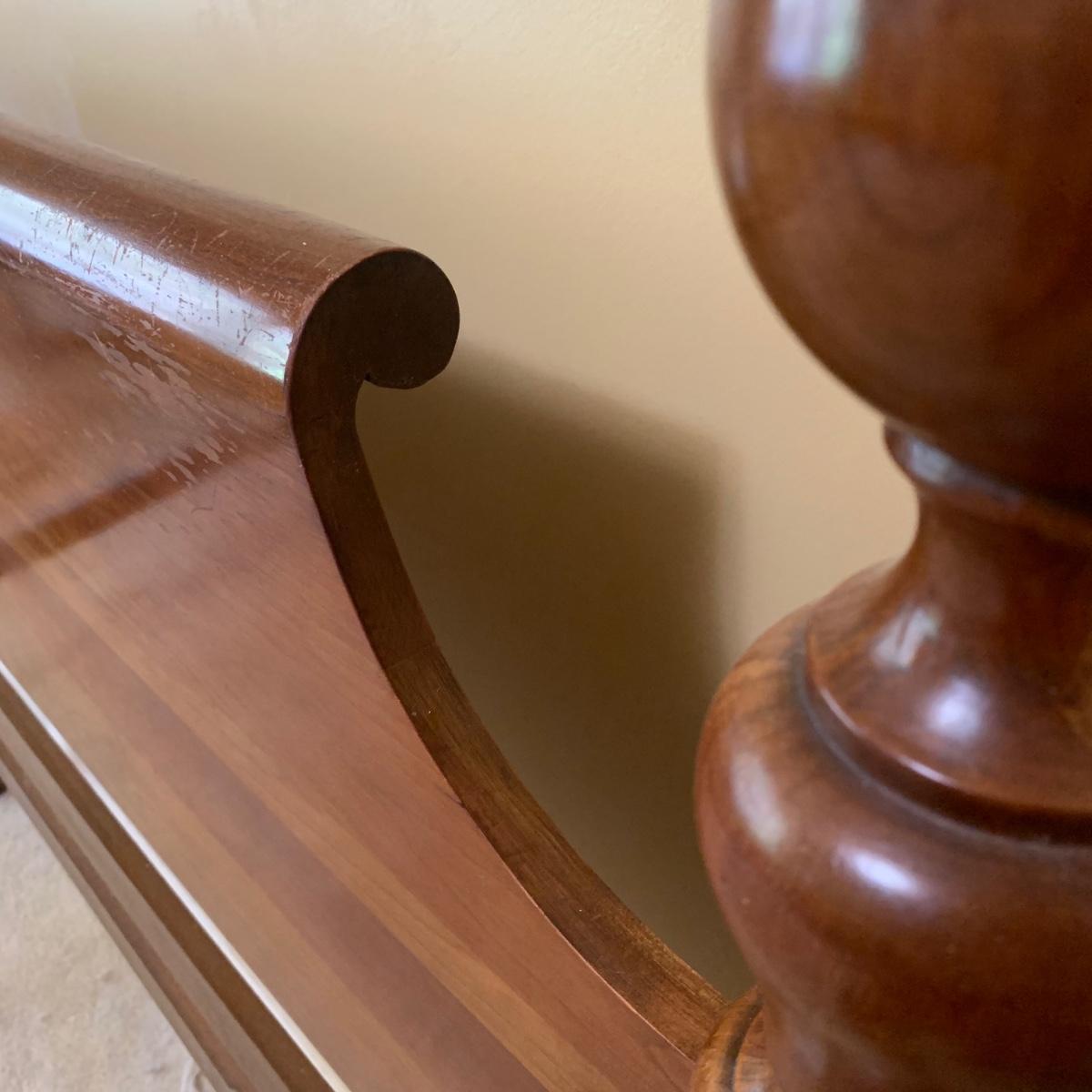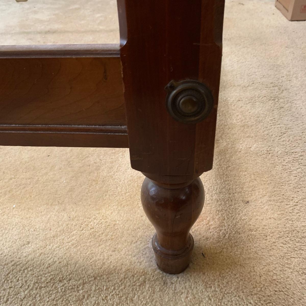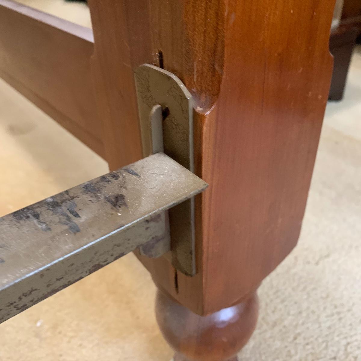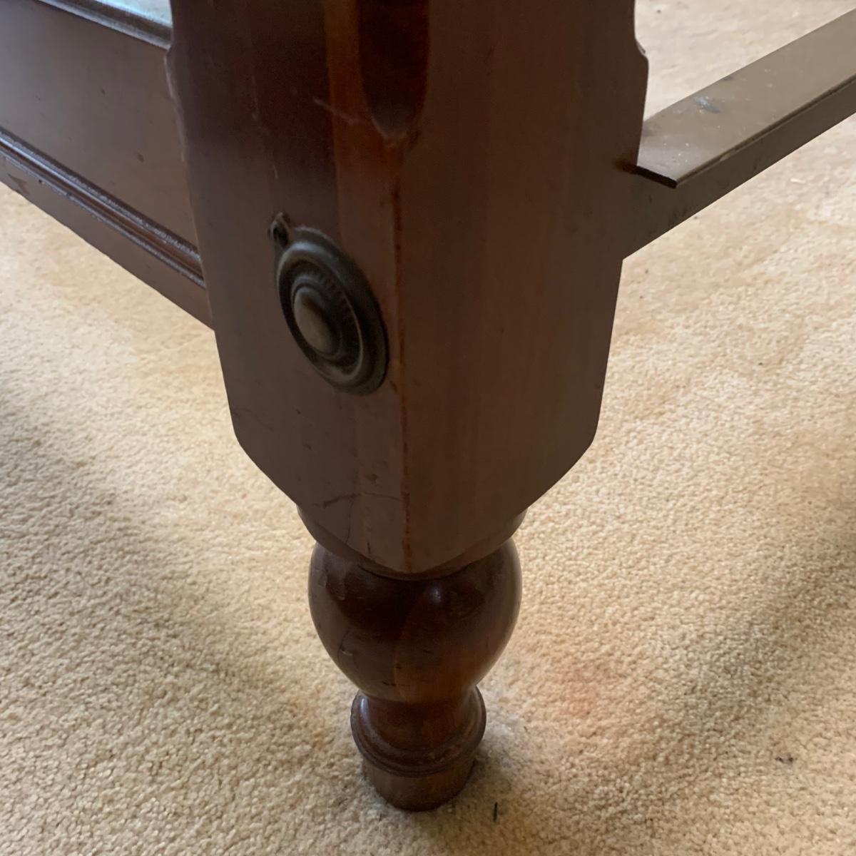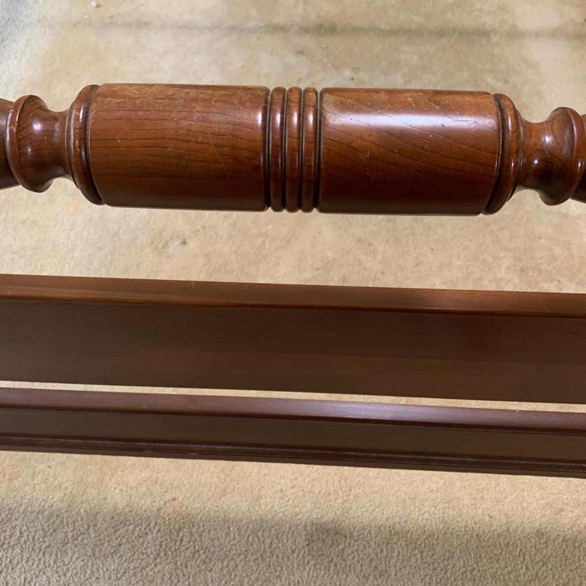 Queen cannonball style bed frame, with cherry stain and rails. Wood frame has a few blemishes, however it appear to be in good condition. Lot includes rails. Please note the middle slat has been joined by duct tape. This could easily be supported with additional slats. Frame measures, 59”L x 81.5”W. Headboard measures, 57”L x 43.5”H and footboard measures, 57”L x 36”H.
