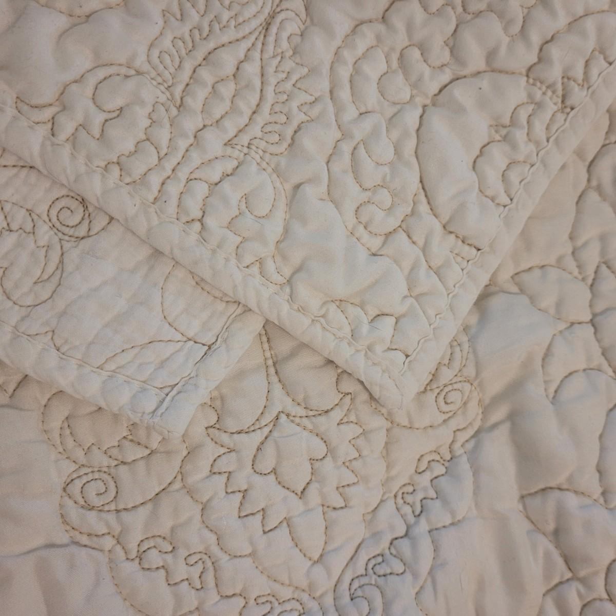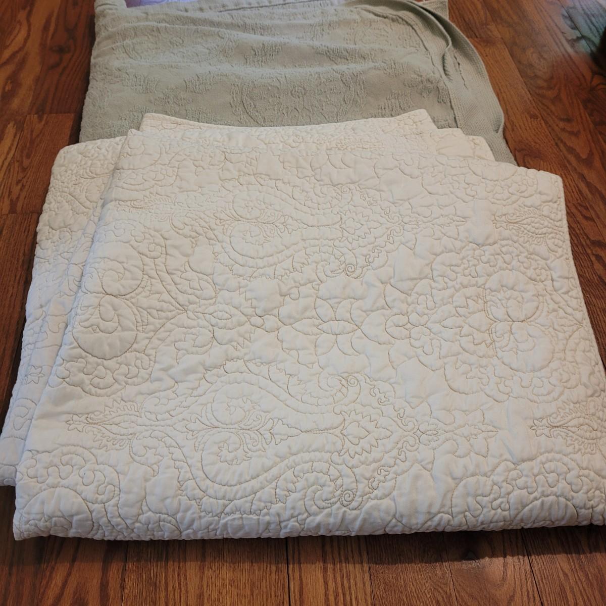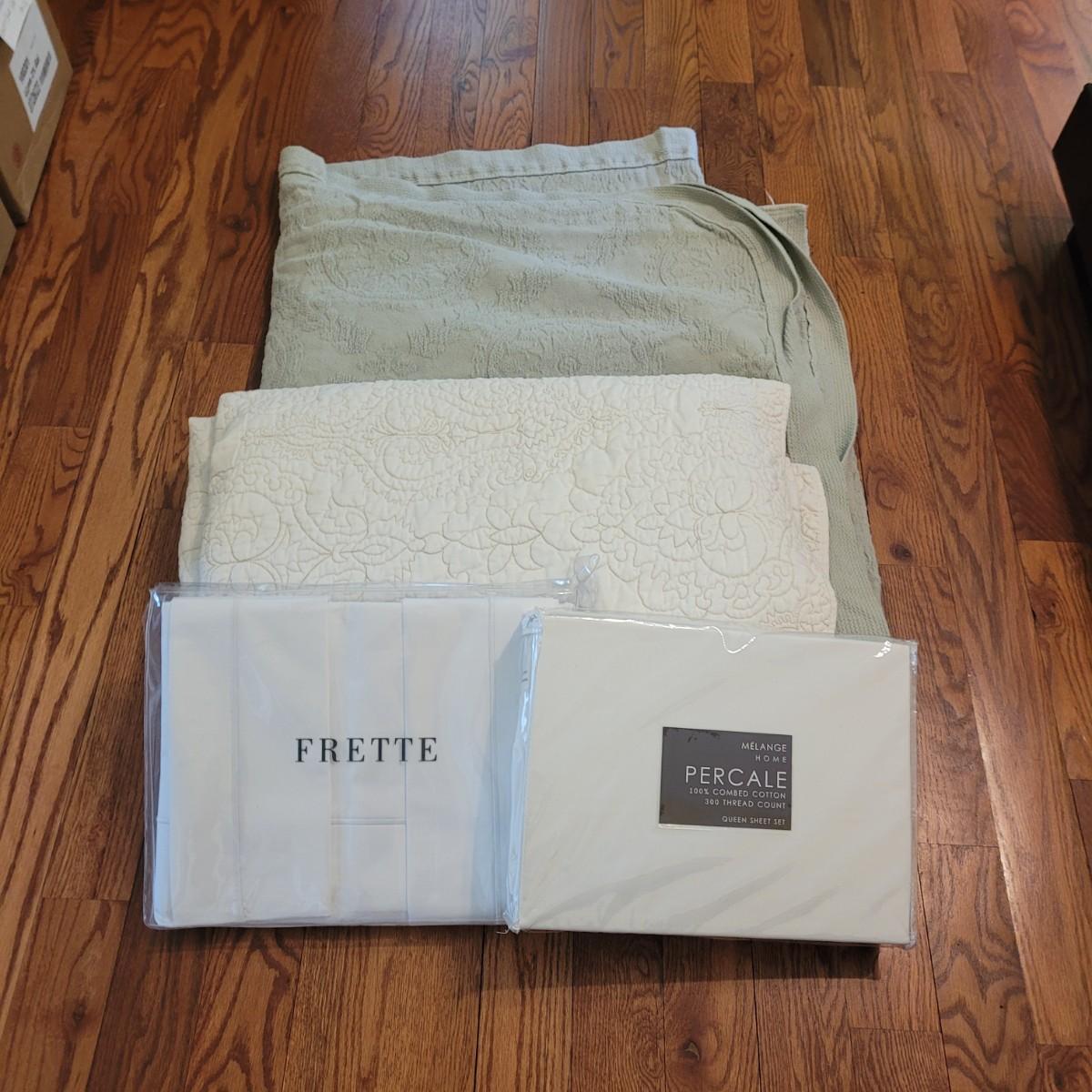 This queen bedding lot includes a sage green coverlet, a cream quilted coverlet, and two sheet sets. Shipping available.