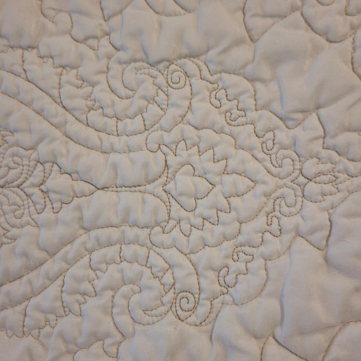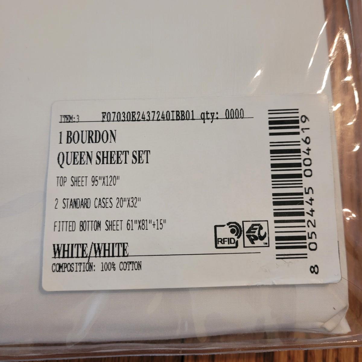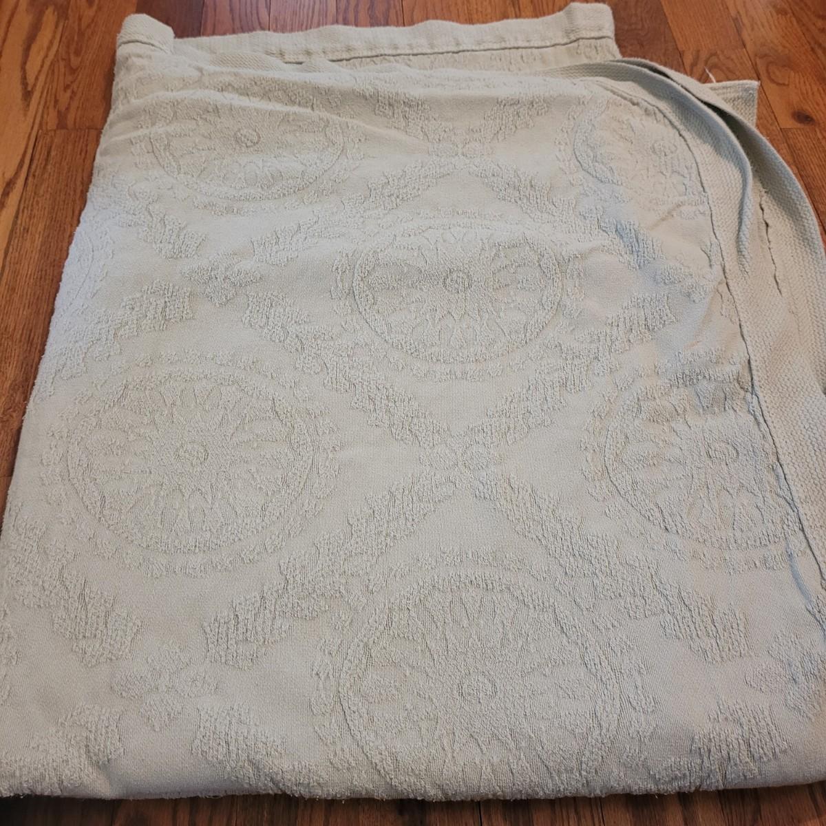 This queen bedding lot includes a sage green coverlet, a cream quilted coverlet, and two sheet sets. Shipping available.
