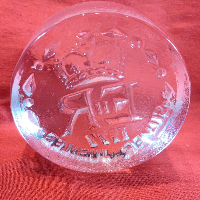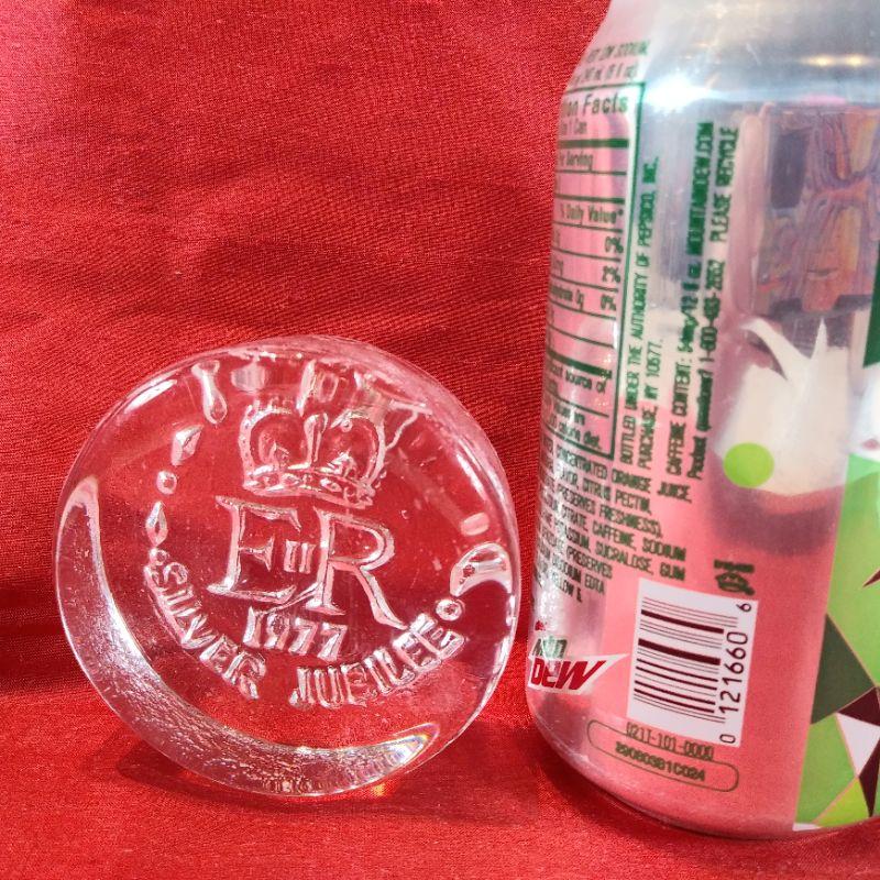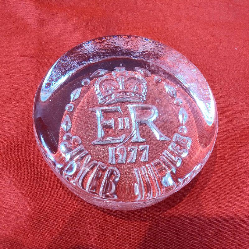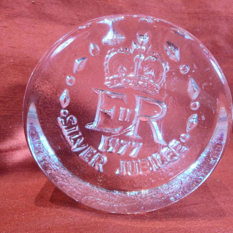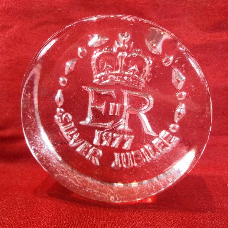 This fun little Glass Paperweight is perfect for the anglophile in your life. It is embossed with a design celebrating the Silver Jubilee of Queen Elizabeth's Reign on the English throne. Dated 1977. It is 3-inches in diameter X 1 1/4-inches tall.