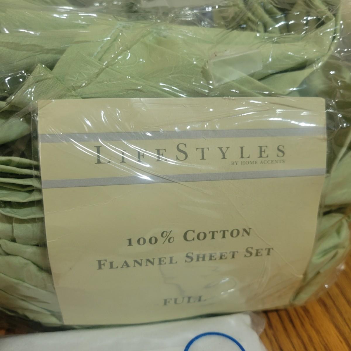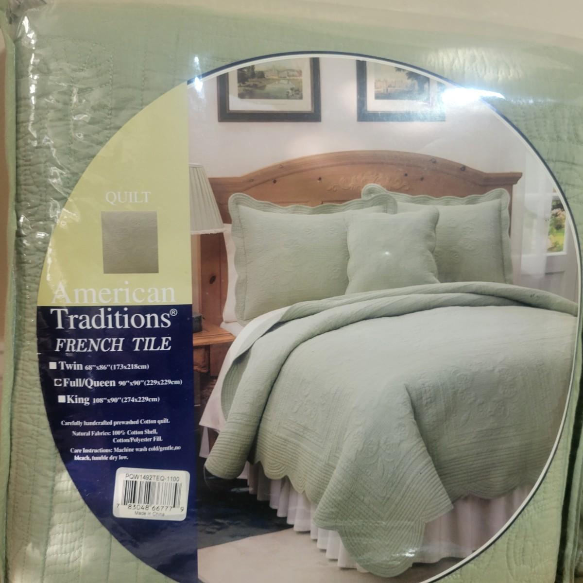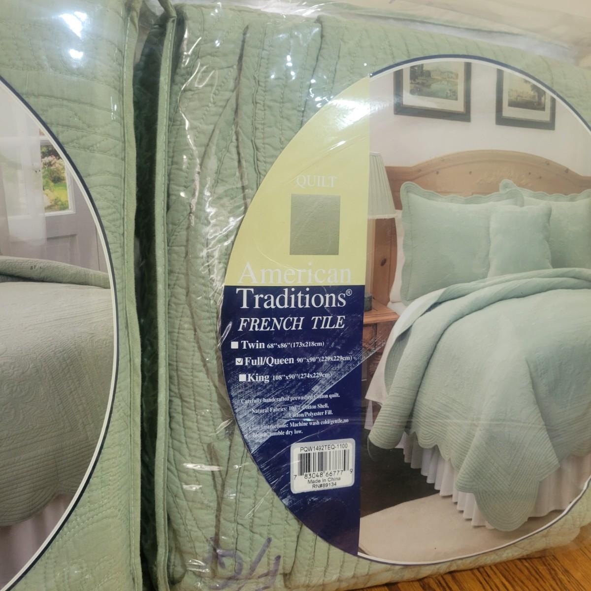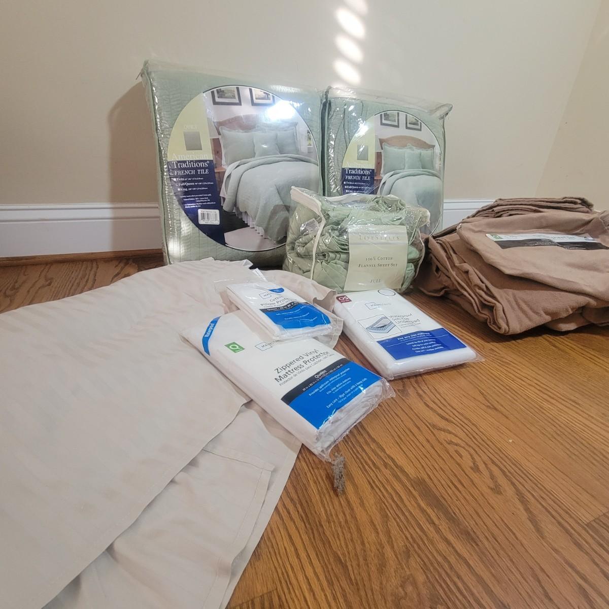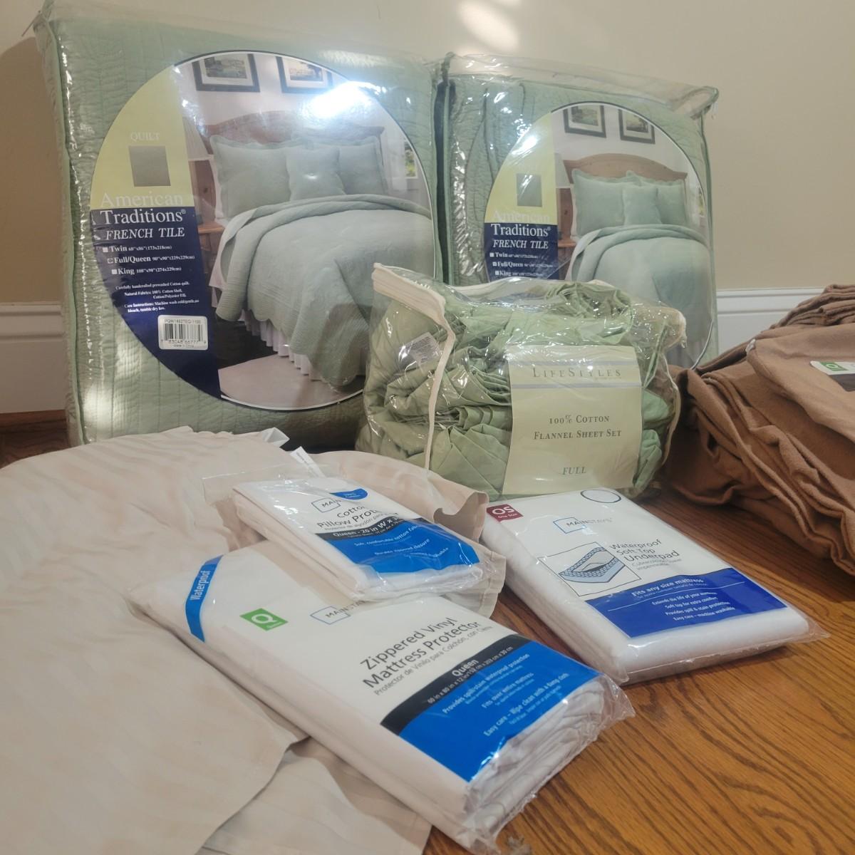 2 Americam Traditions full/queen quilts new and in original packaging. 1 set of Lifestyles Full sized sheets in original packaging, 1 queens sized flannel sheet set and a queen sized bed skirt. Also includes cotton pillow case, queen mattress protector and a waterproof under pad. Shipping available