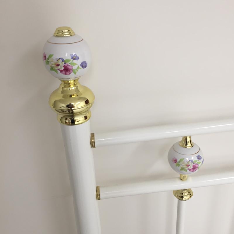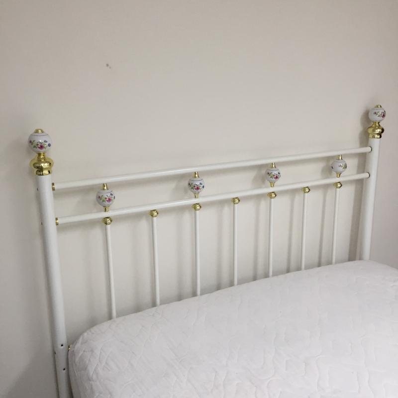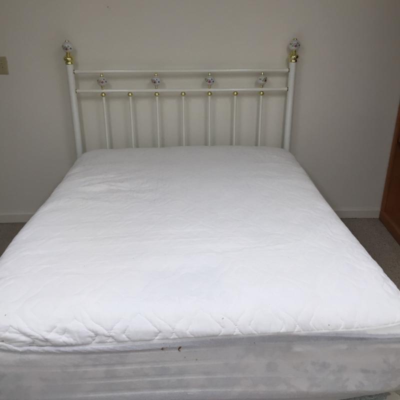 Queen sized headboard with flowered decoration and frame. Mattress Available. Headboard Measures 60” x 53”.