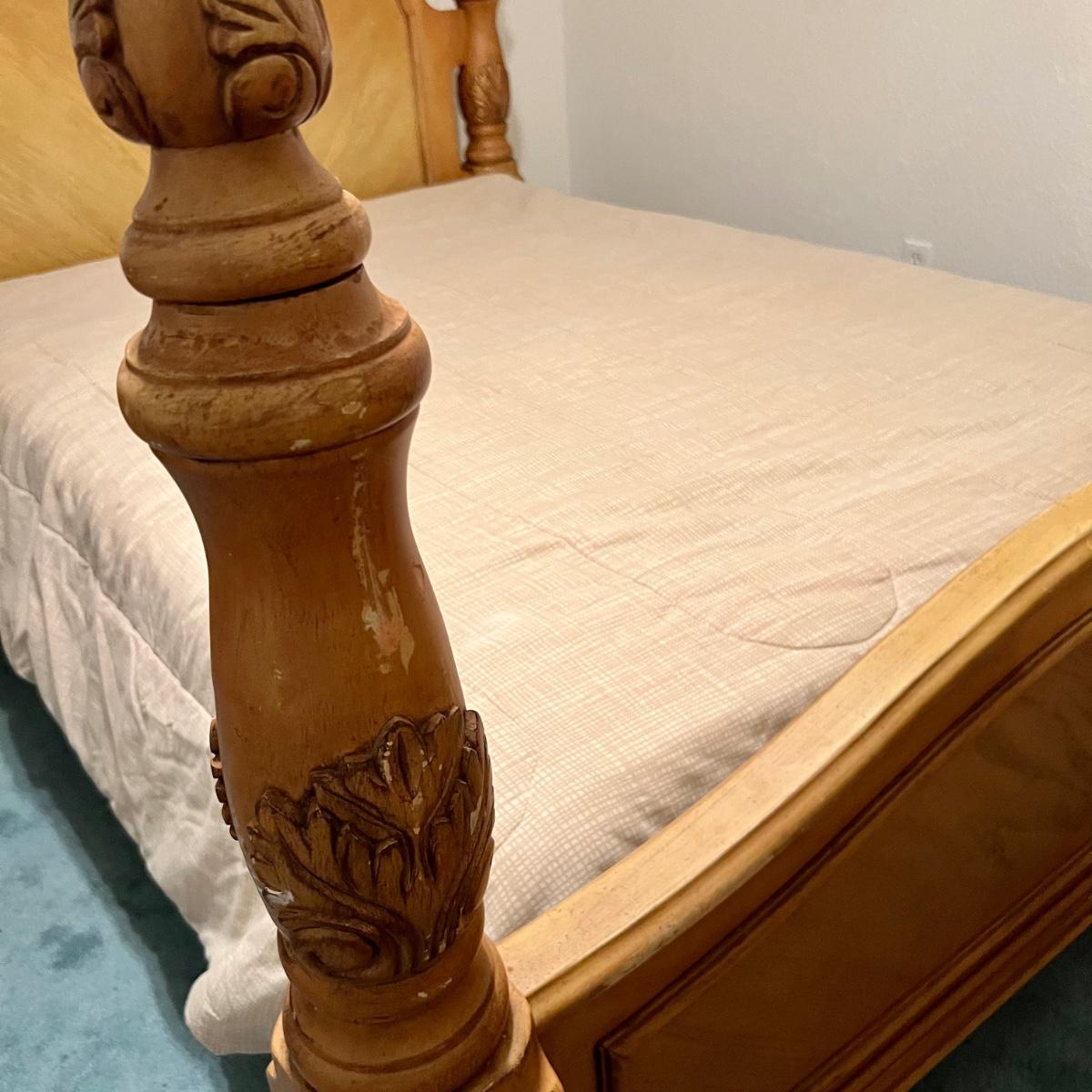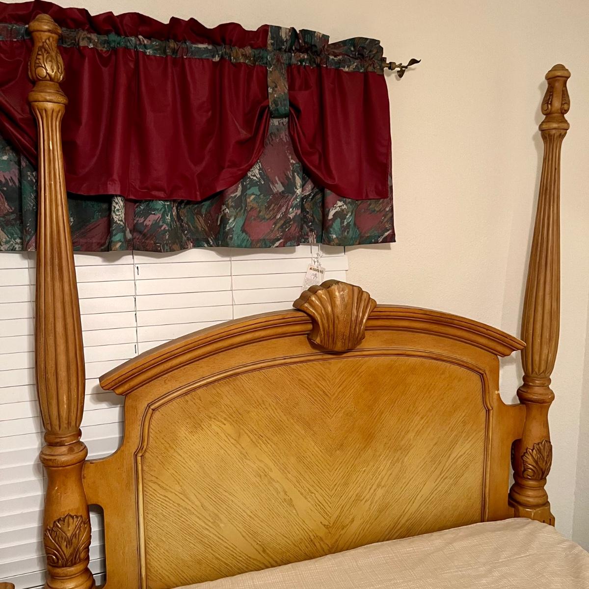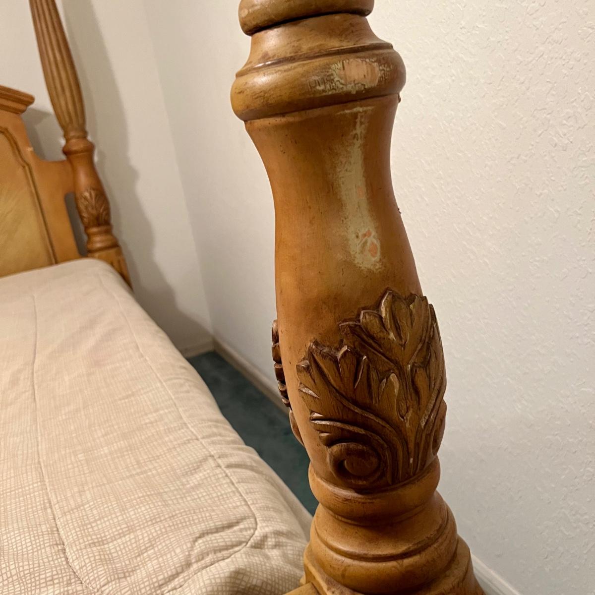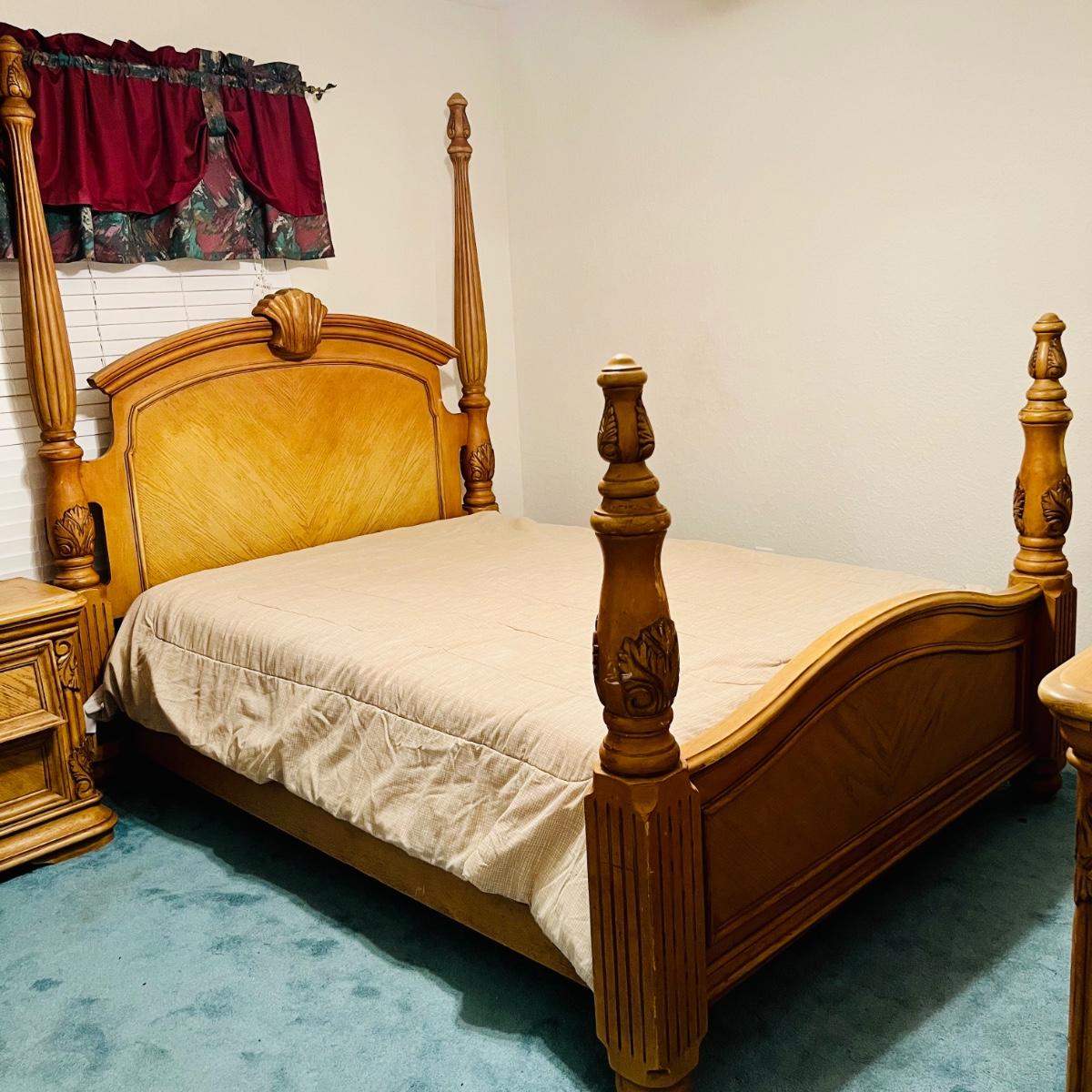 Honey Oak Wood queen size bed-frame, headboard and footboard. Detailed carvings on posts with decorative shell on headboard. Frame meas. 64”w. Posts at head of bed meas. 79”h with posts at foot meas. 48”h. Mattress currently sits 23” off the ground. Some wear on posts. Local pickup only. Matching dresser and nightstands available. Furniture is heavy. Please bring help to move.