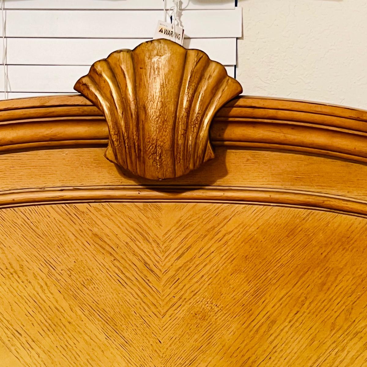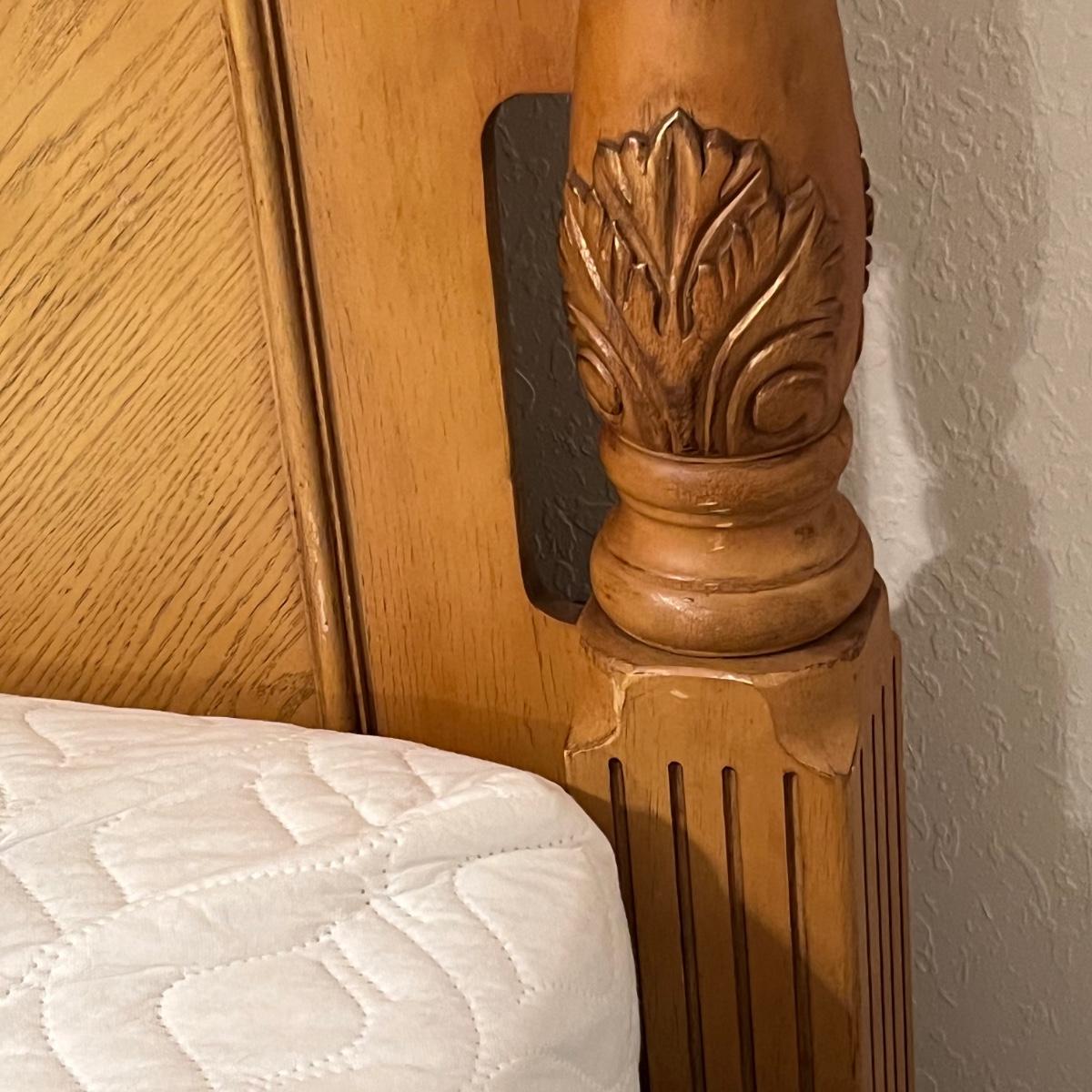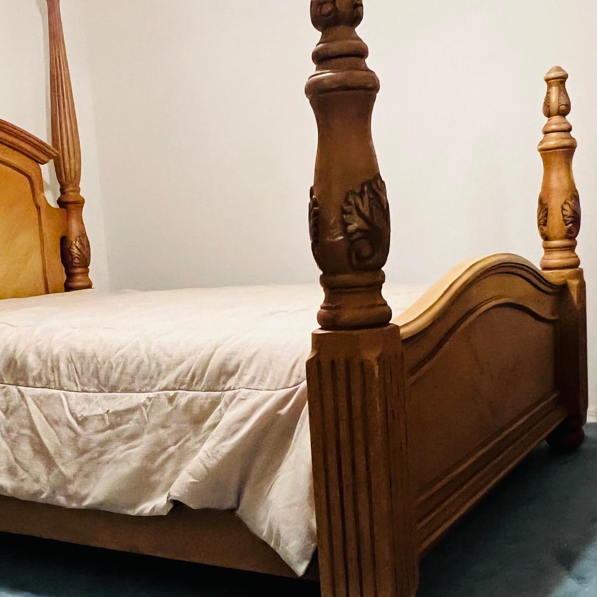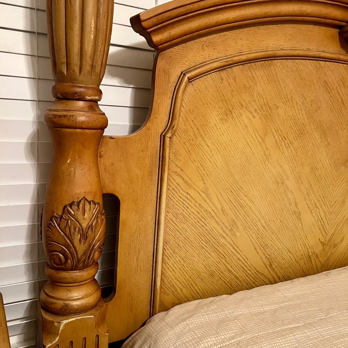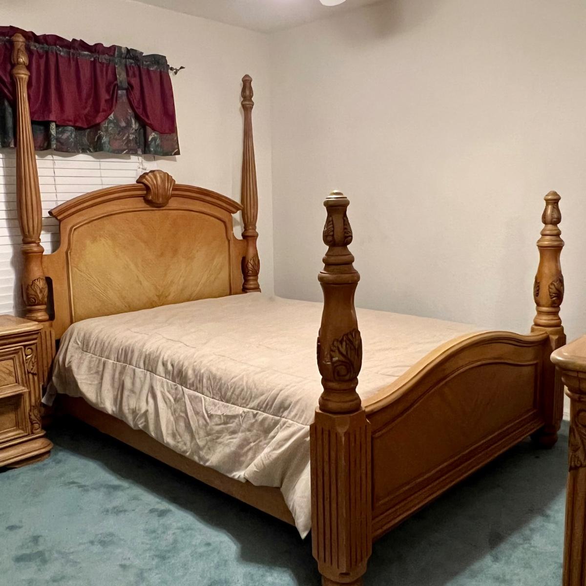 Honey Oak Wood queen size bed-frame, headboard and footboard. Detailed carvings on posts with decorative shell on headboard. Frame meas. 64”w. Posts at head of bed meas. 79”h with posts at foot meas. 48”h. Mattress currently sits 23” off the ground. Some wear on posts. Local pickup only. Matching dresser and nightstands available. Furniture is heavy. Please bring help to move.