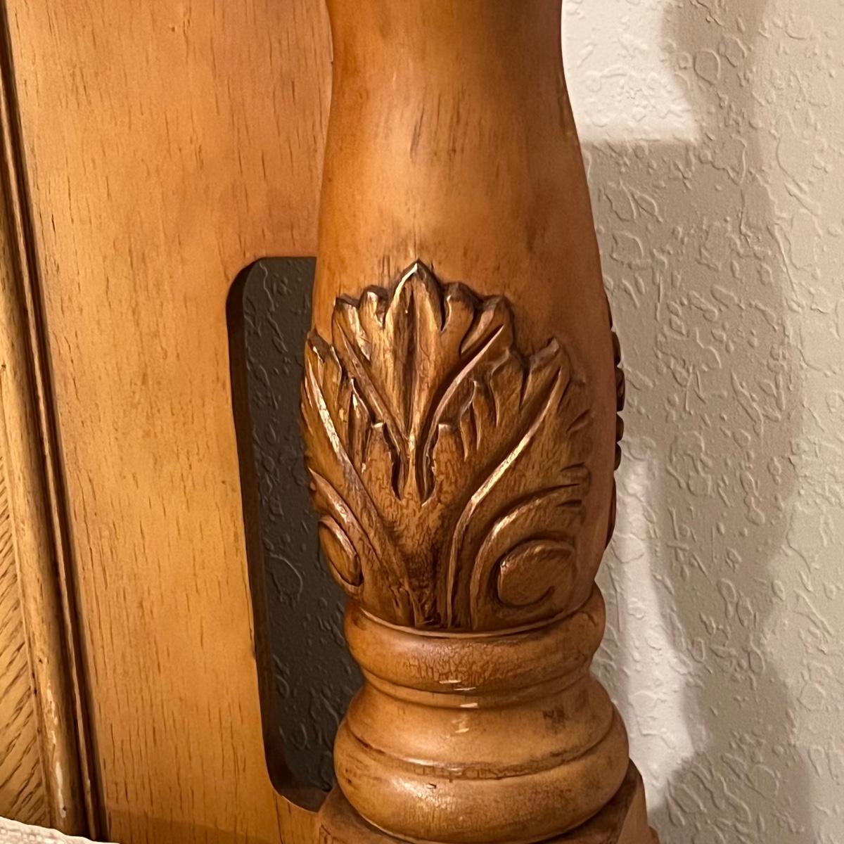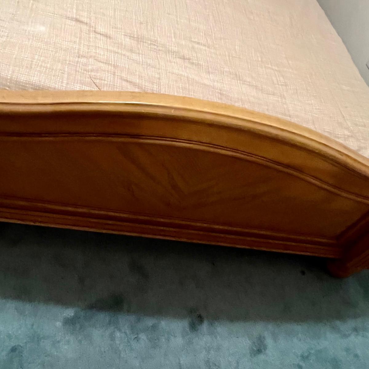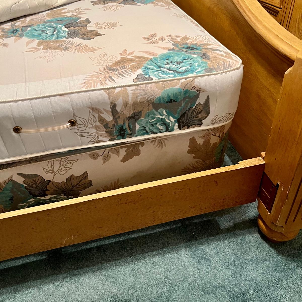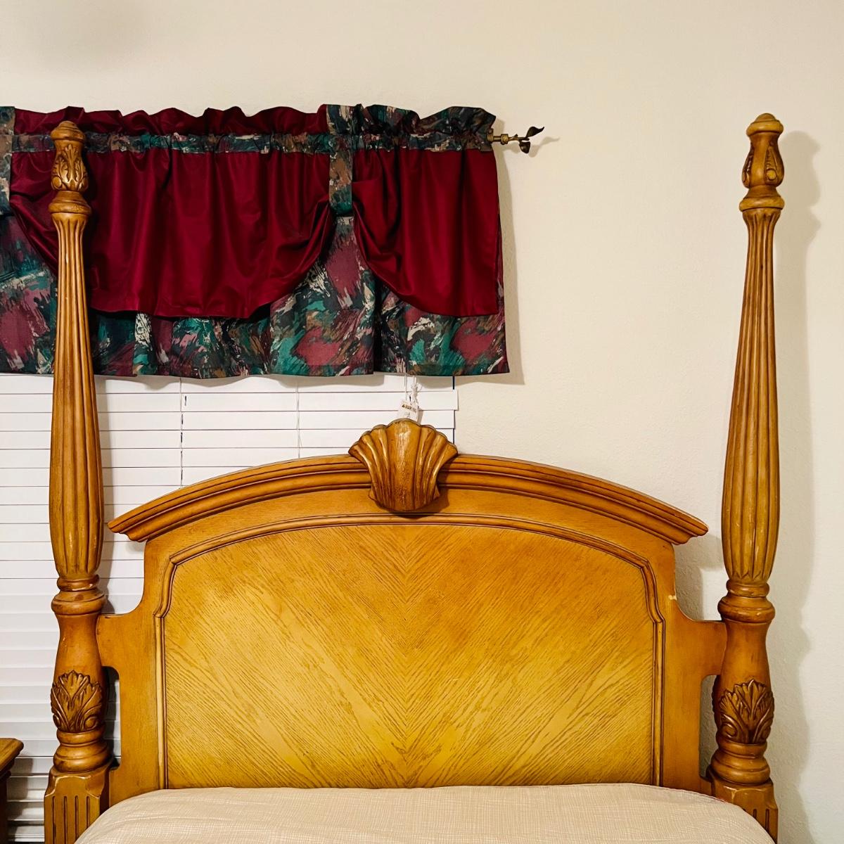 Honey Oak Wood queen size bed-frame, headboard and footboard. Detailed carvings on posts with decorative shell on headboard. Frame meas. 64”w. Posts at head of bed meas. 79”h with posts at foot meas. 48”h. Mattress currently sits 23” off the ground. Some wear on posts. Local pickup only. Matching dresser and nightstands available. Furniture is heavy. Please bring help to move.