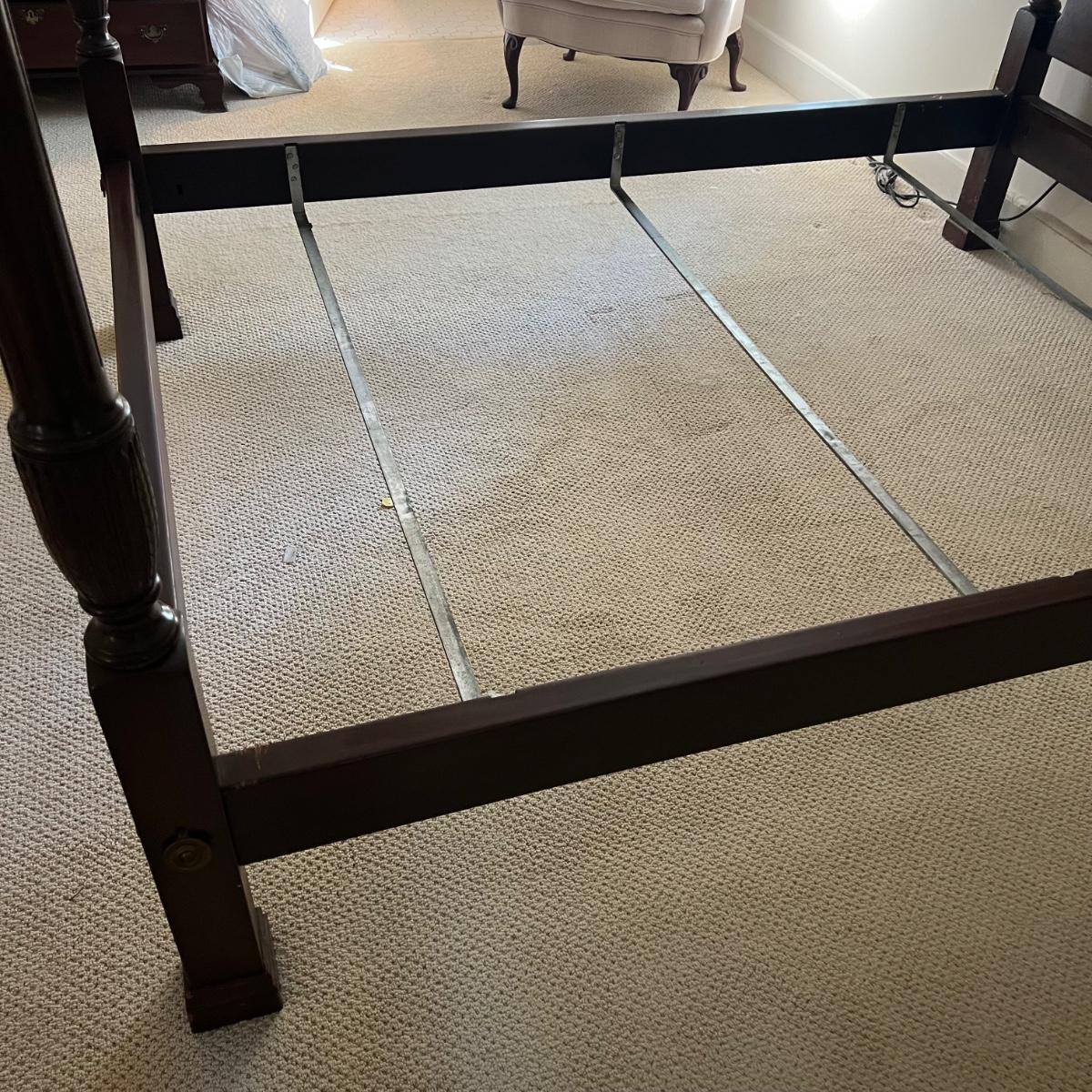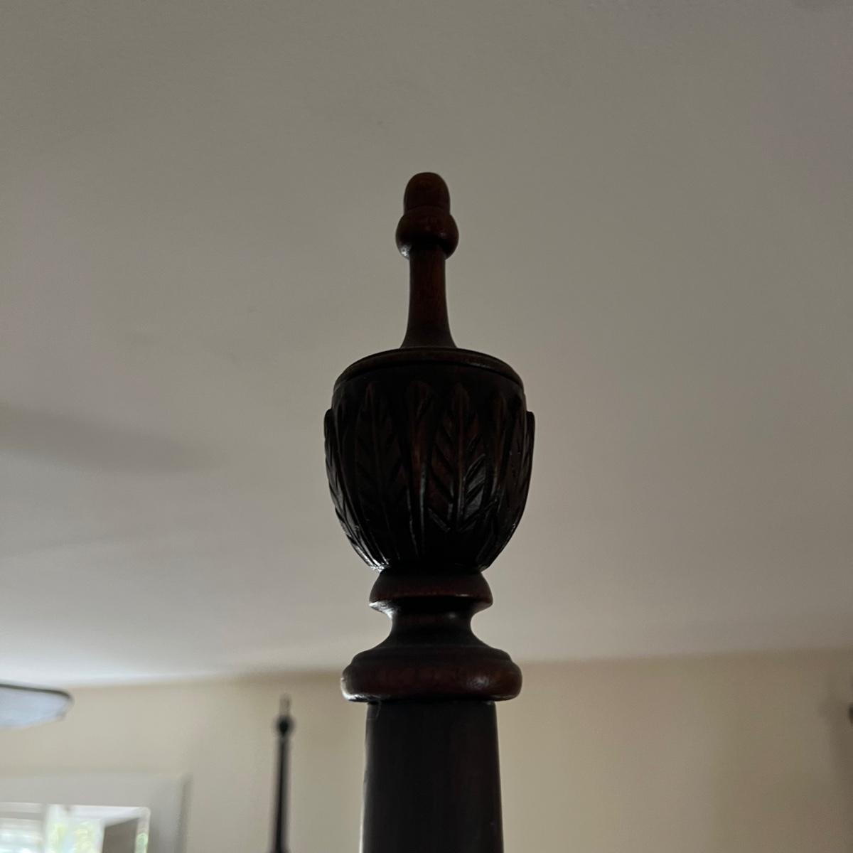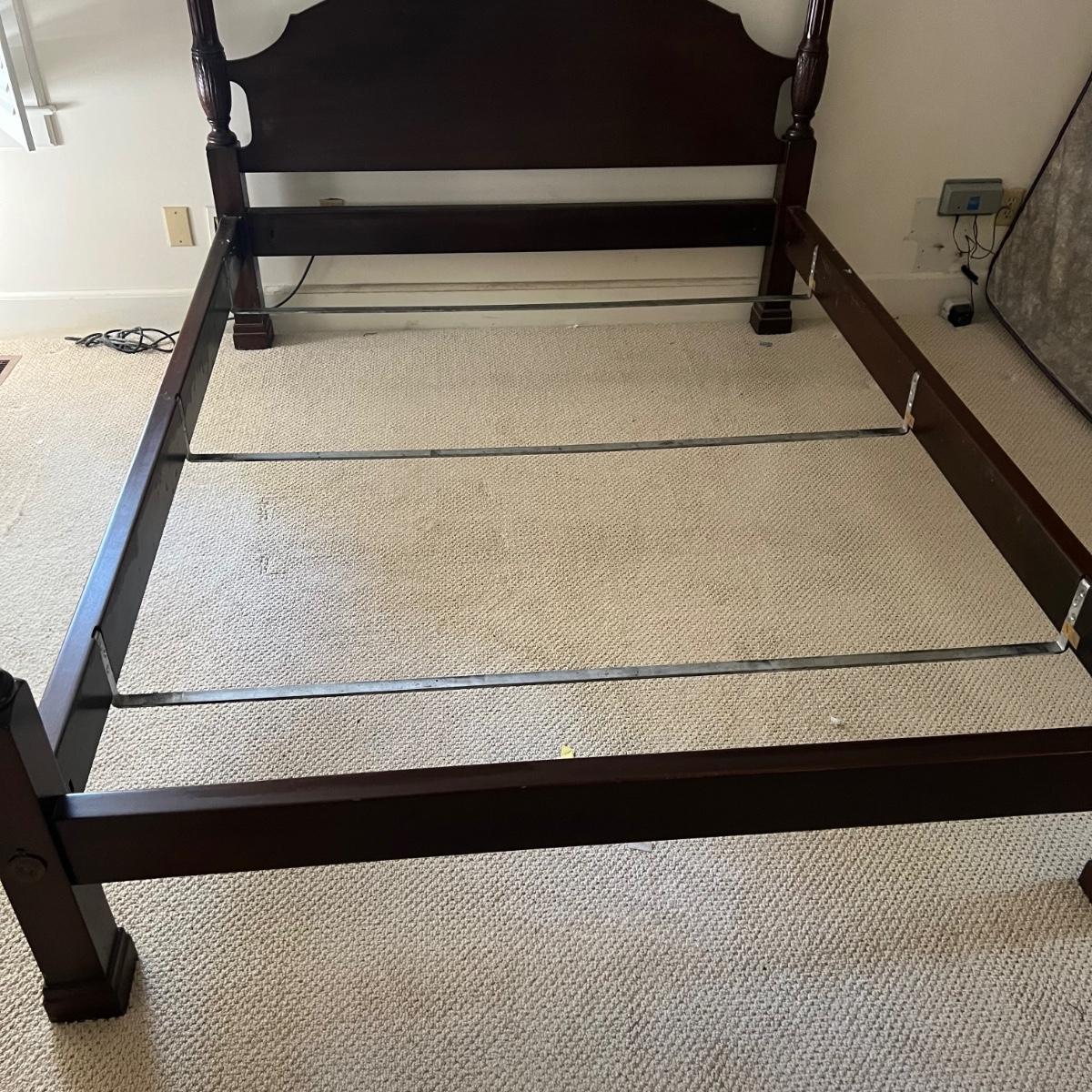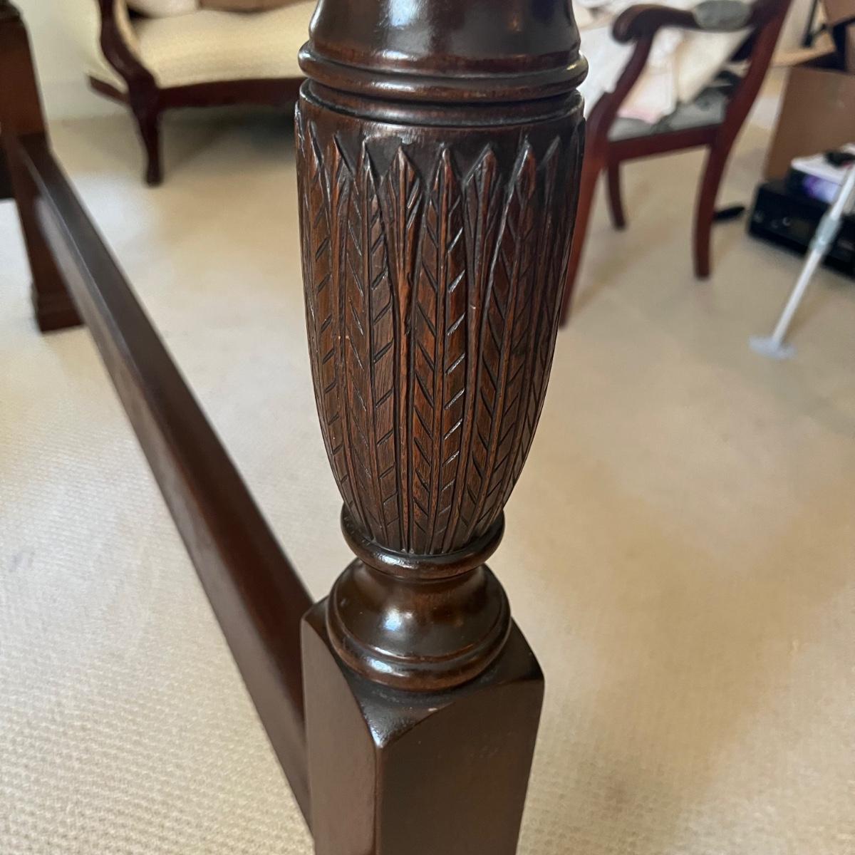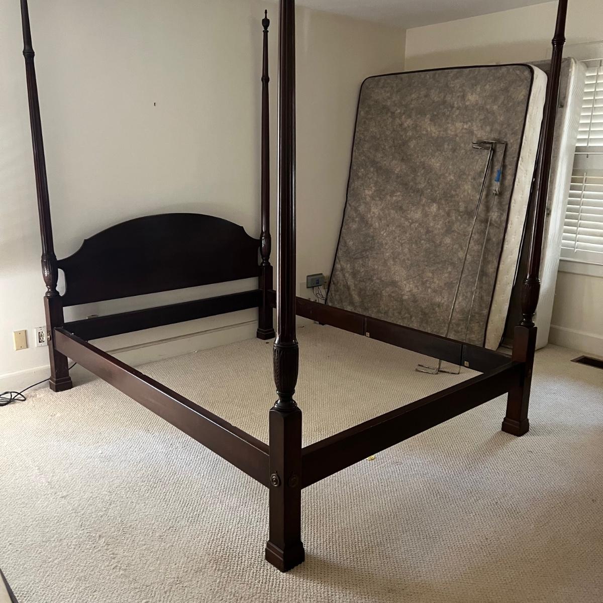 Queen size four poster rice carved bed. No visible brand identifications found. The mattress and box spring are available to the winning bidder if desired, but the winning bidder is not required to take them. Winning bidder will need to bring tools (socket wrench) to fully disassemble.