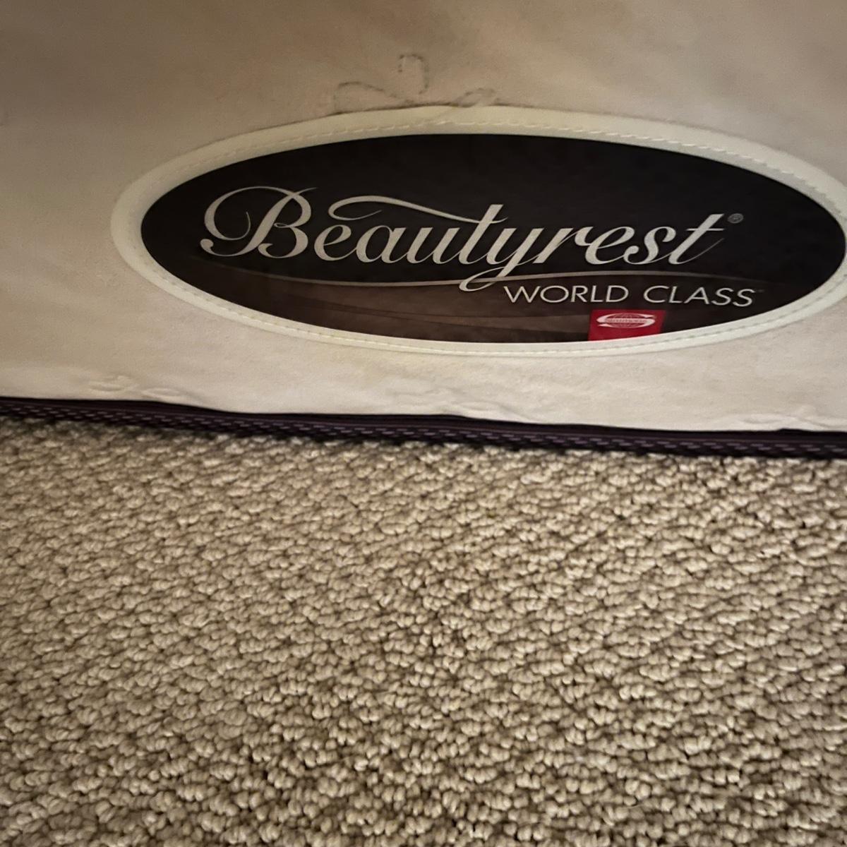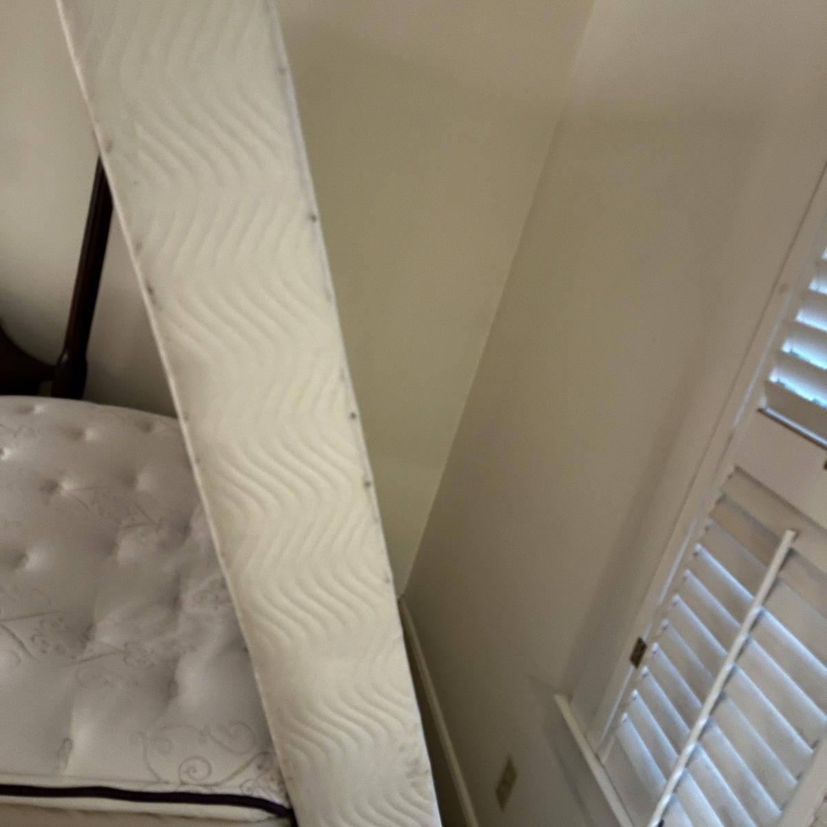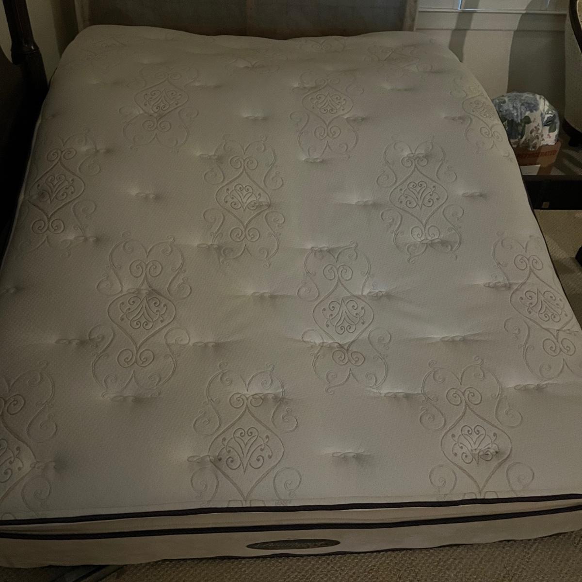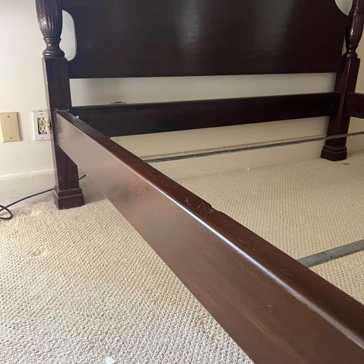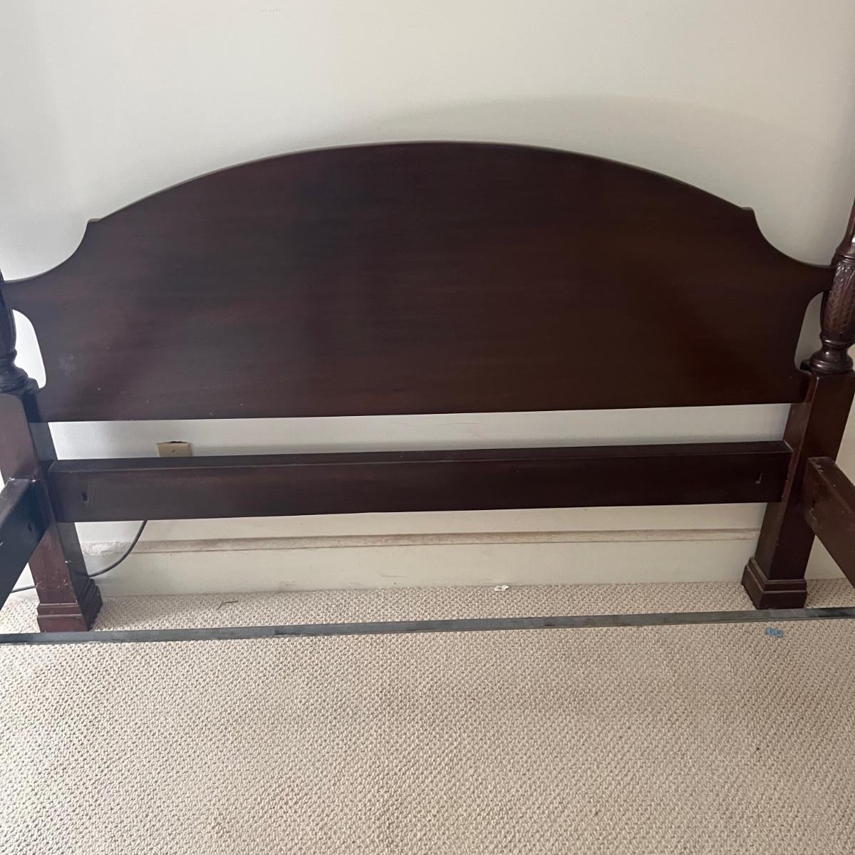 Queen size four poster rice carved bed. No visible brand identifications found. The mattress and box spring are available to the winning bidder if desired, but the winning bidder is not required to take them. Winning bidder will need to bring tools (socket wrench) to fully disassemble.
