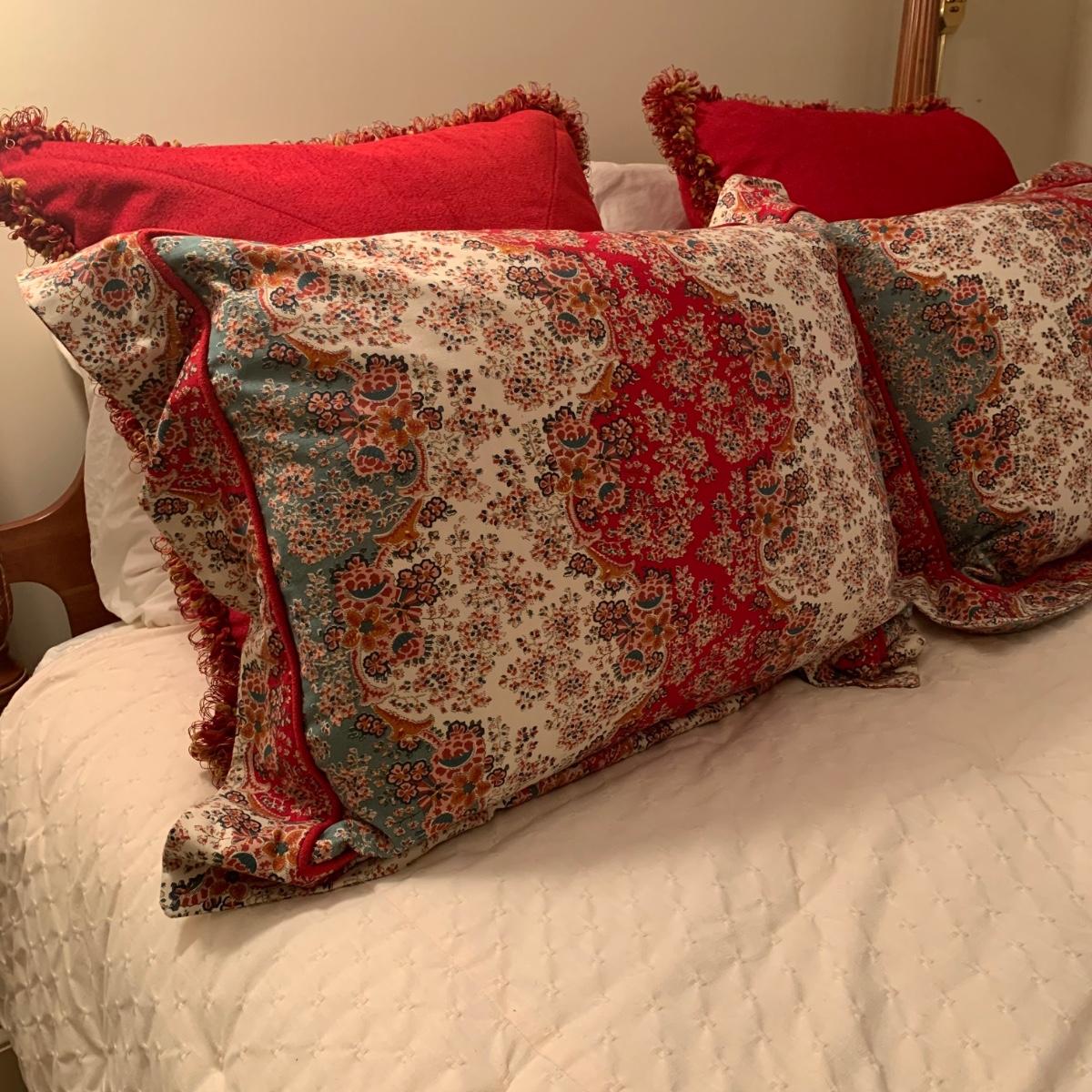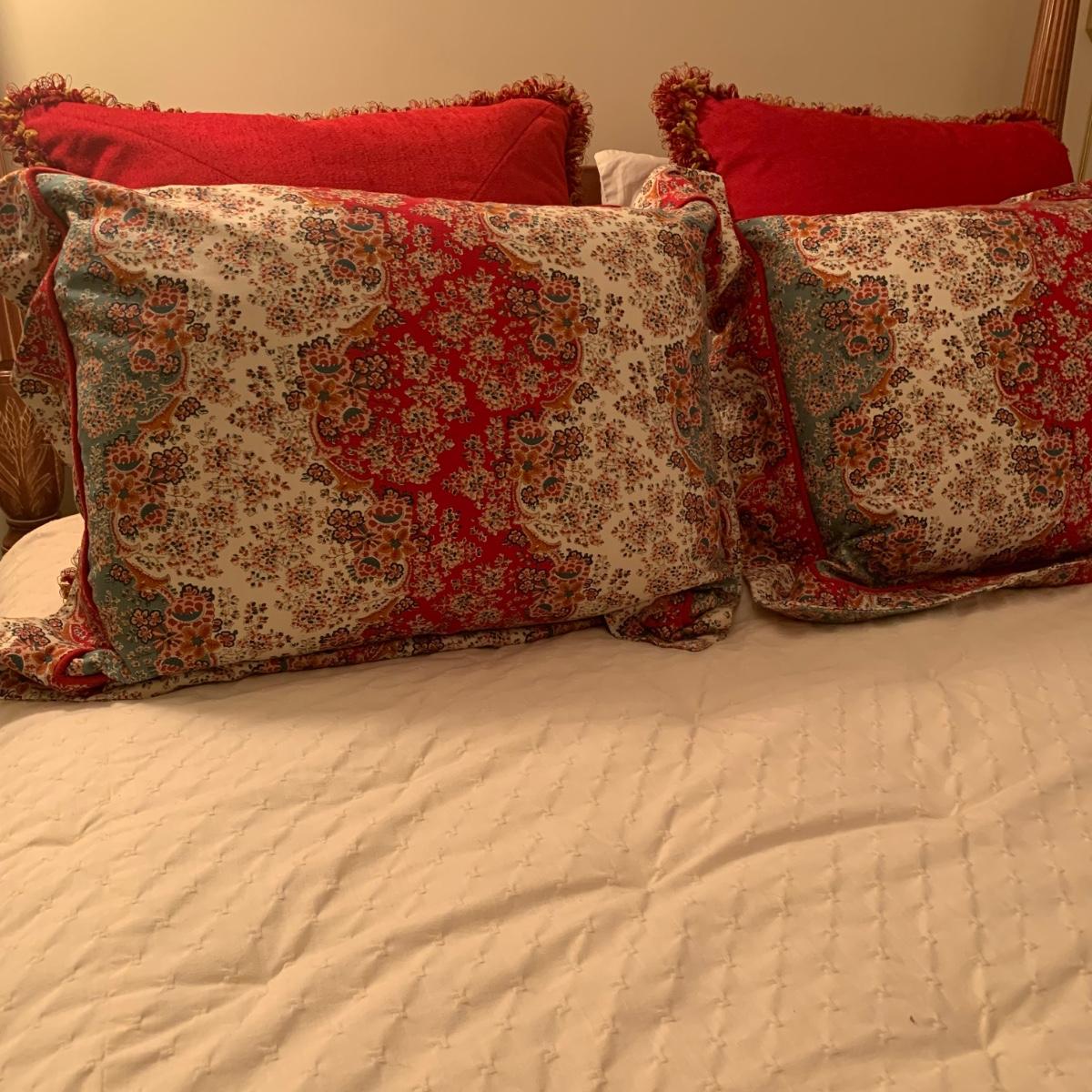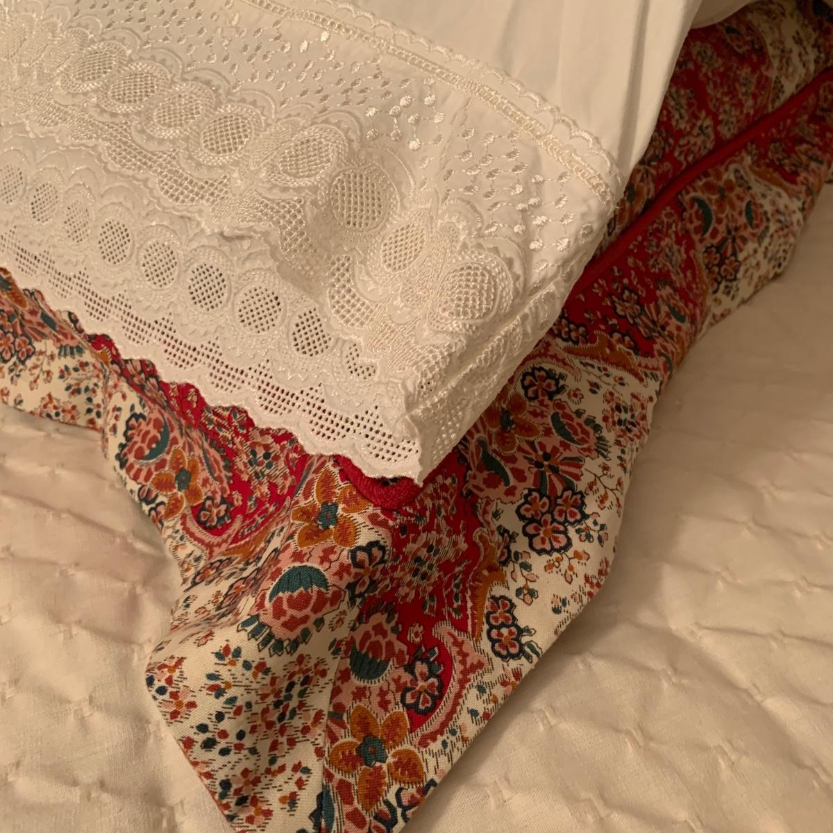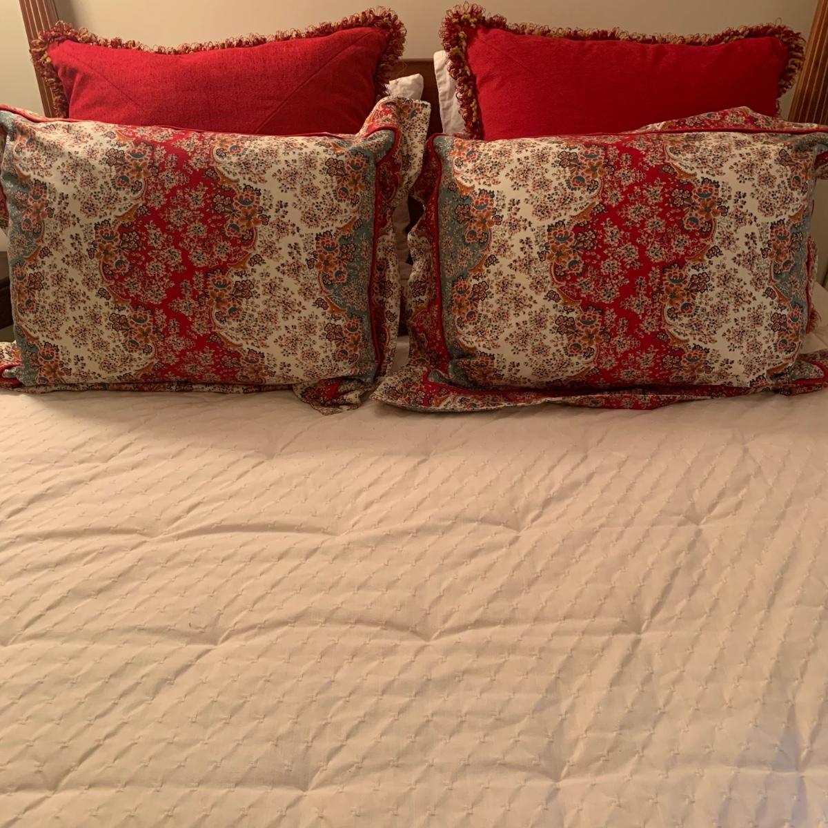 Set of queen sheets, pillows with decorative shams, red throw pillows, matching curtains, bed skirt, and comforter. Also set includes three valances, with two measuring 200” x 11.5” and one measuring 156” x 11.5” and two curtain panels with rods. Each panel measures approximately 63" x 62"L.