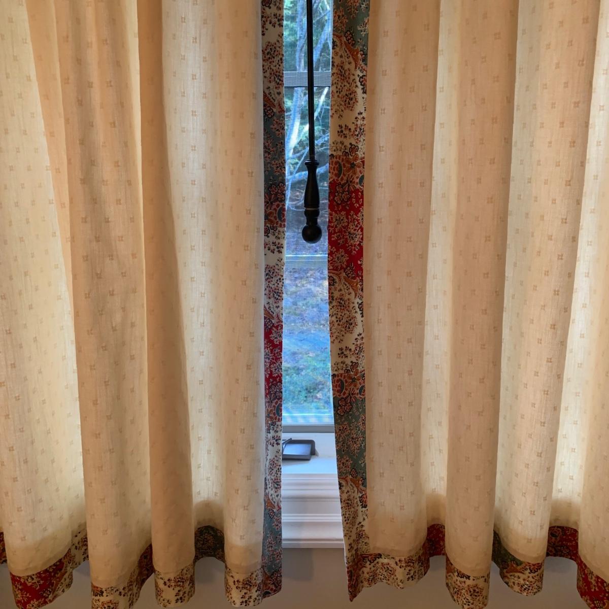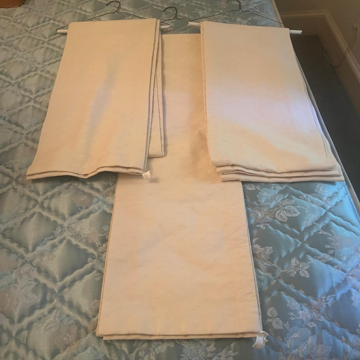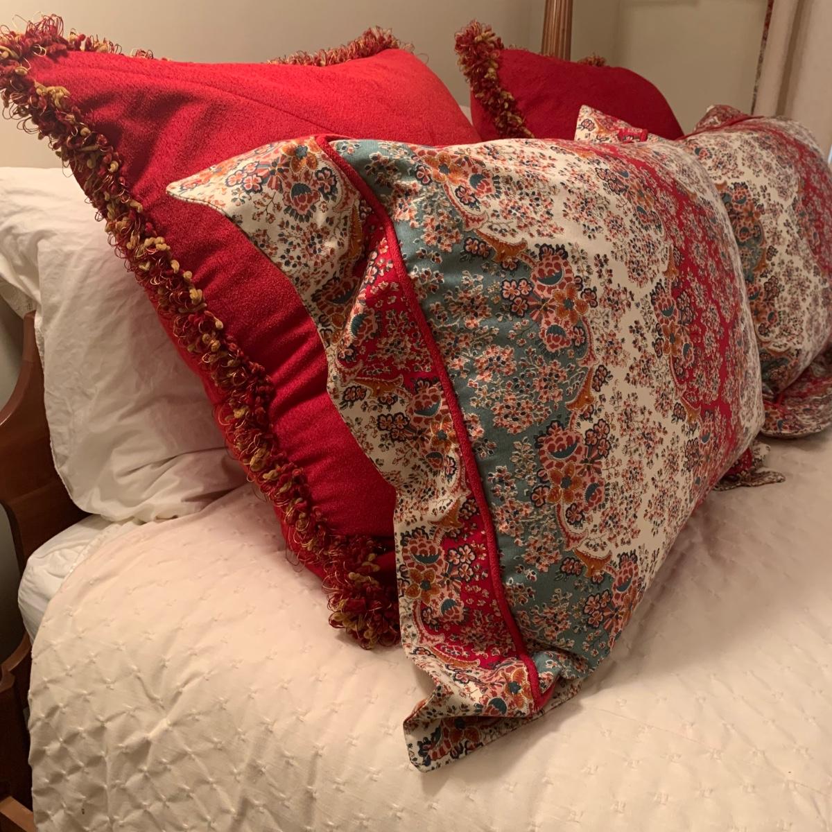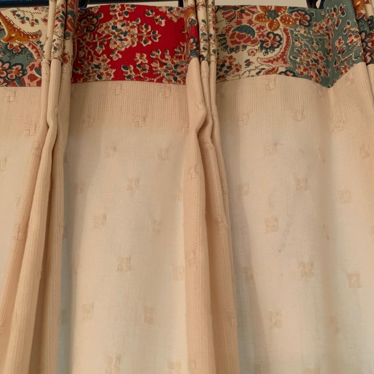 Set of queen sheets, pillows with decorative shams, red throw pillows, matching curtains, bed skirt, and comforter. Also set includes three valances, with two measuring 200” x 11.5” and one measuring 156” x 11.5” and two curtain panels with rods. Each panel measures approximately 63" x 62"L.