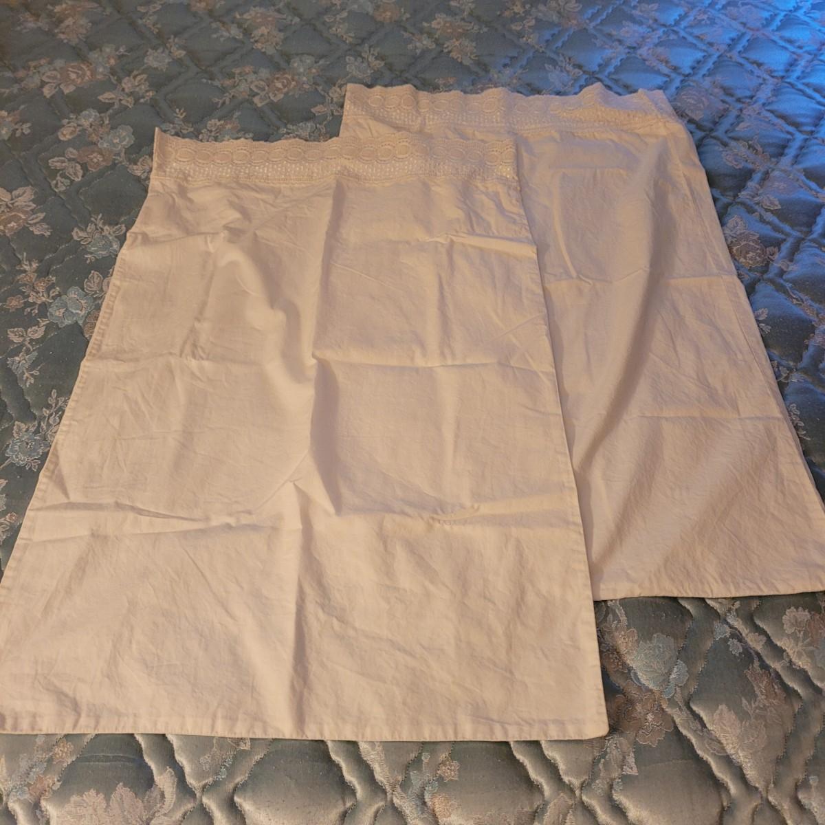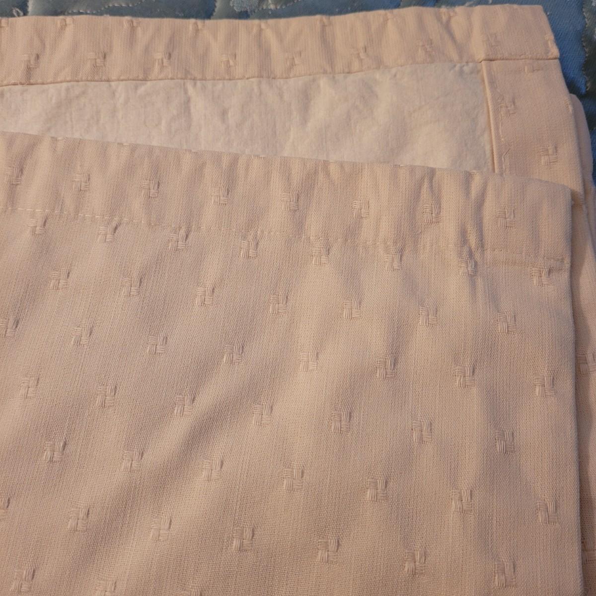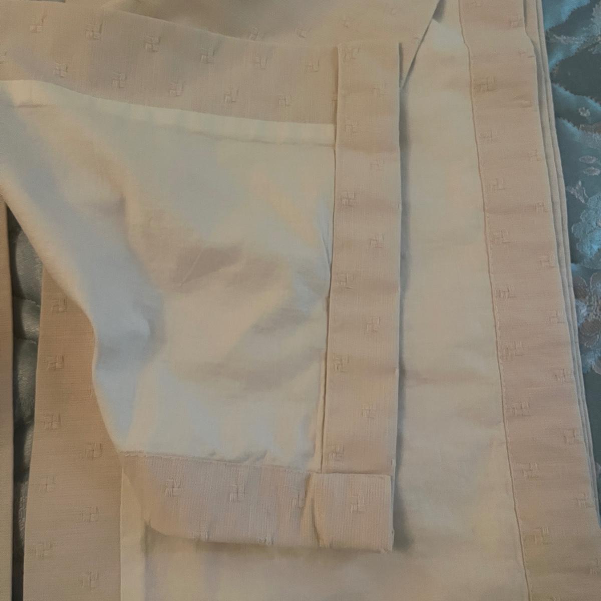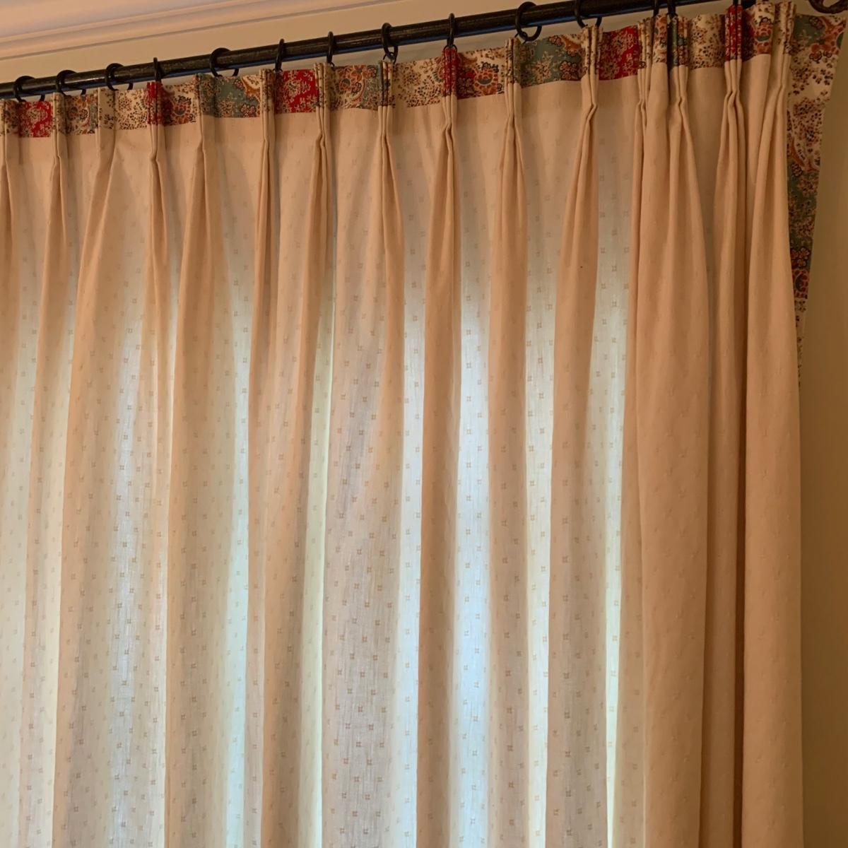 Set of queen sheets, pillows with decorative shams, red throw pillows, matching curtains, bed skirt, and comforter. Also set includes three valances, with two measuring 200” x 11.5” and one measuring 156” x 11.5” and two curtain panels with rods. Each panel measures approximately 63" x 62"L.