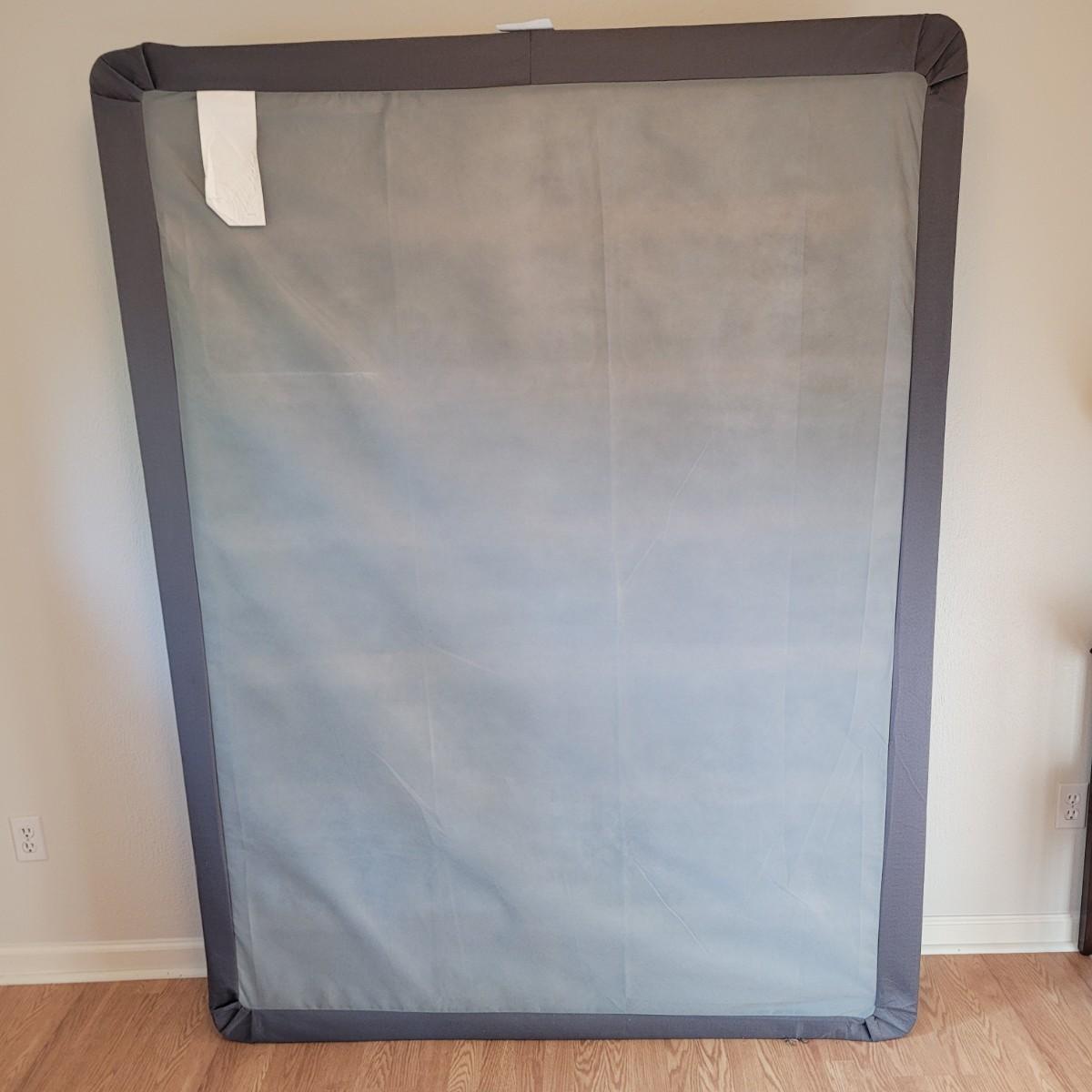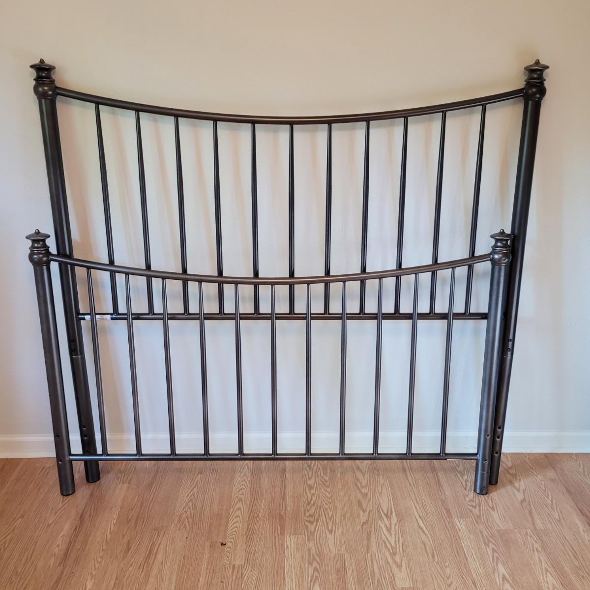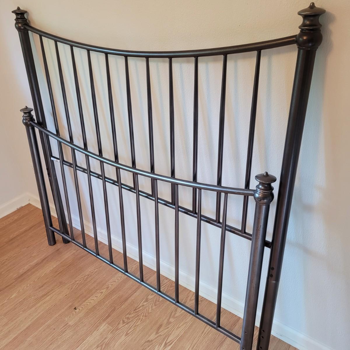 This lot includes everything but the mattress for a queen sized bed setup. Included are headboard, footboard, and rails. The box spring is available to the winning bidder if desired, but the winning bidder is not required to take it. The head and footboard are made from powder coated blue/grey metal. The rails are made from steel and are painted black. One plastic riser is missing. Headboard measures 61" x 58"H. Rails are adjustable and universal. Hardware is not included. Box frame measures 60" x 79" x 6"H.