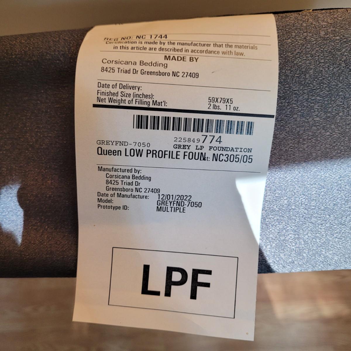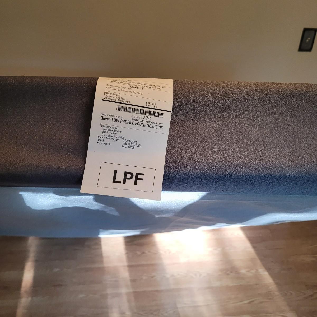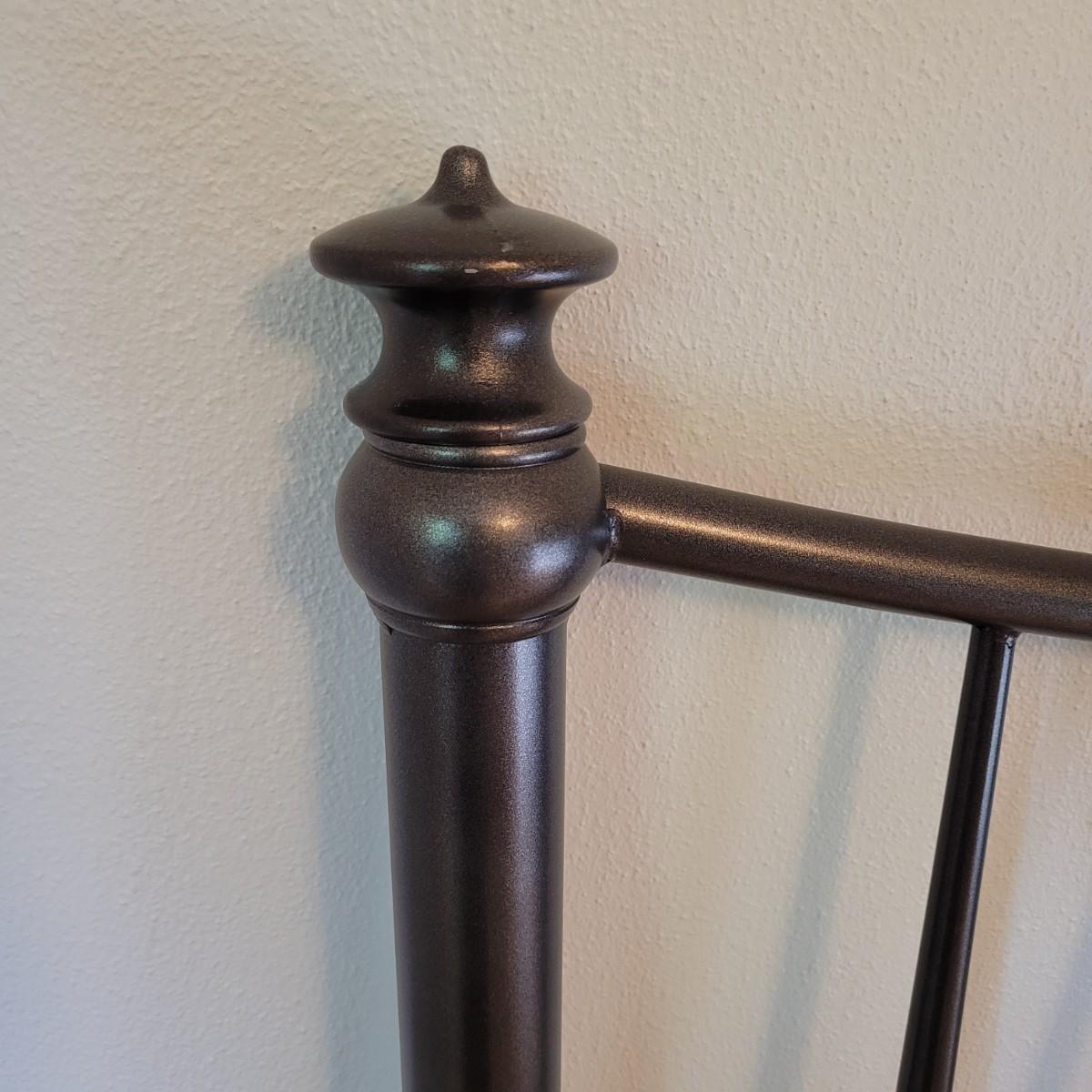 This lot includes everything but the mattress for a queen sized bed setup. Included are headboard, footboard, and rails. The box spring is available to the winning bidder if desired, but the winning bidder is not required to take it. The head and footboard are made from powder coated blue/grey metal. The rails are made from steel and are painted black. One plastic riser is missing. Headboard measures 61" x 58"H. Rails are adjustable and universal. Hardware is not included. Box frame measures 60" x 79" x 6"H.