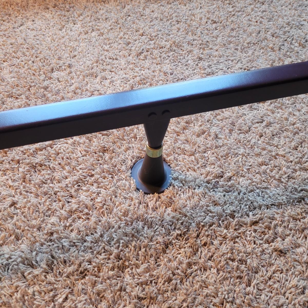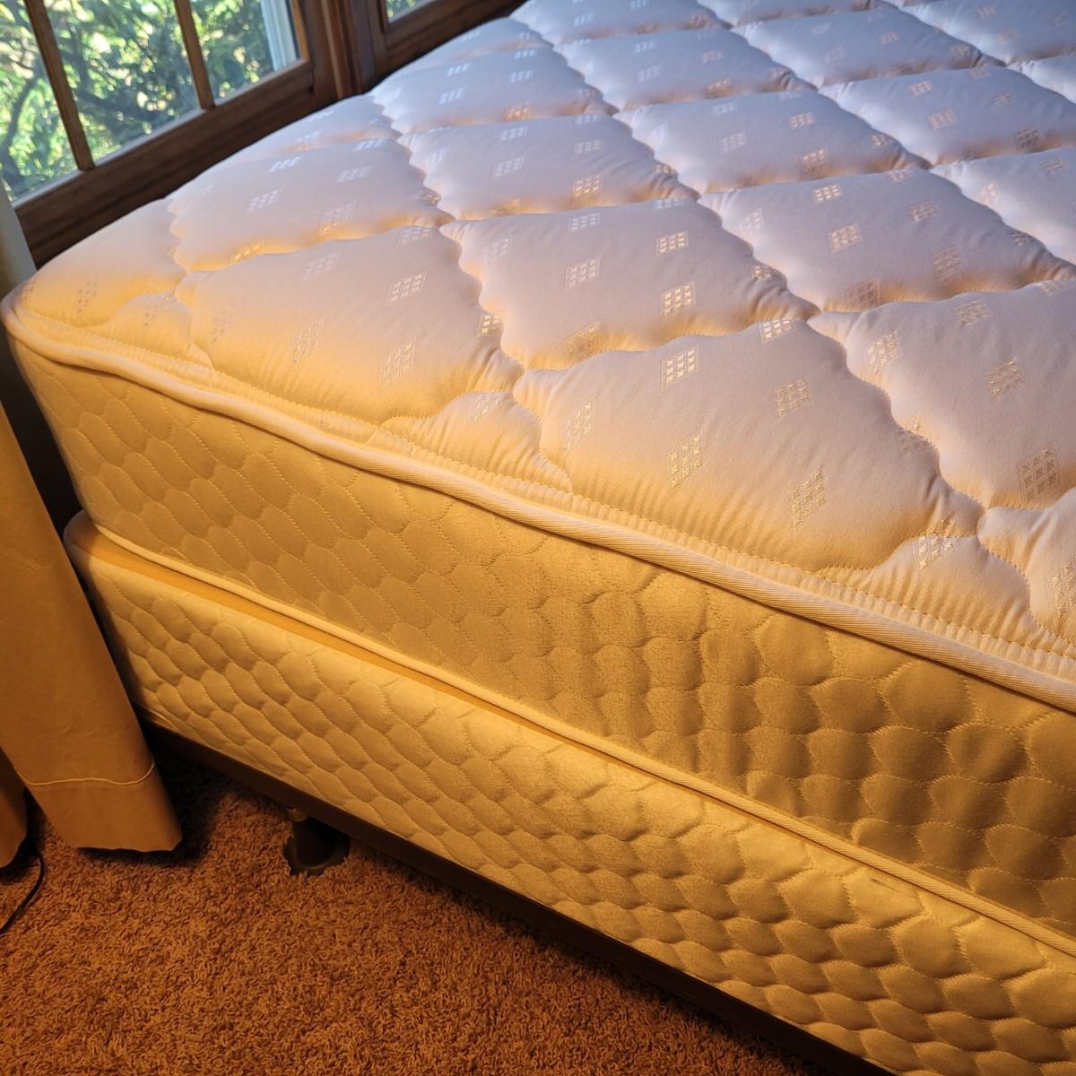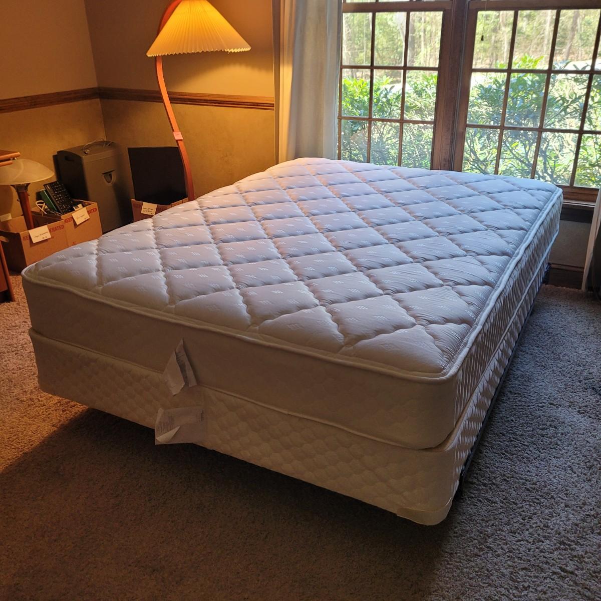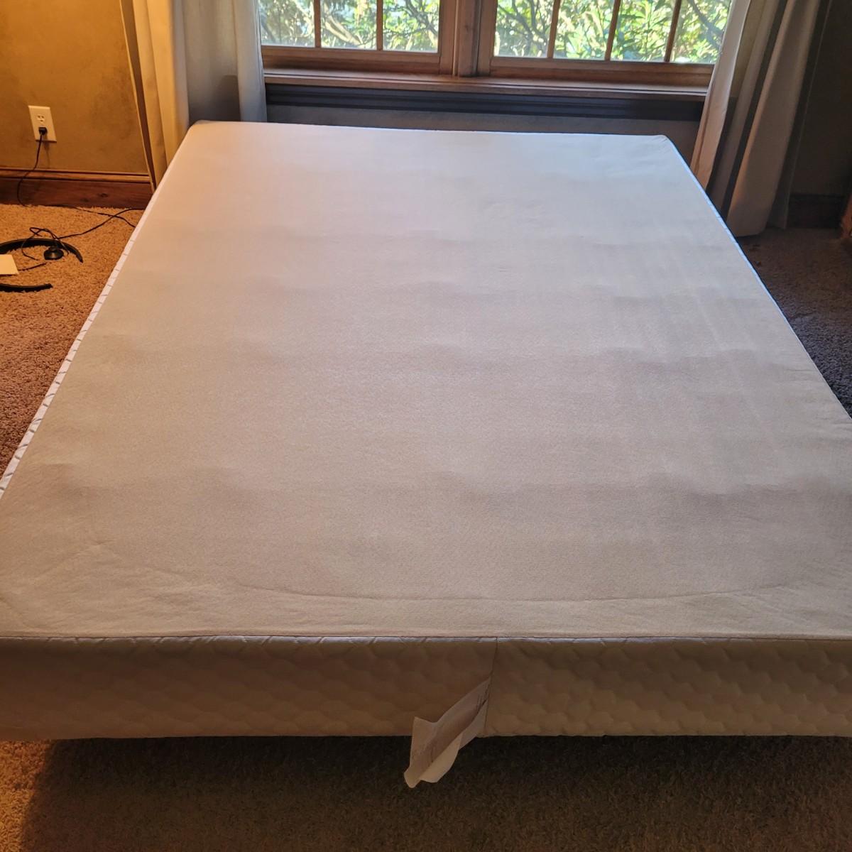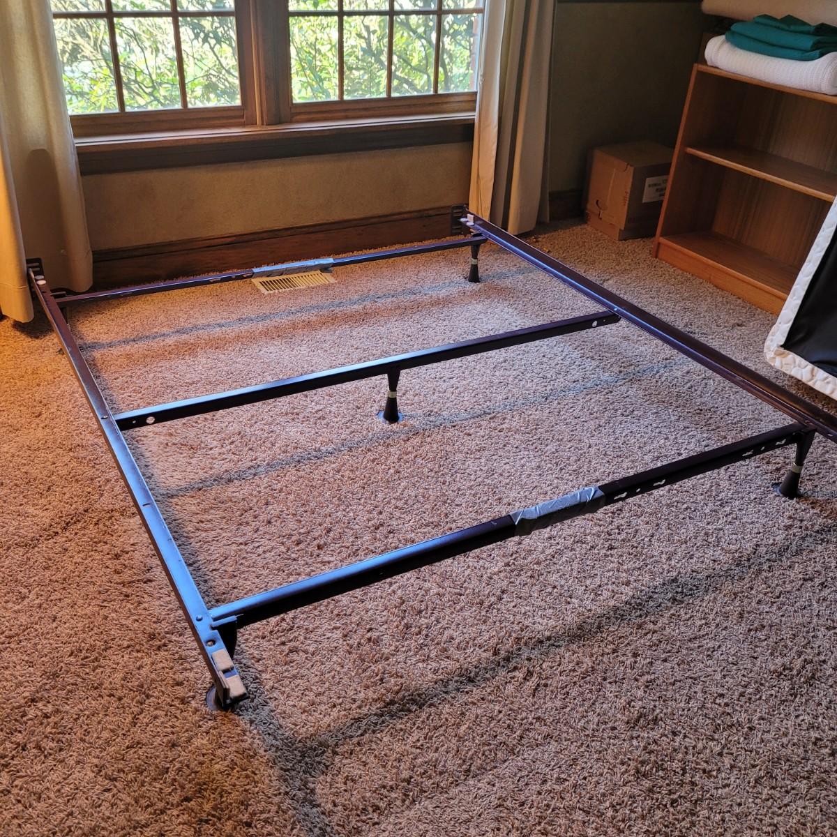 This queen size metal bed frame measures 72” x 61”. The mattress and box spring are available to the winning bidder if desired, but the winning bidder is not required to take them. Local pickup only. If taking mattress and box spring, winning bidder must bring assistance to help move and load this item due to its weight and size.