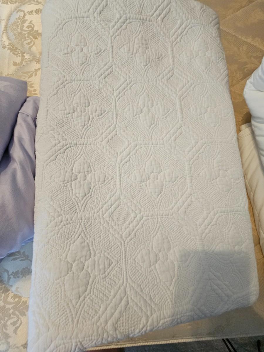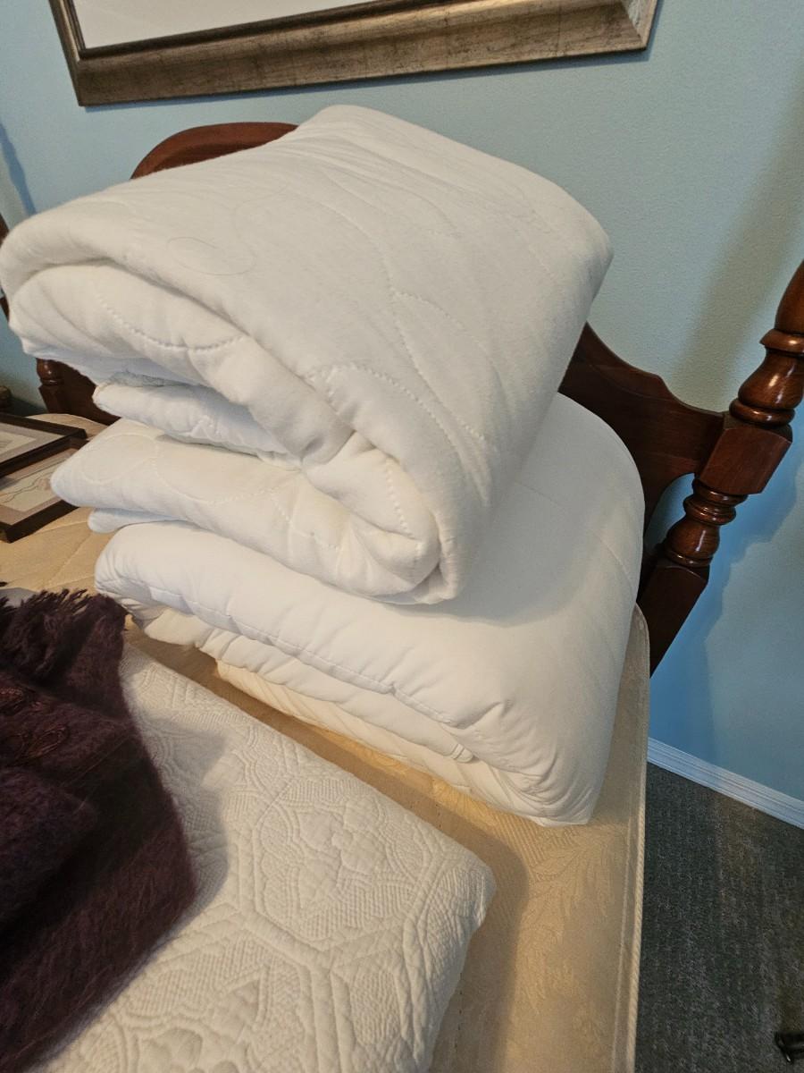 Lavender sheet set, purple soft blanket with stitching, white vintage blanket, 2 mattress pads