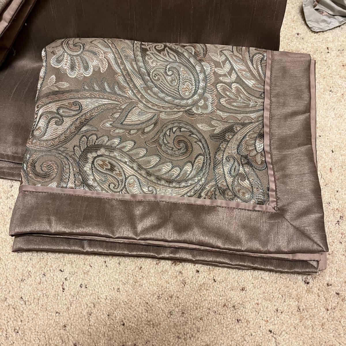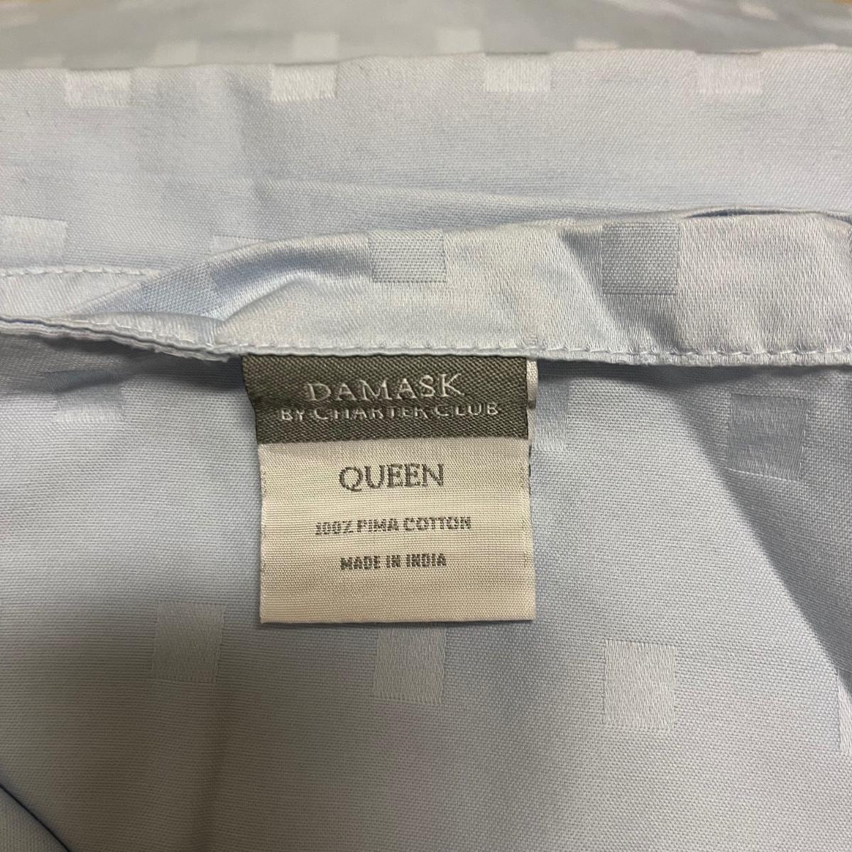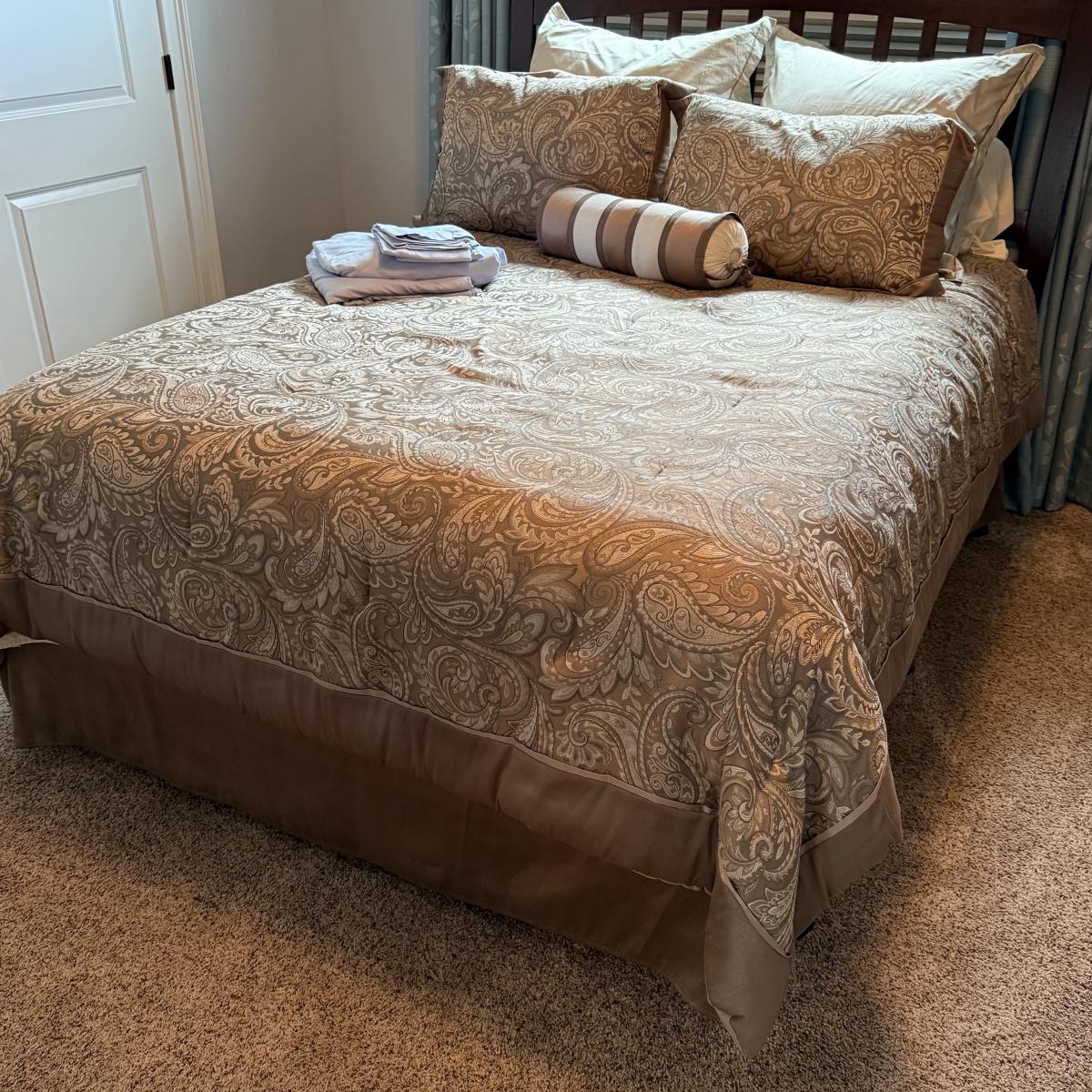 This bedding lot includes a queen size comforter, matching pillow shams & dust ruffle, decorative coordinating square pillows, and a bolster pillow. Also two queen sheet sets, one in blue/gray and the other in cream.