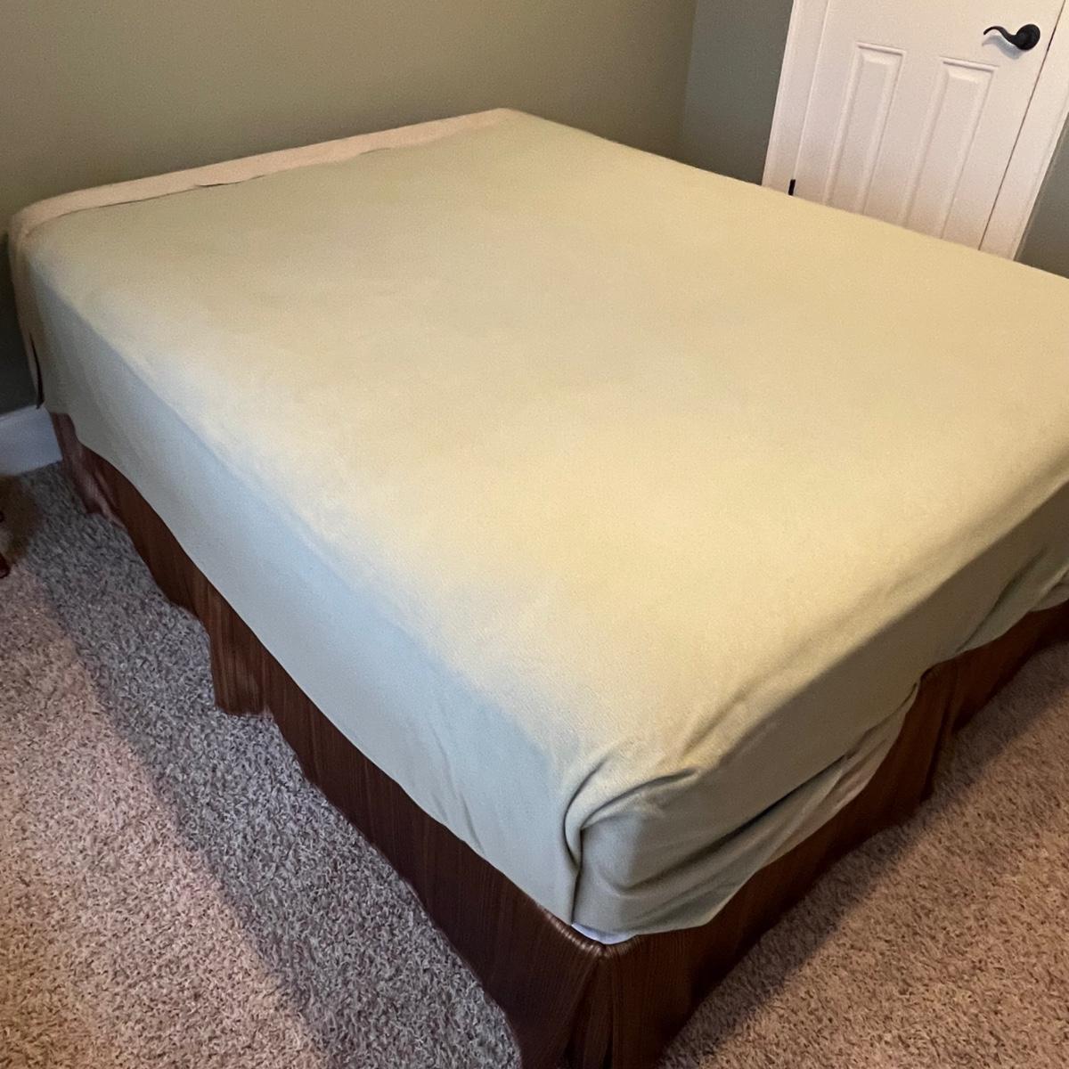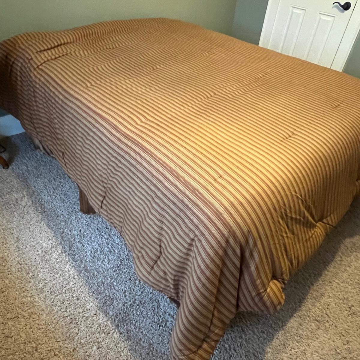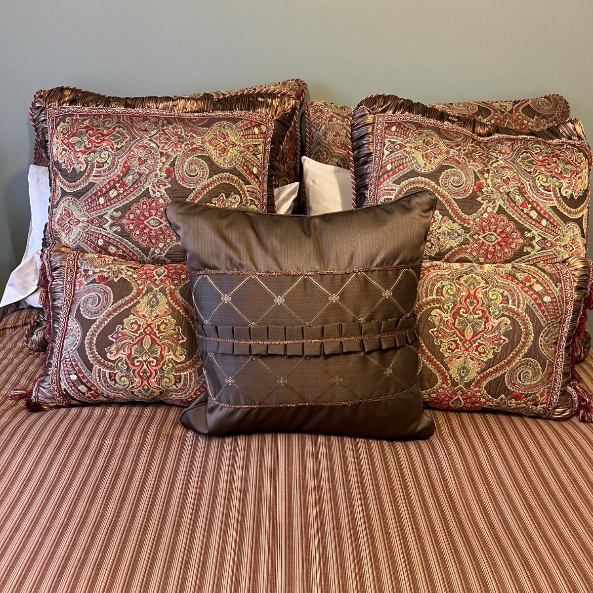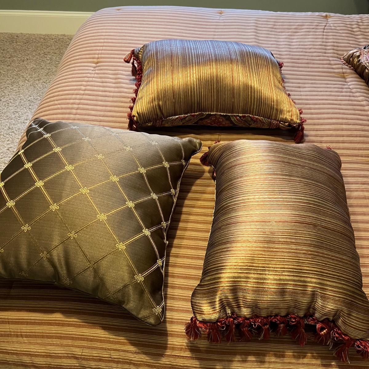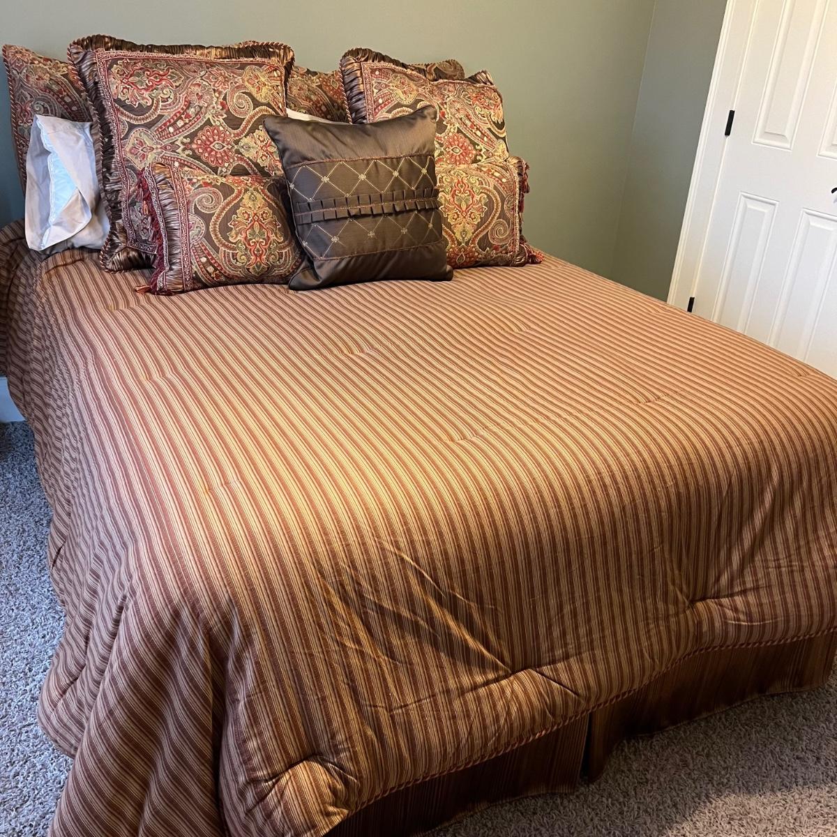 Bedding set includes comforter, bed skirt and various accent pillows. A green wool like blanket and tan flat and fitted sheet also included. Pillow inserts included. A queen bed frame also includes bed risers. Simmons mattress and box spring are available to the winning bidder if desired.