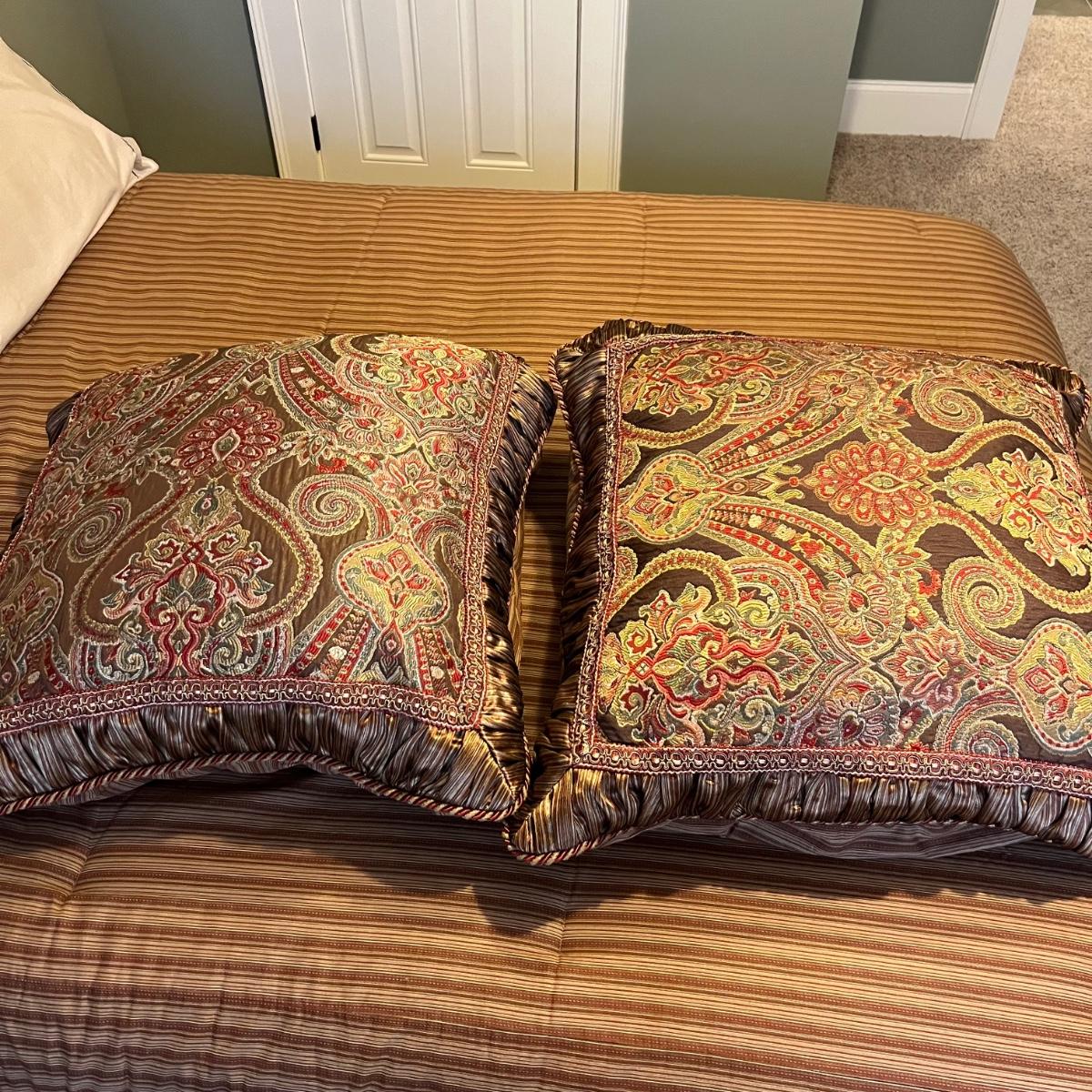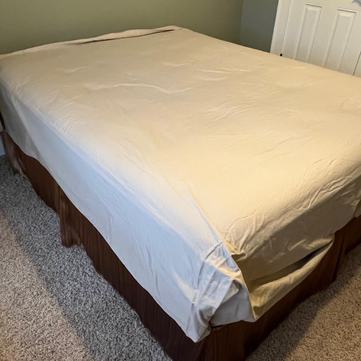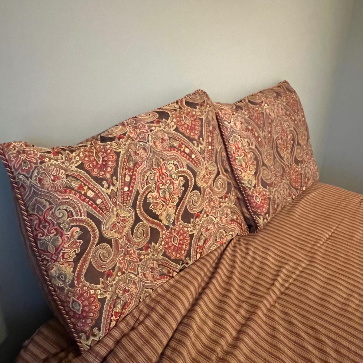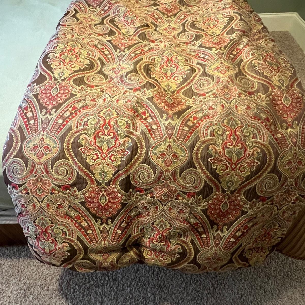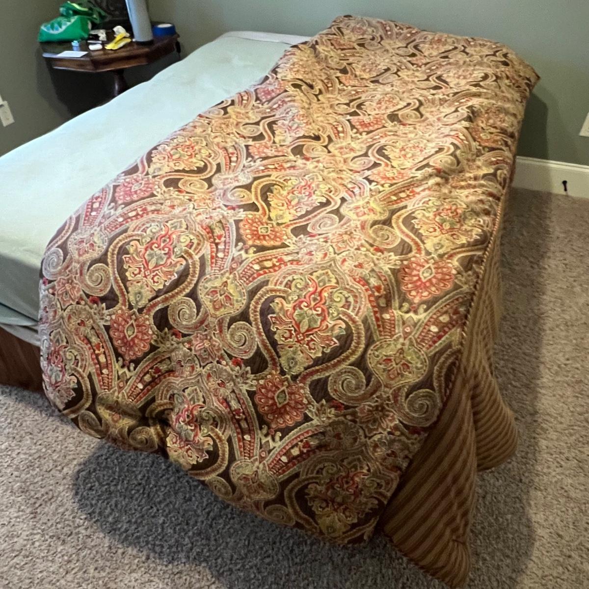 Bedding set includes comforter, bed skirt and various accent pillows. A green wool like blanket and tan flat and fitted sheet also included. Pillow inserts included. A queen bed frame also includes bed risers. Simmons mattress and box spring are available to the winning bidder if desired.