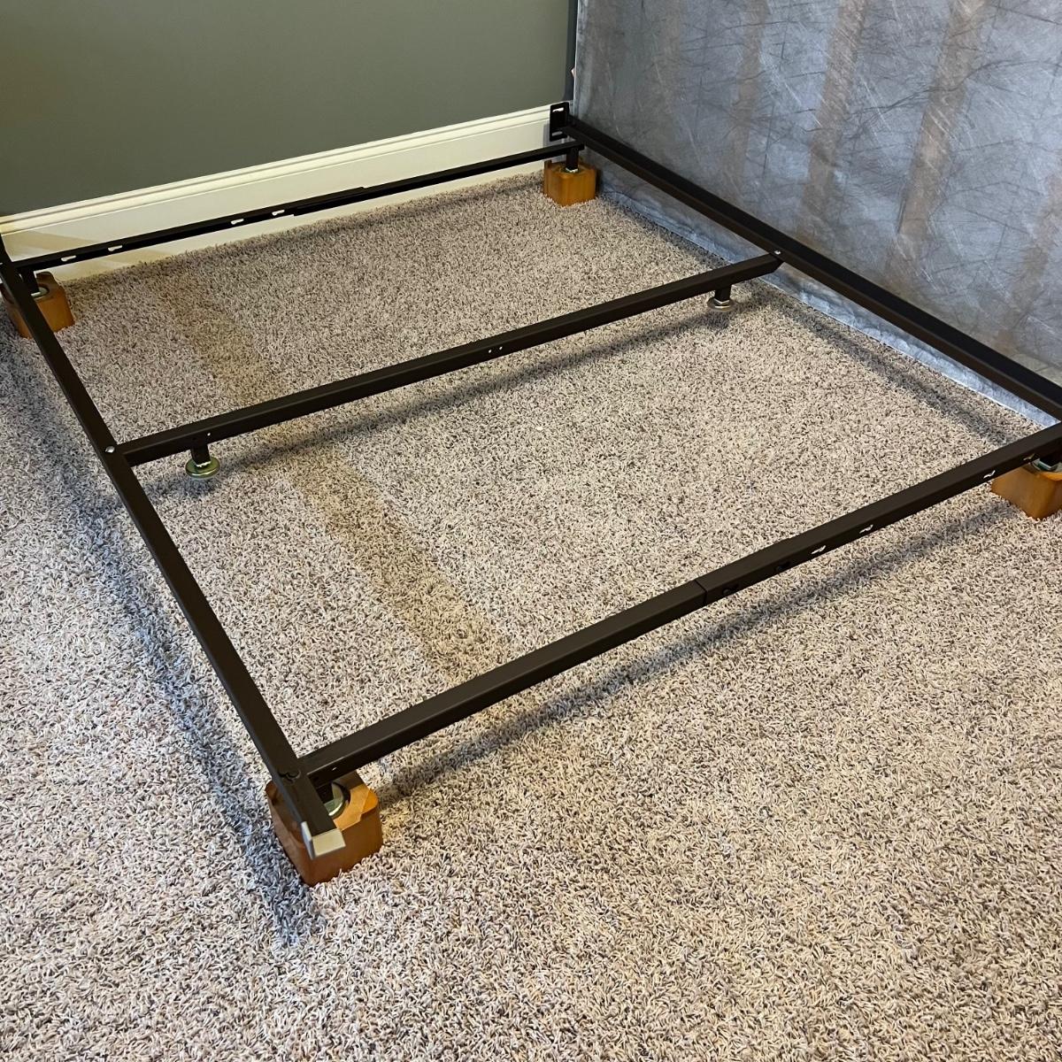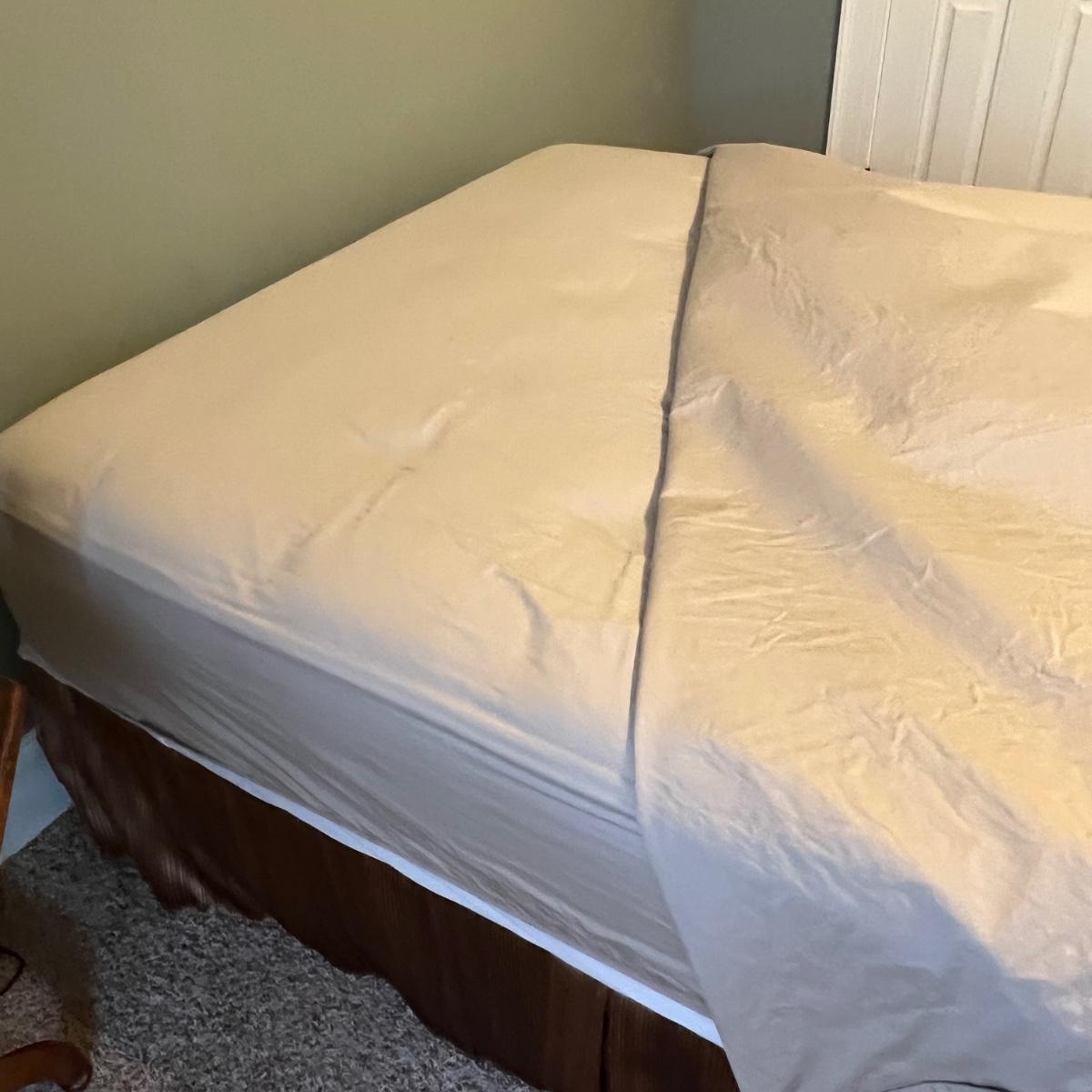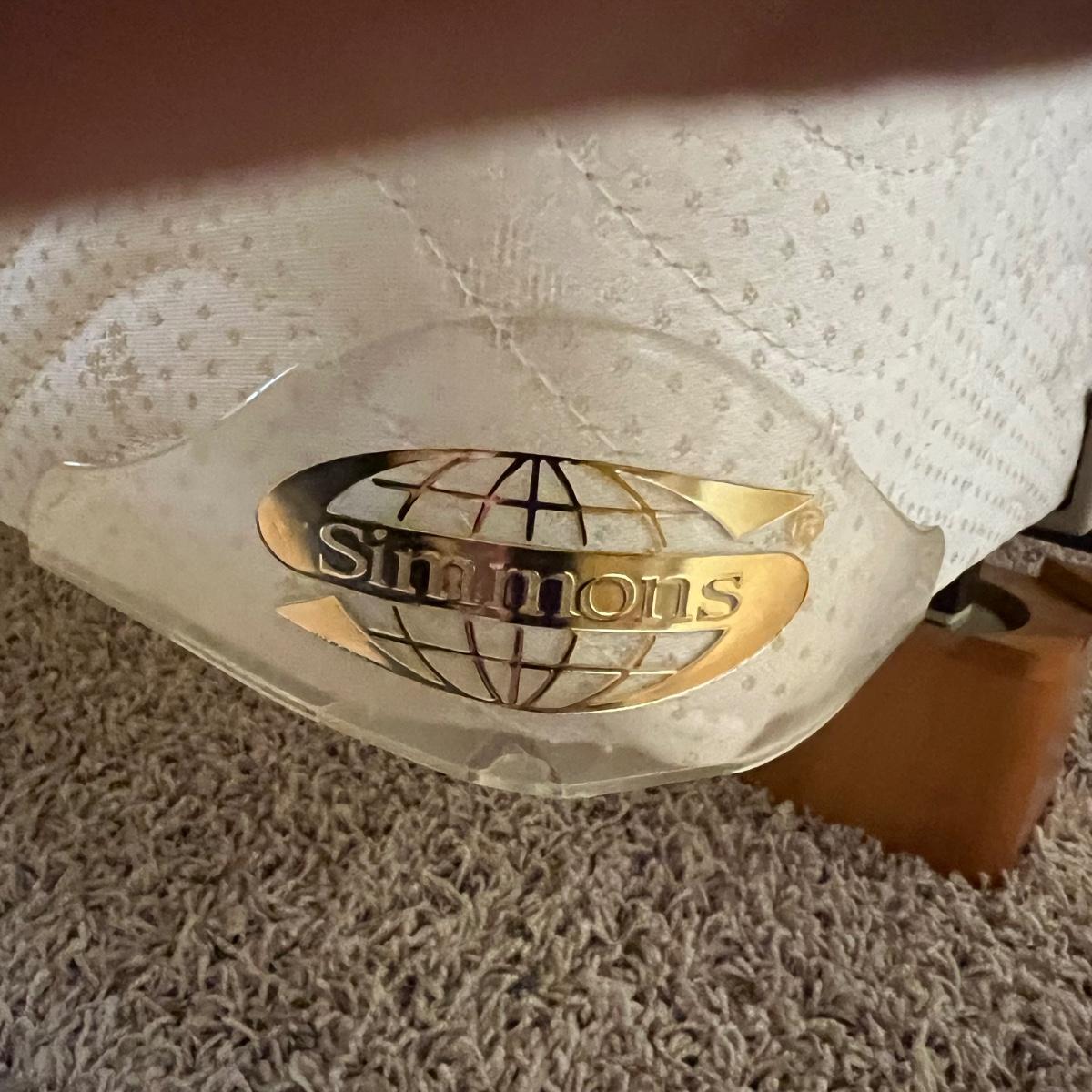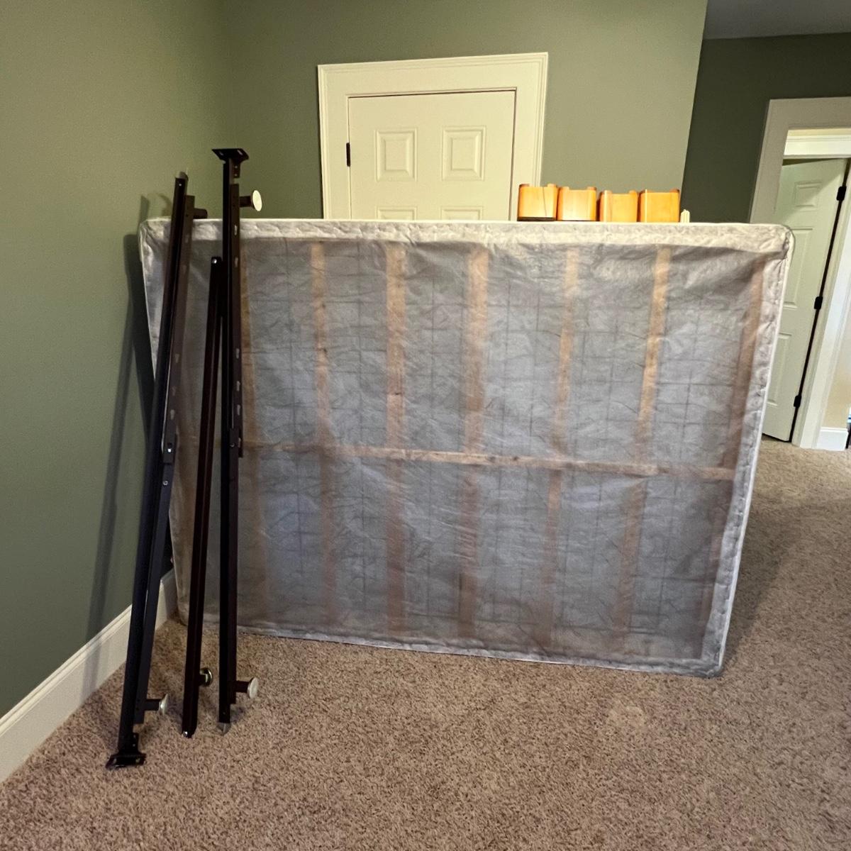 Bedding set includes comforter, bed skirt and various accent pillows. A green wool like blanket and tan flat and fitted sheet also included. Pillow inserts included. A queen bed frame also includes bed risers. Simmons mattress and box spring are available to the winning bidder if desired.