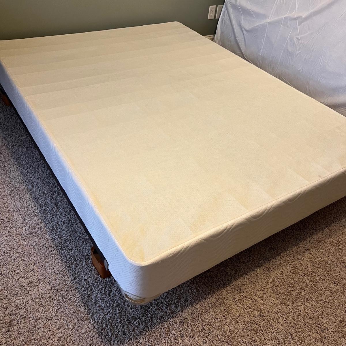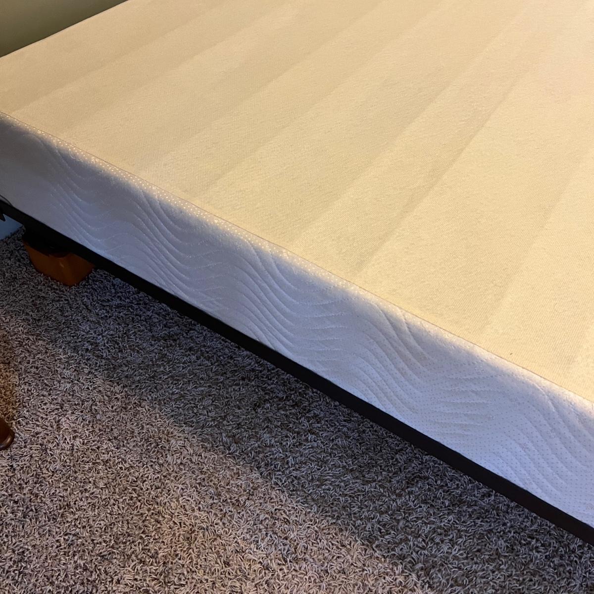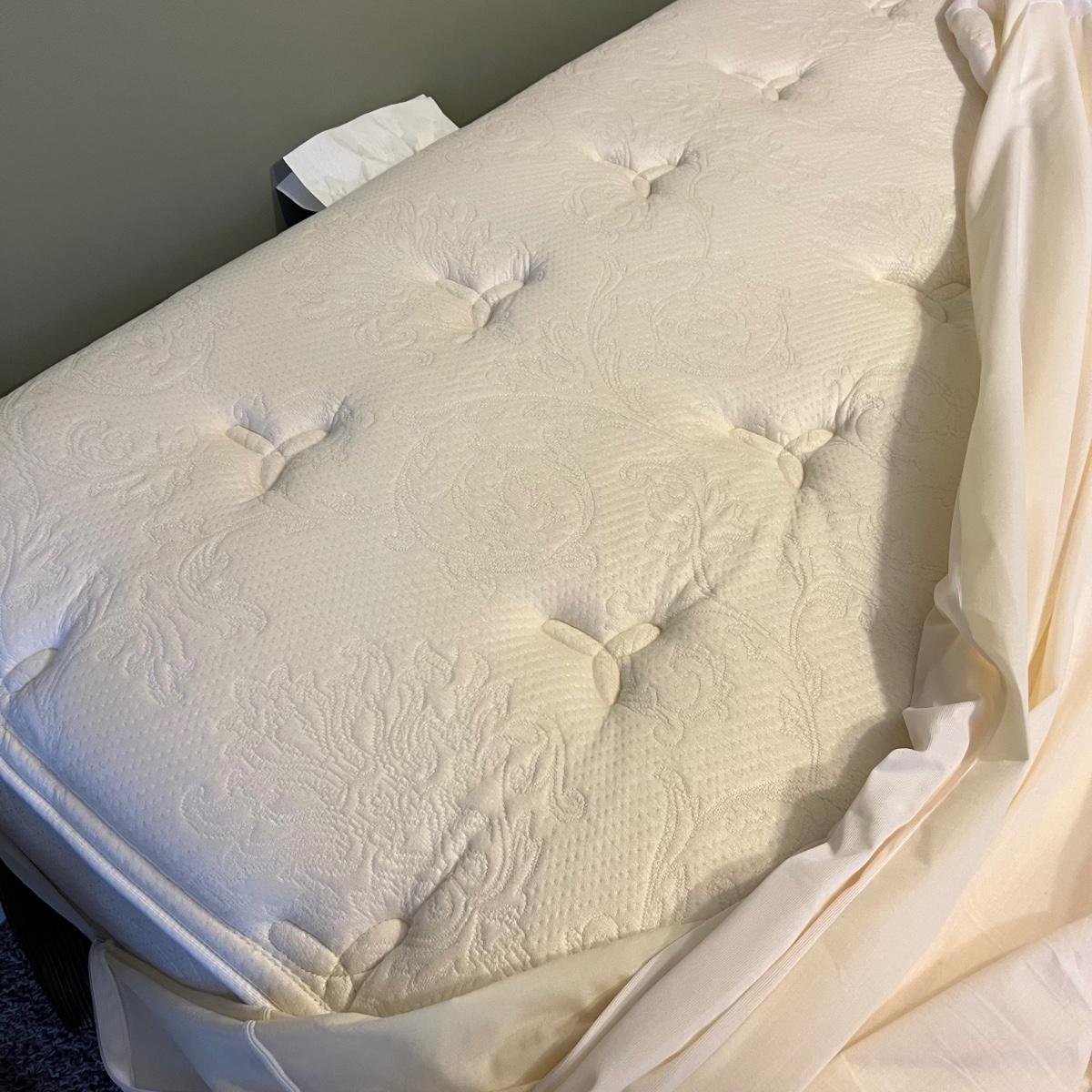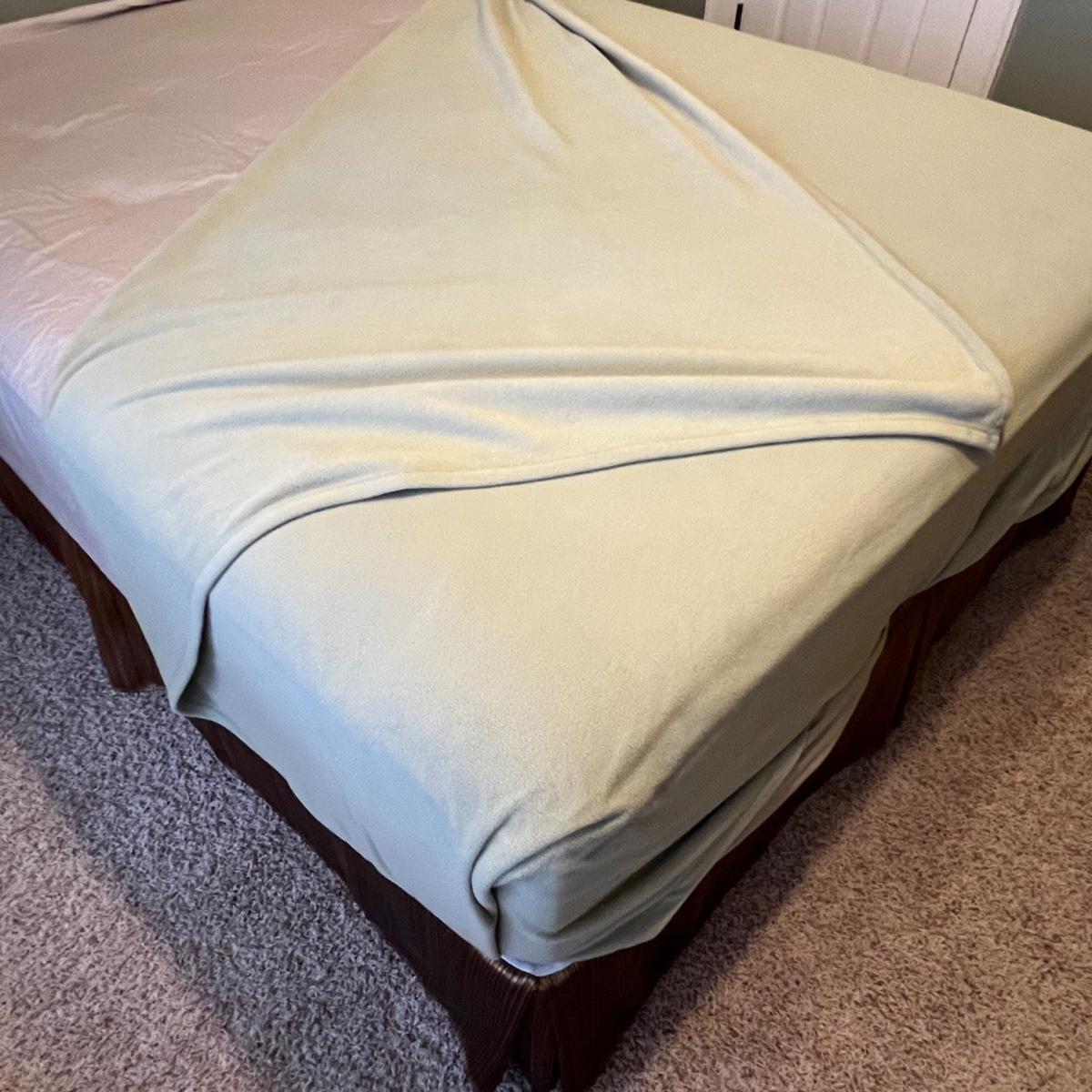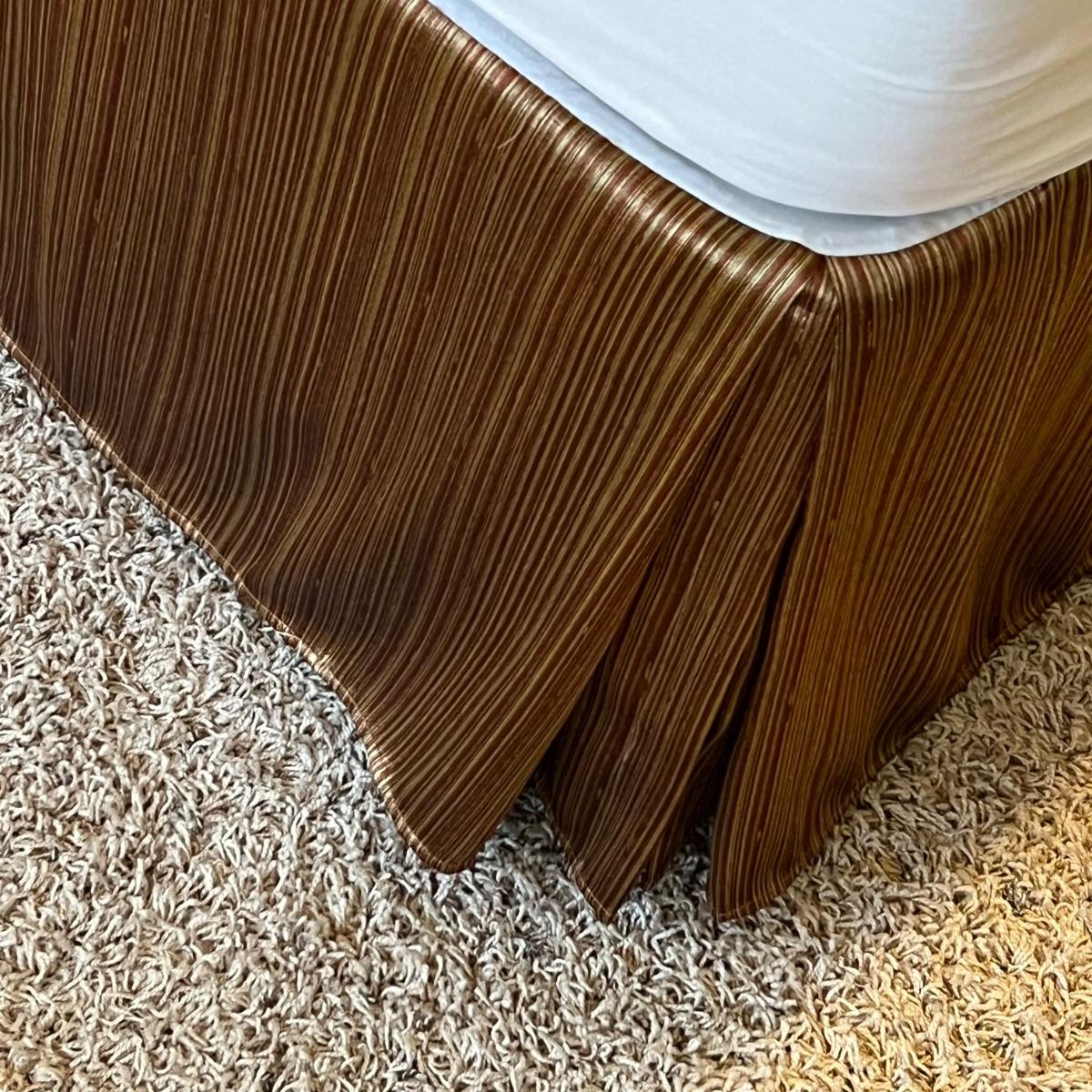 Bedding set includes comforter, bed skirt and various accent pillows. A green wool like blanket and tan flat and fitted sheet also included. Pillow inserts included. A queen bed frame also includes bed risers. Simmons mattress and box spring are available to the winning bidder if desired.