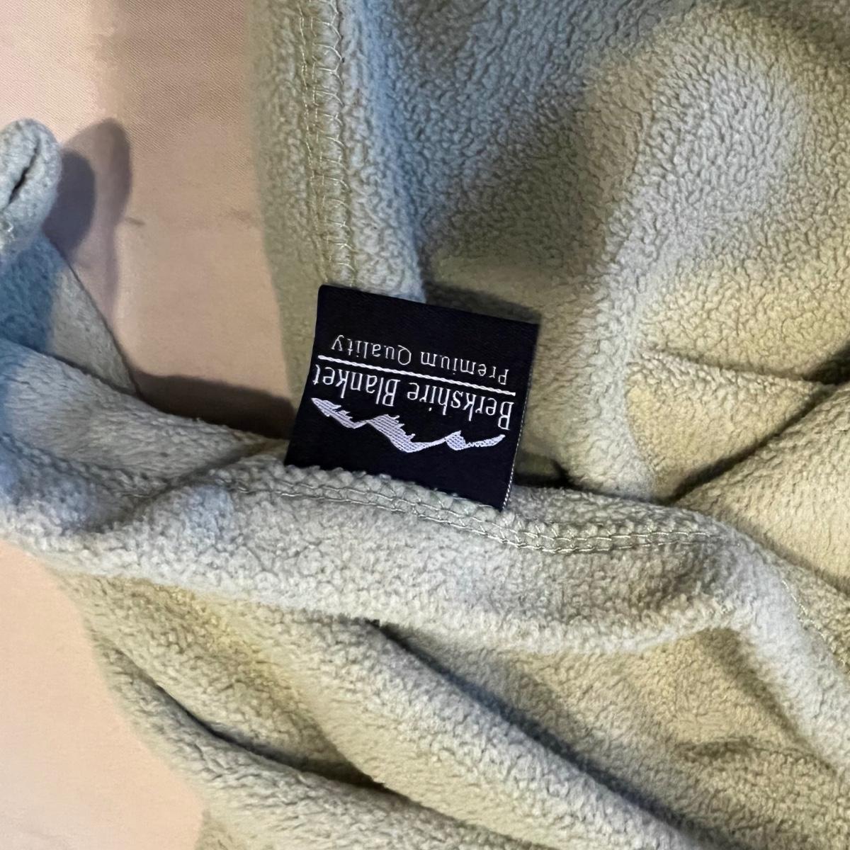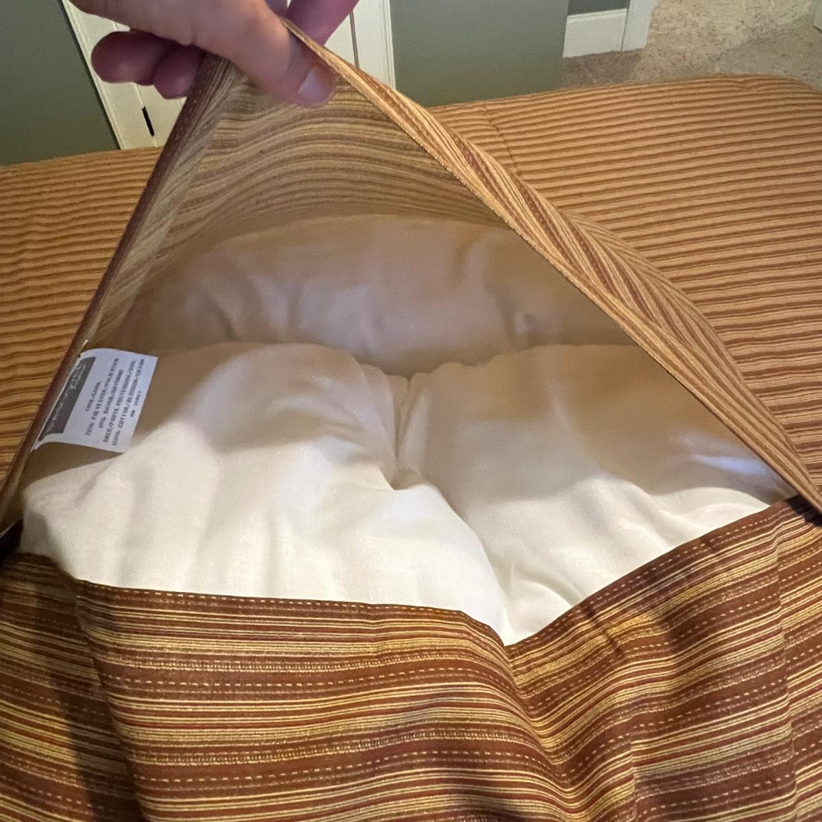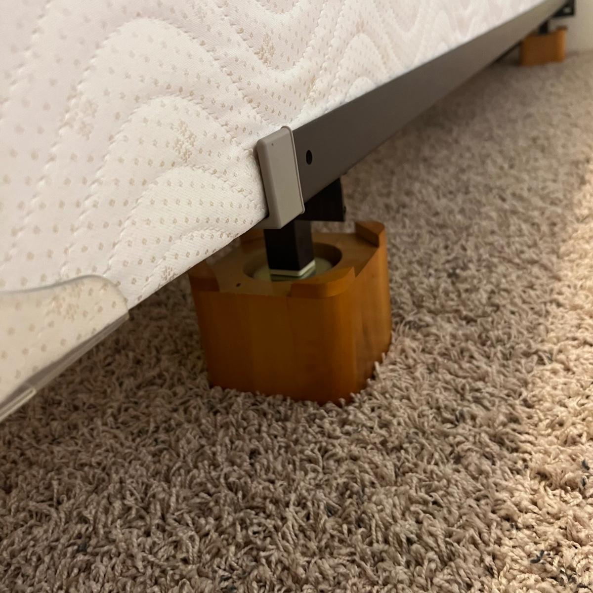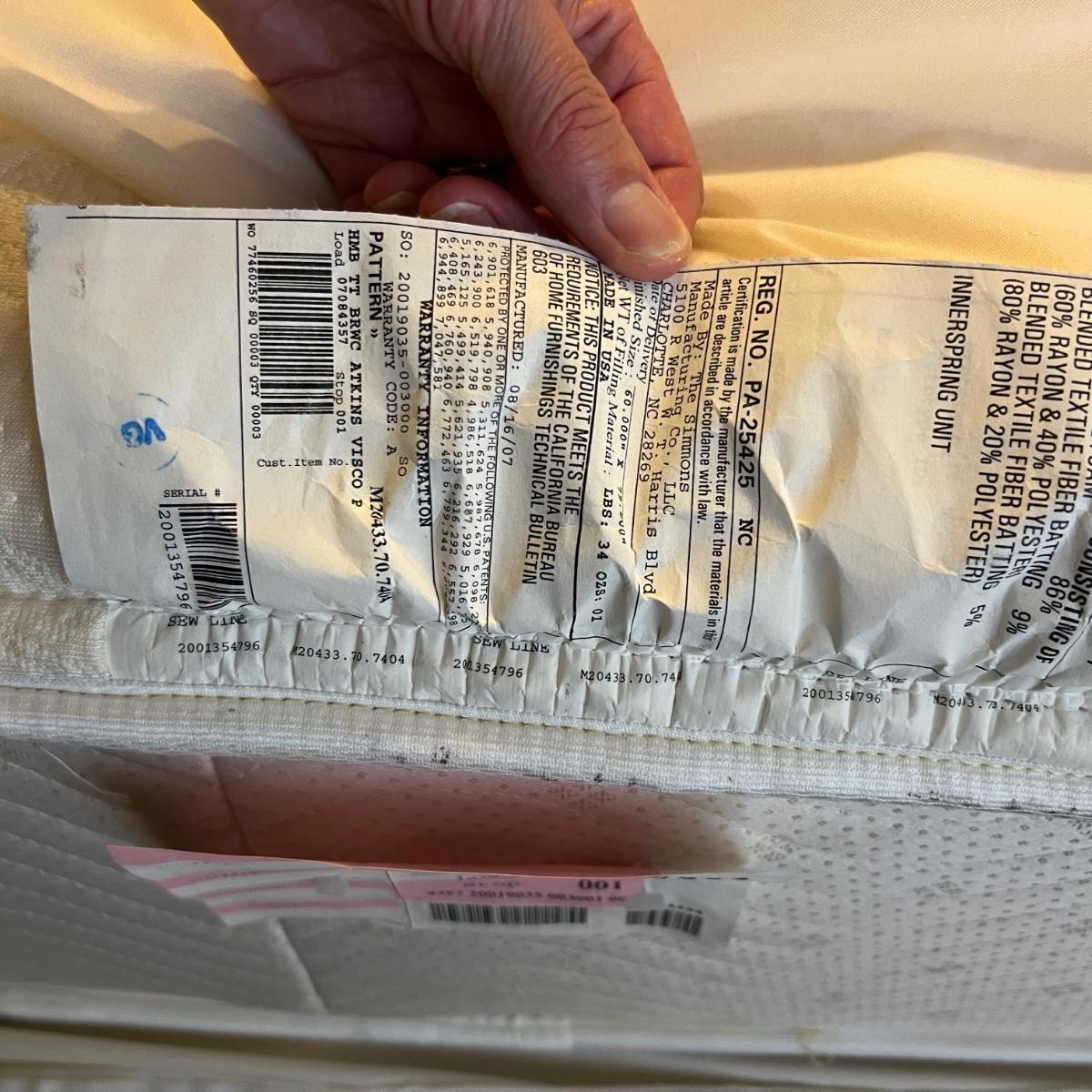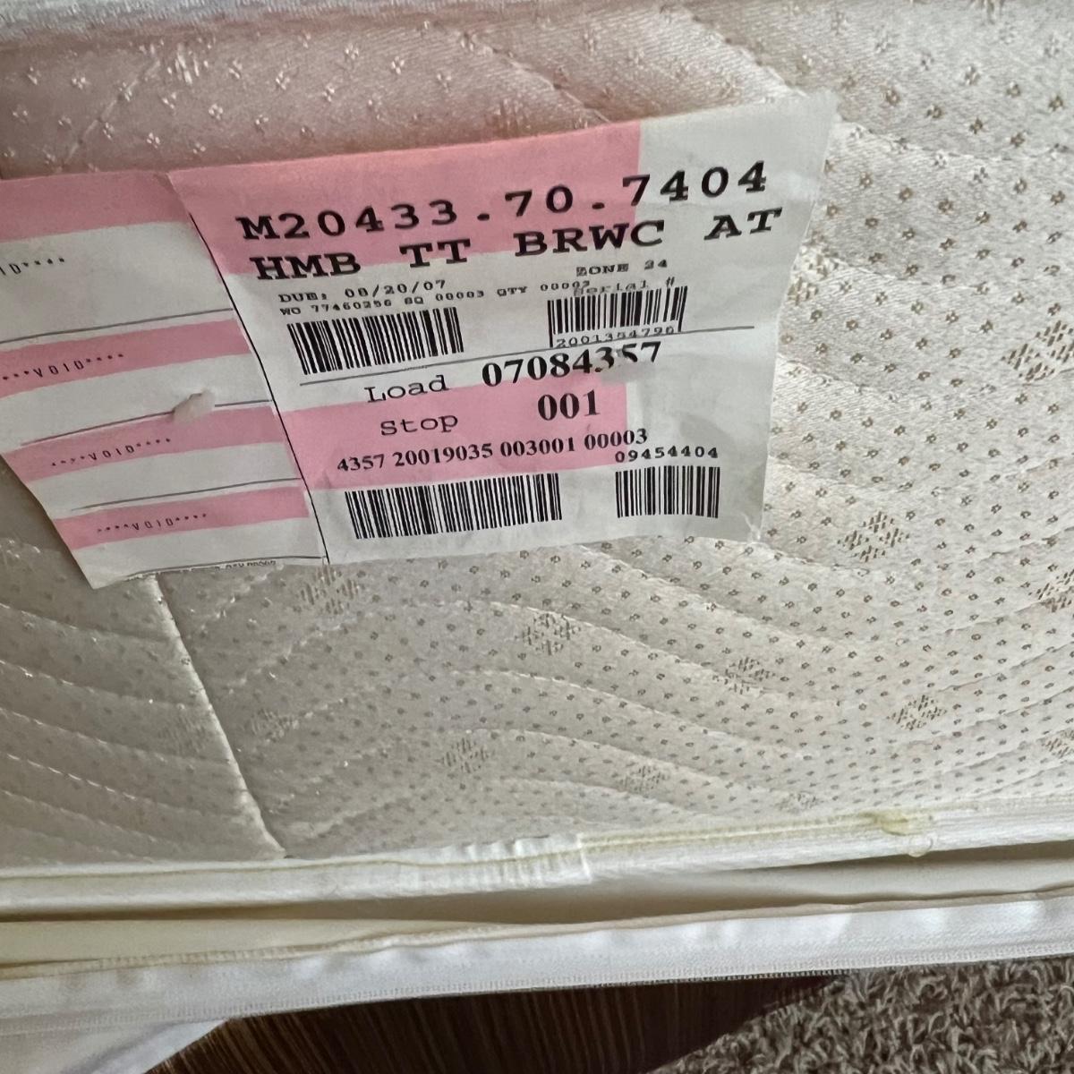 Bedding set includes comforter, bed skirt and various accent pillows. A green wool like blanket and tan flat and fitted sheet also included. Pillow inserts included. A queen bed frame also includes bed risers. Simmons mattress and box spring are available to the winning bidder if desired.
