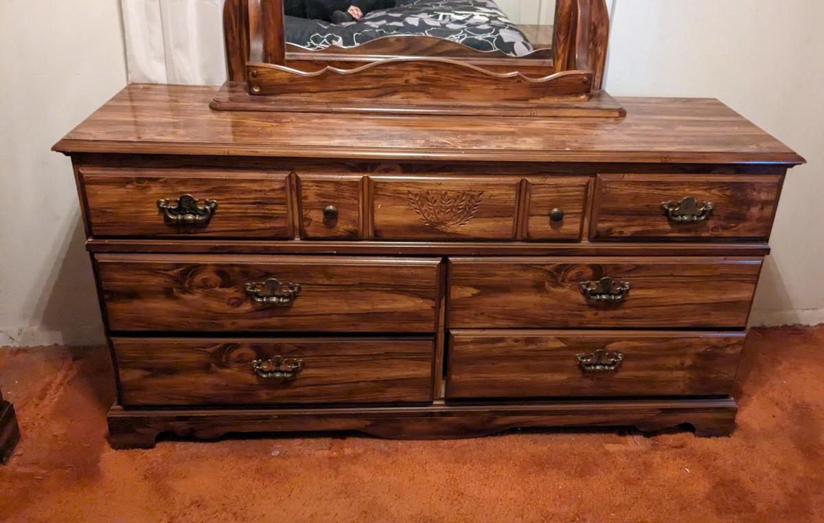 includes 32"x 18"x 42.5" (4) drawer dresser, 60"x 18"x 29.75" (7) drawer dresser with 37"x 42" storage base mirror, 23.75"x 14" (2) drawer nightstand and matching headboard for queen size mattress and metal frame. Full size mattress and frame are currently on bed. Nightstand shows the most wear as seen in photos. Winning bidder responsible for removal of all items. No shipping
