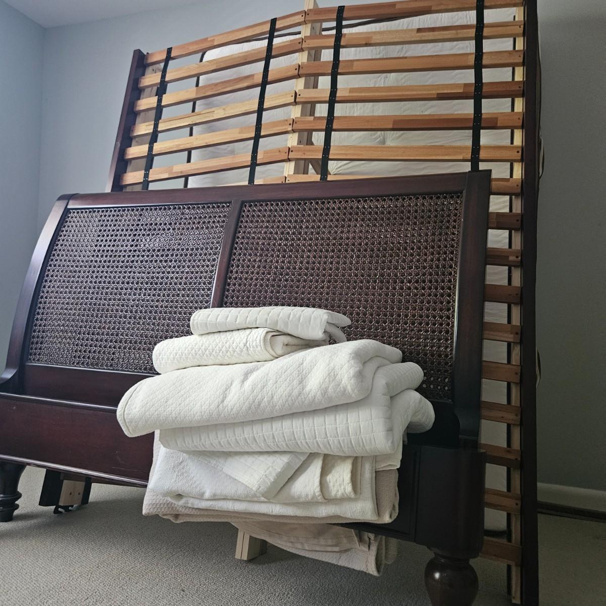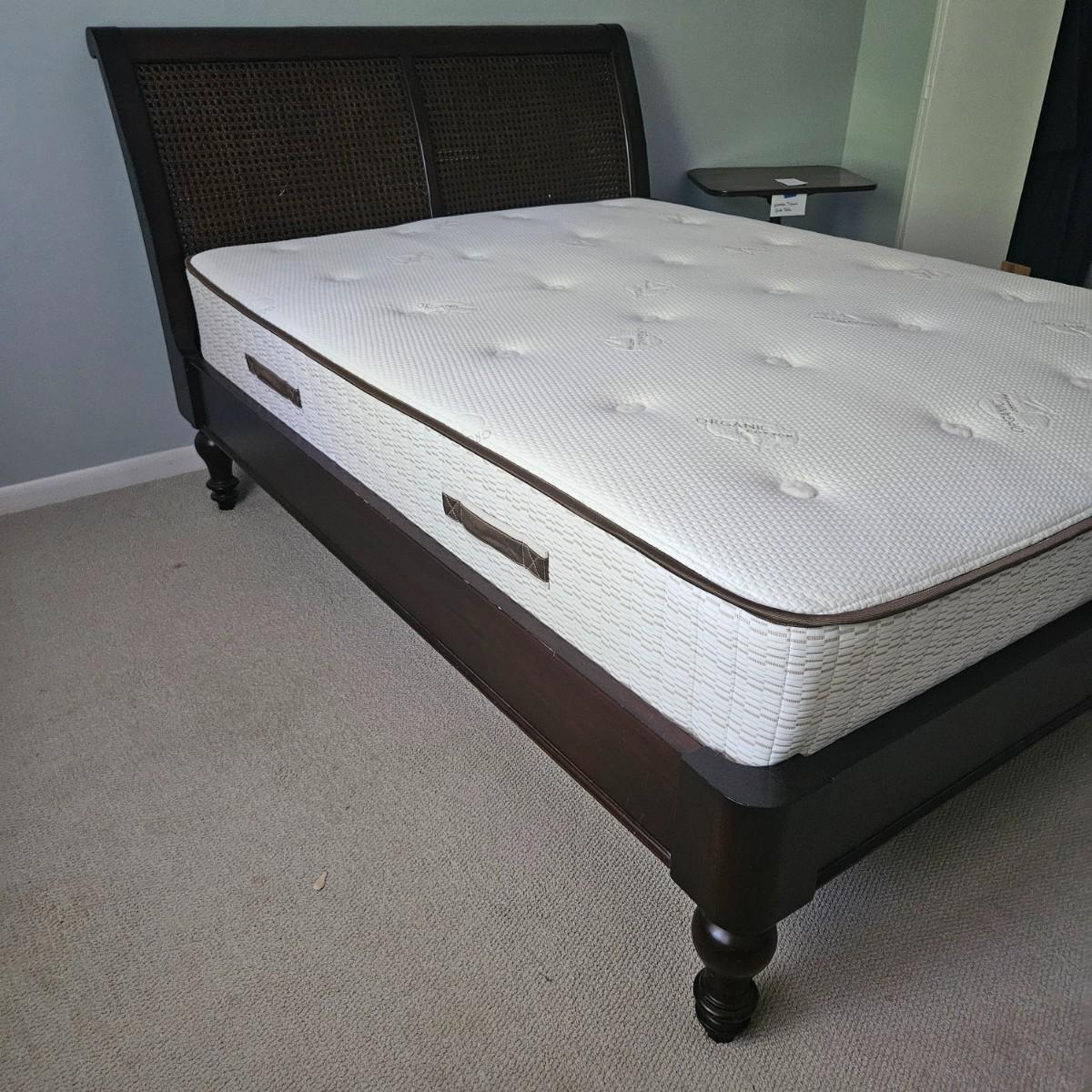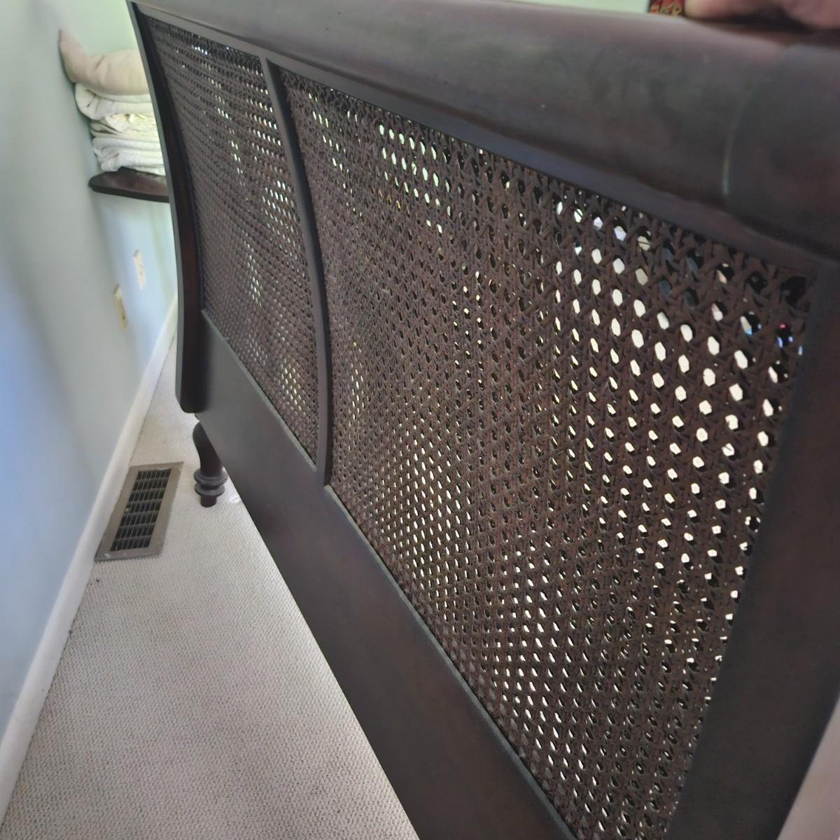 A queen size cane sleigh bed that features a dark walnut stain with a woven cane headboard. It measures approximately 64.5" x 93" x 48"H. Also included in this lot is an assortment of queen size blankets and shams. There is a small black marker stain on the quilt - see picture included. The mattress is available to the winning bidder if desired, but the winning bidder is not required to take it. Local pickup only. Winning bidder must bring assistance to help move and load this item due to its weight and/or size.