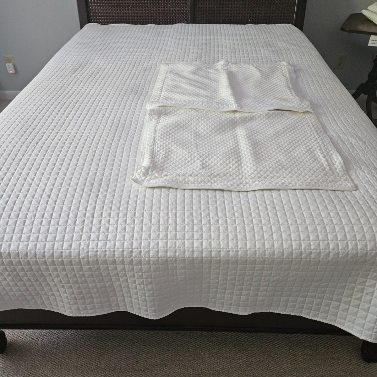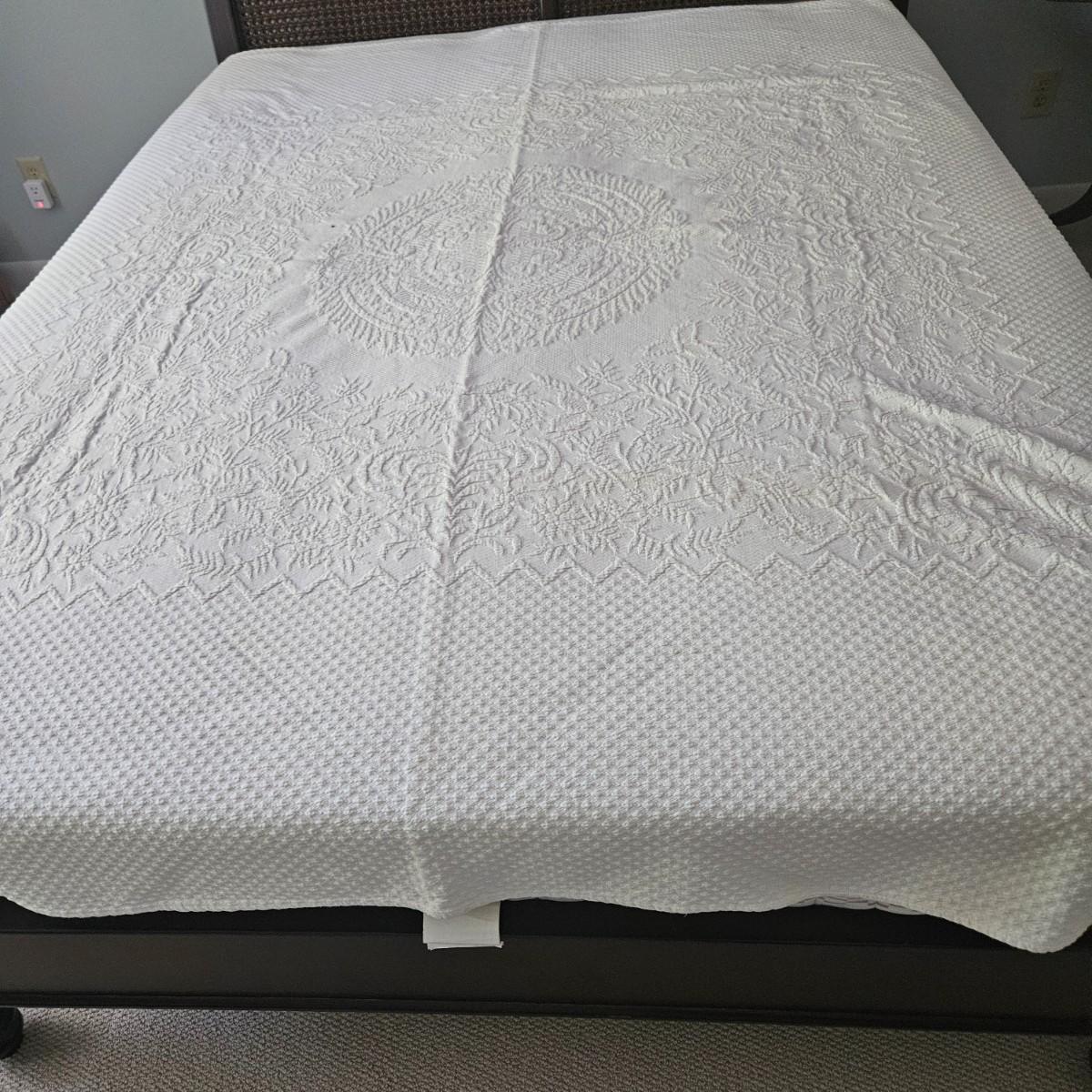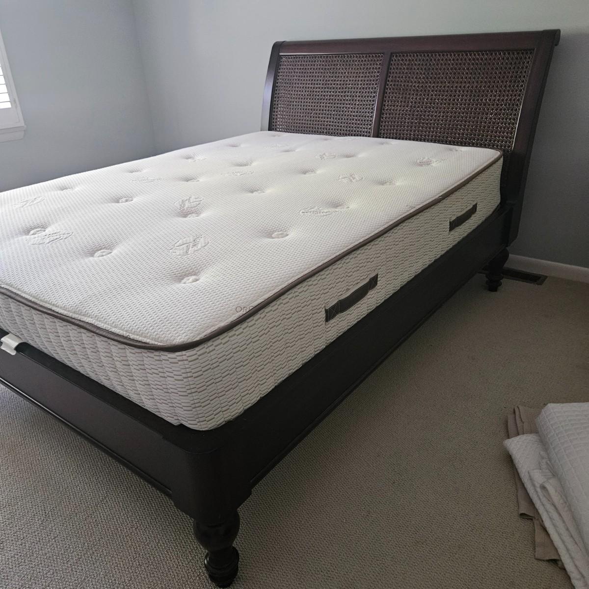 A queen size cane sleigh bed that features a dark walnut stain with a woven cane headboard. It measures approximately 64.5" x 93" x 48"H. Also included in this lot is an assortment of queen size blankets and shams. There is a small black marker stain on the quilt - see picture included. The mattress is available to the winning bidder if desired, but the winning bidder is not required to take it. Local pickup only. Winning bidder must bring assistance to help move and load this item due to its weight and/or size.