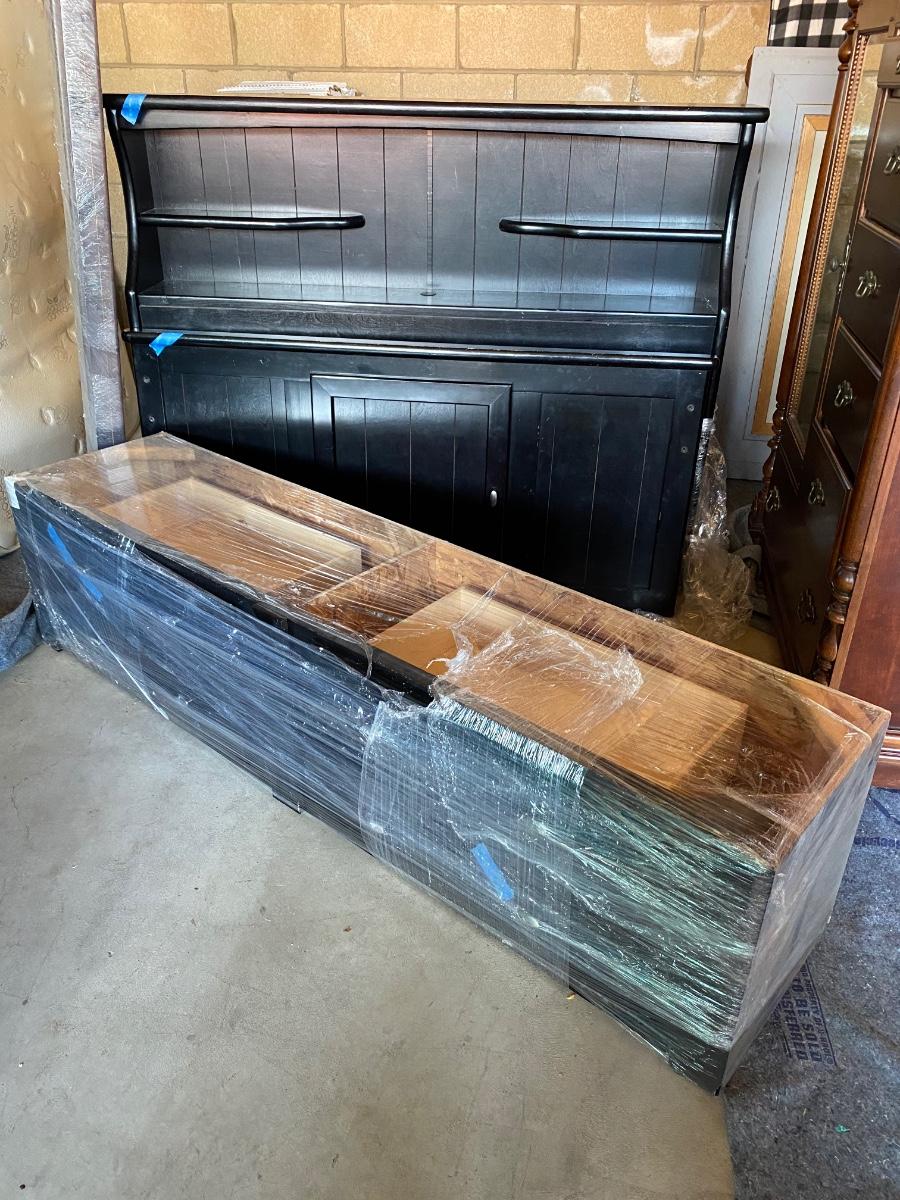 Queen Size Captains Bed Frame Black Wood with Drawers on One Side. Includes headboard, footboard, siderails, set of drawers, and cross slats. Four drawers for extra storage on one side open space on the other for larger items. Headboard has cord access spot for charger cords and accessories. In good condition. Light wear.