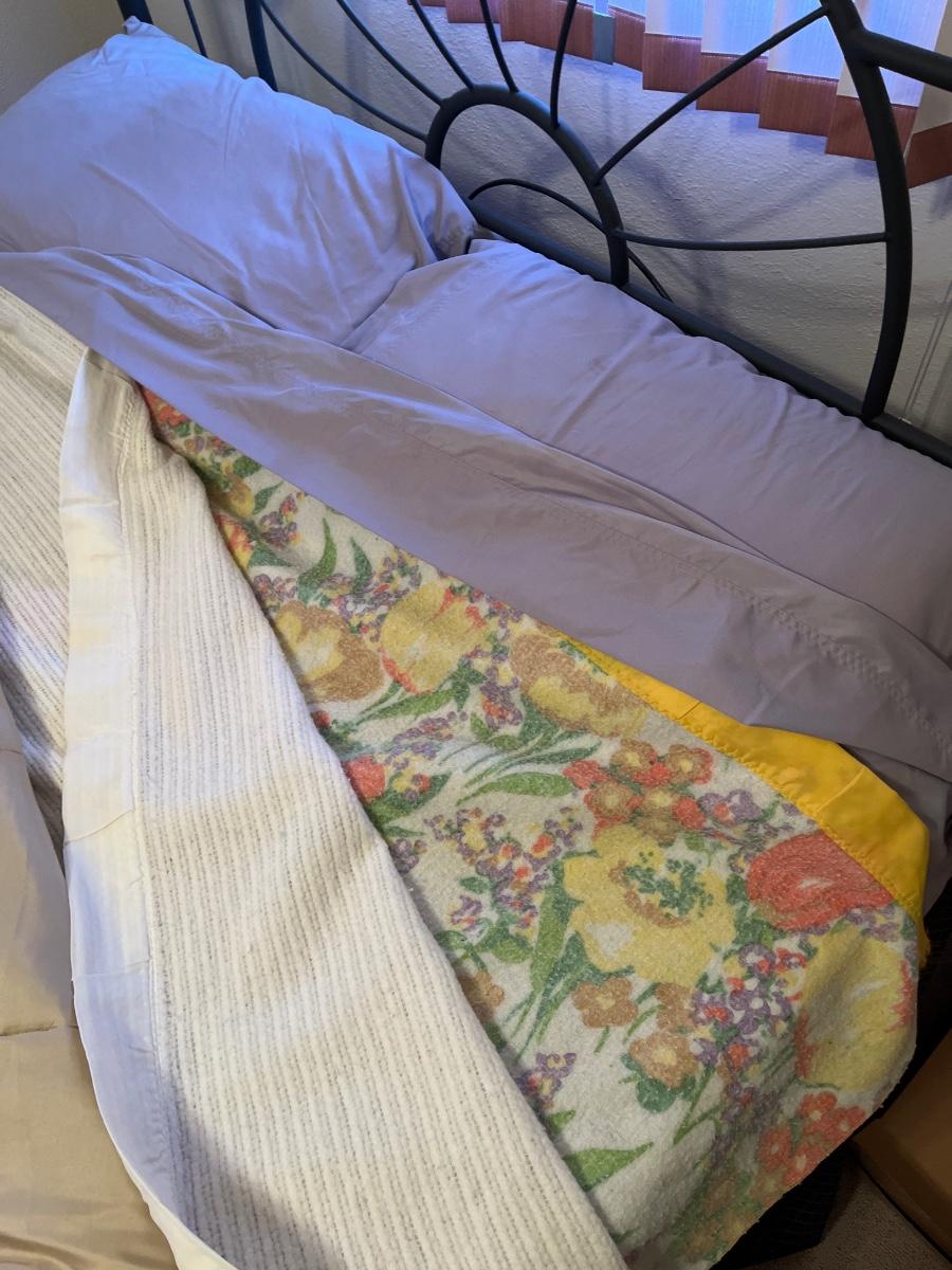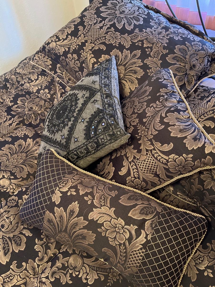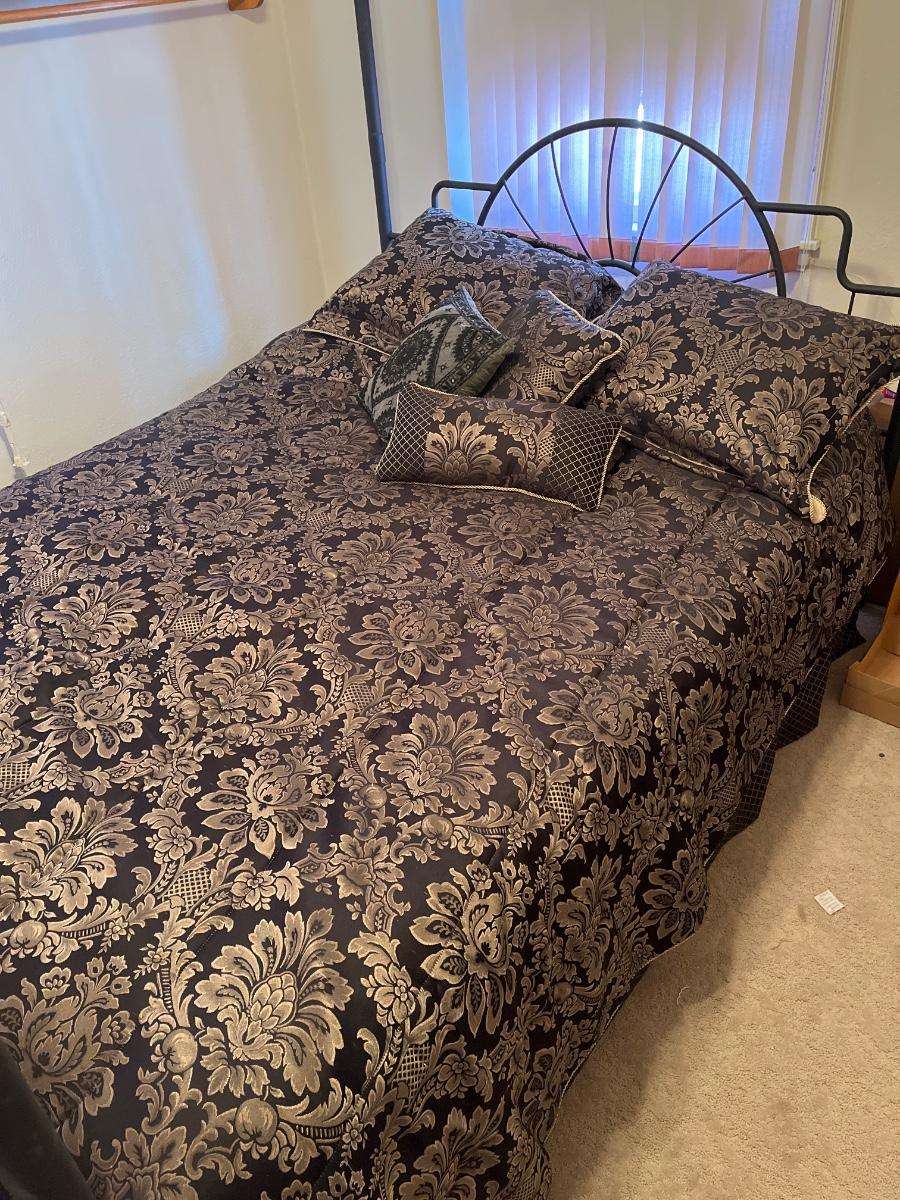 Queen size comforter, pillows, dust ruffle, blankets and sheets