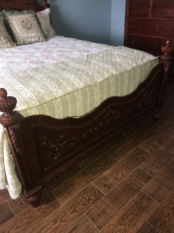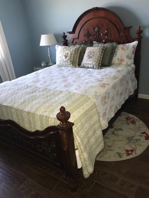 Quilted cotton coverlet and matching queen shams. Quilted queen size complimentary fir foot of bed. Two needlepoint pillows. Two green pillows with fringe.